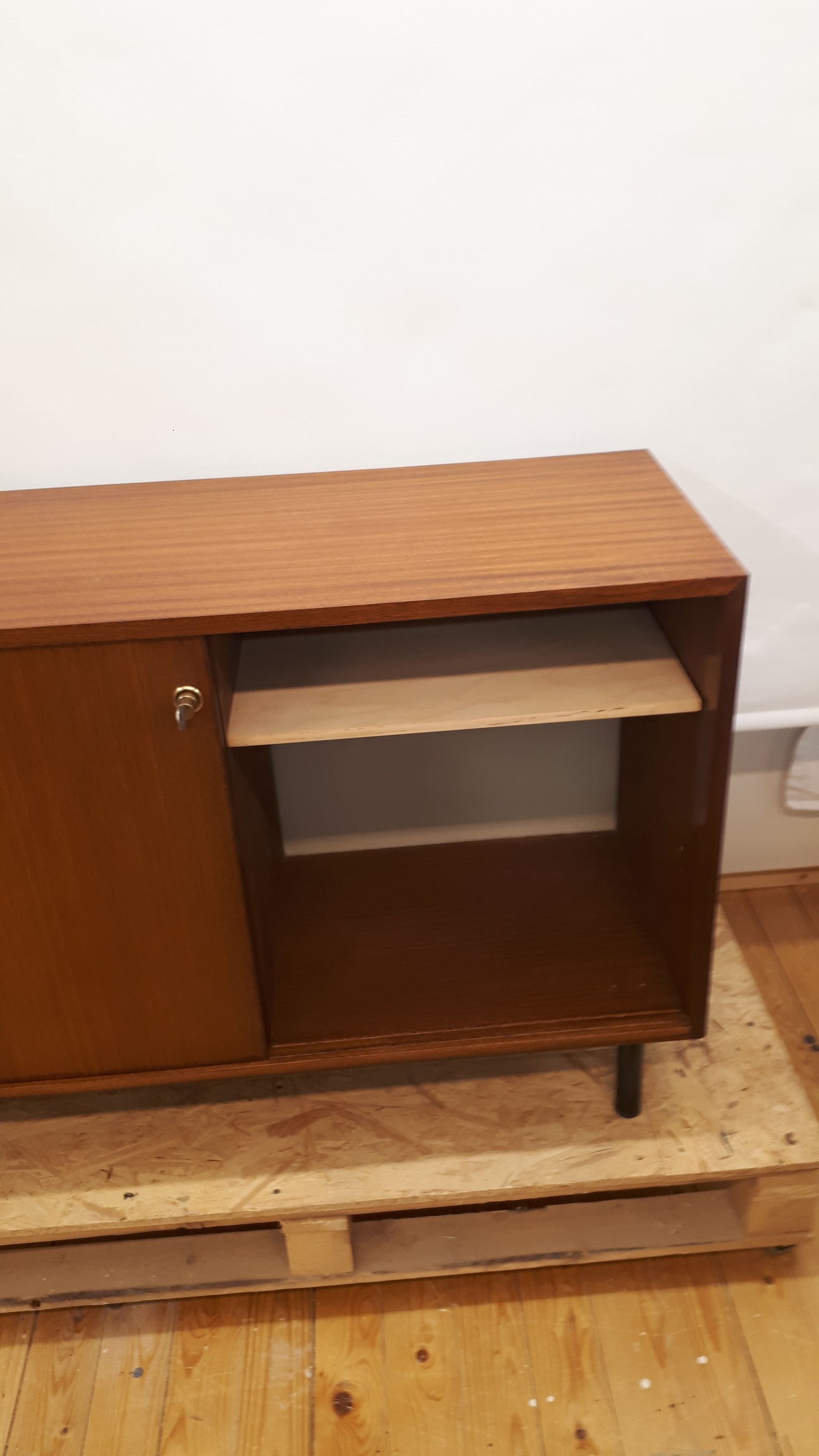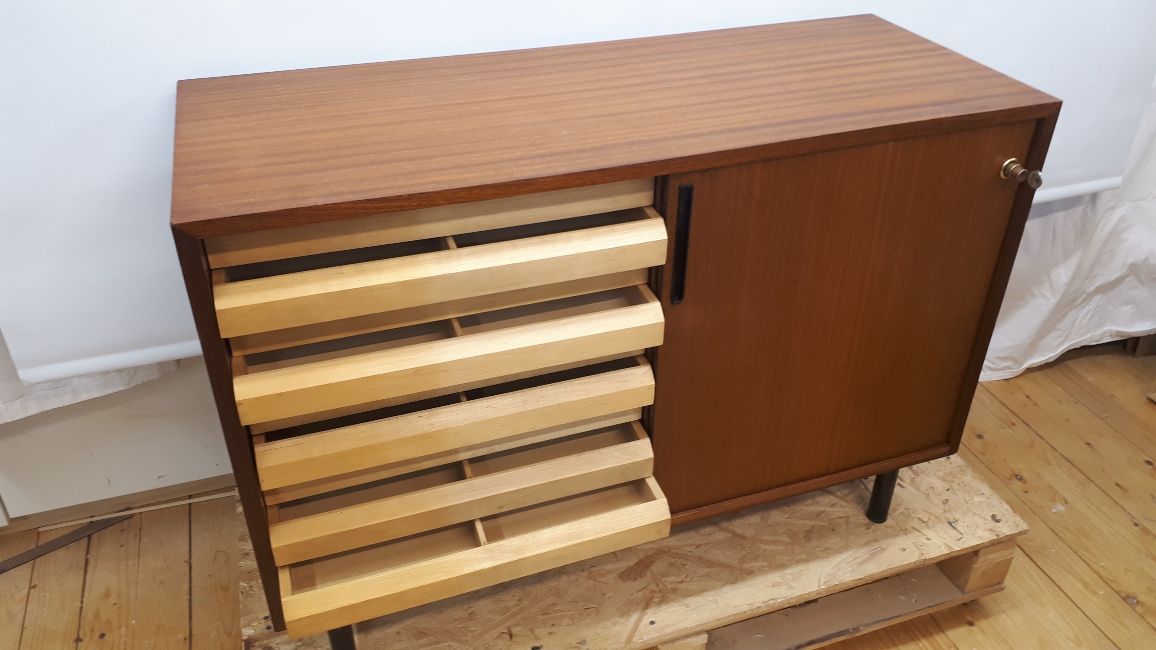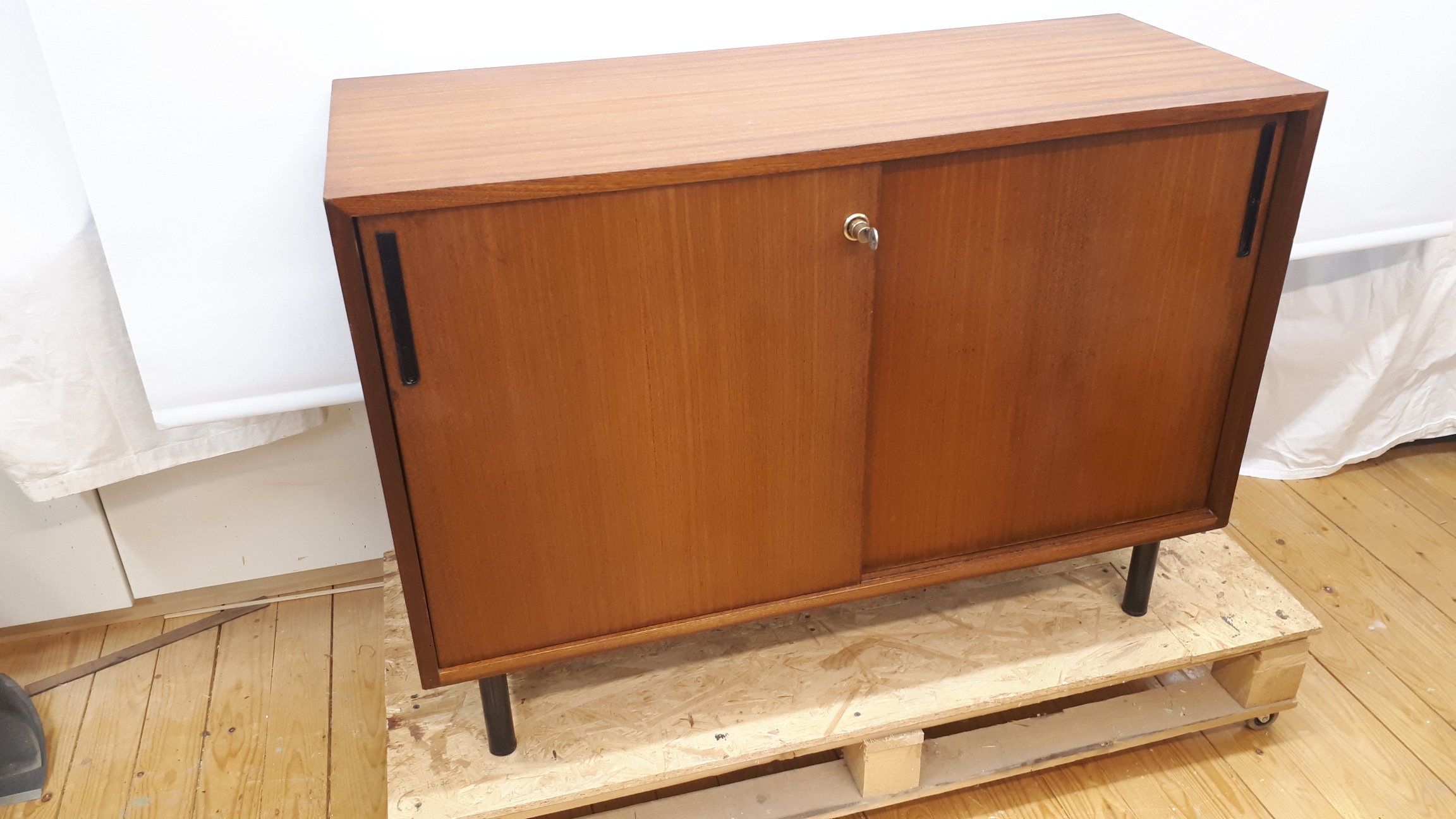 Kunnostettu liukuovellinen teak-senkki 60-luvun lopulta. Vasemmassa kaapissa on yhdeksän vetolaatikkoa ja oikeassa yksi hylly. Kaikki ulkopinnat on kunnostettu. Sisäpuolen näkyvät viilupinnat on öljytty. Kansi ja sivut ovat siistit ja ehjät. Vasemman liukuoven yläreunassa kahvan vieressä on korjattu kuluma (1x2cm) ja oikeassa ovessa on keskellä lähes huomaamaton tummentuma. Molemmista ovenkahvoista puuttuu alakulmista pieni pala (1x1mm). Mustat, kunnostetut metallijalat. Lukko toimii ja lukkoon on avain.