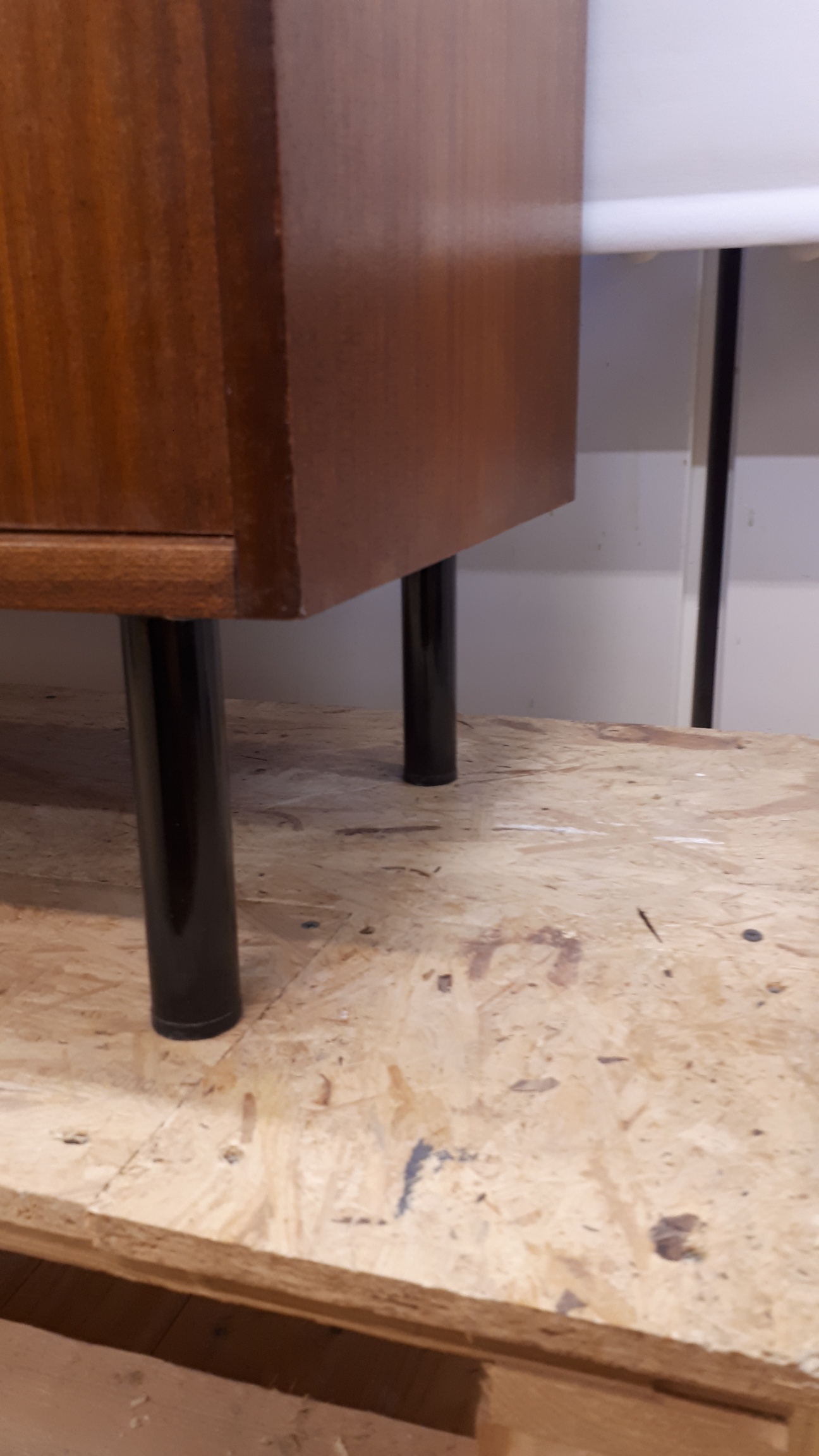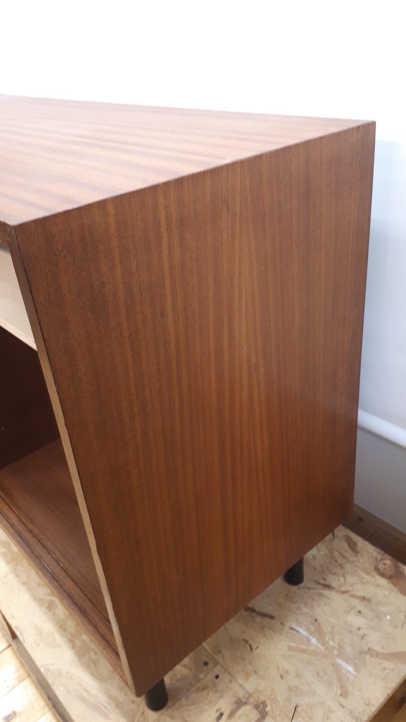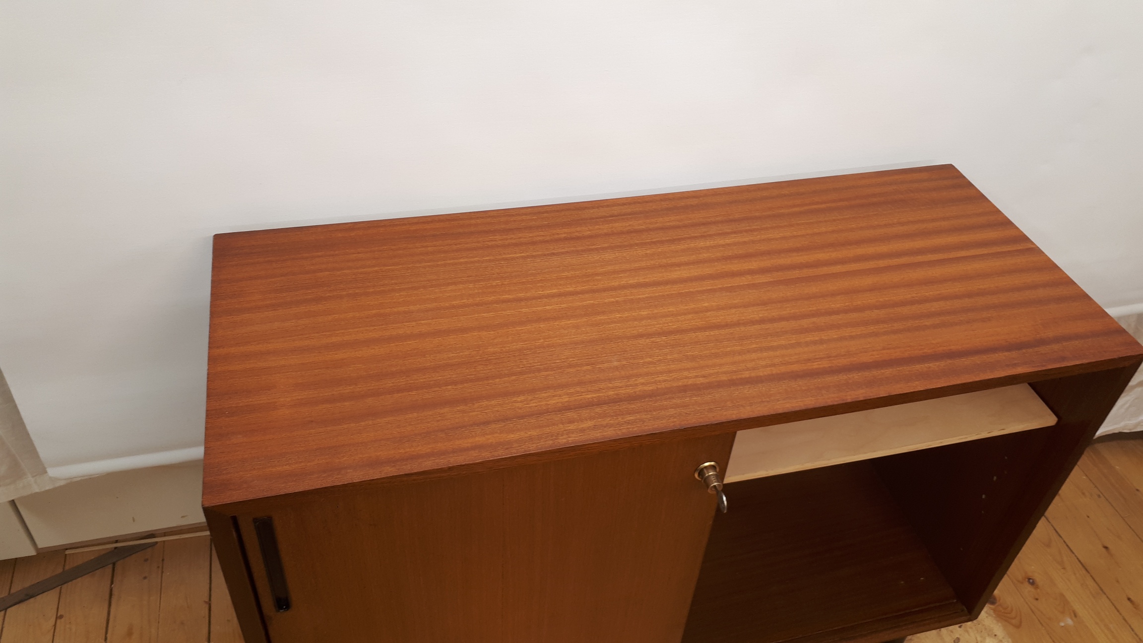 Kunnostettu liukuovellinen teak-senkki 60-luvun lopulta. Vasemmassa kaapissa on yhdeksän vetolaatikkoa ja oikeassa yksi hylly. Kaikki ulkopinnat on kunnostettu. Sisäpuolen näkyvät viilupinnat on öljytty. Kansi ja sivut ovat siistit ja ehjät. Vasemman liukuoven yläreunassa kahvan vieressä on korjattu kuluma (1x2cm) ja oikeassa ovessa on keskellä lähes huomaamaton tummentuma. Molemmista ovenkahvoista puuttuu alakulmista pieni pala (1x1mm). Mustat, kunnostetut metallijalat. Lukko toimii ja lukkoon on avain.