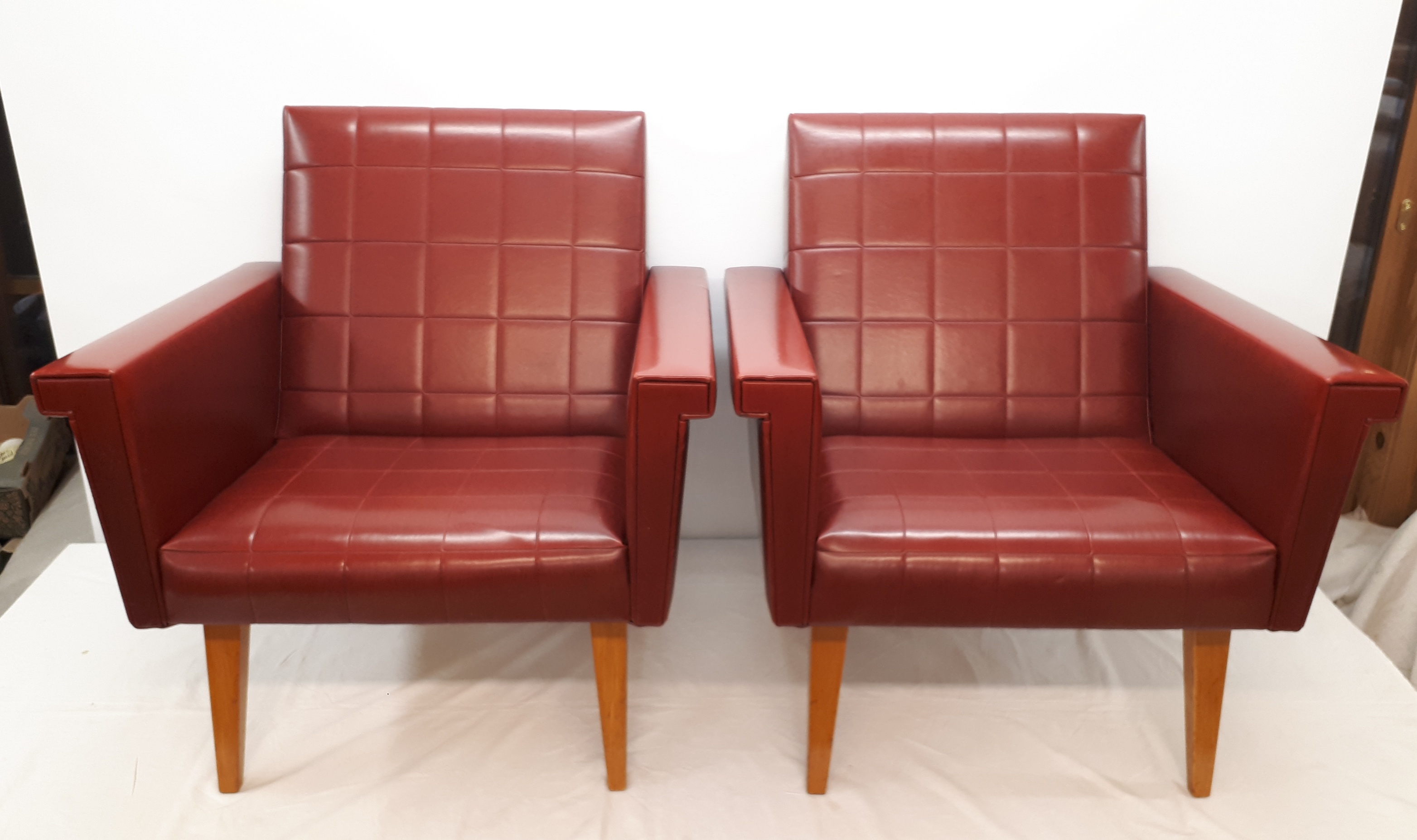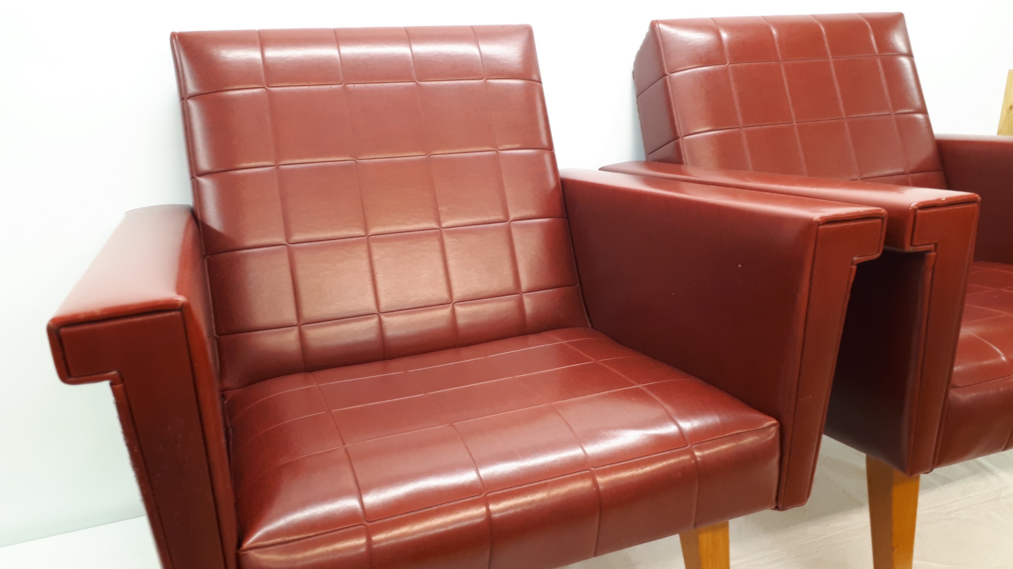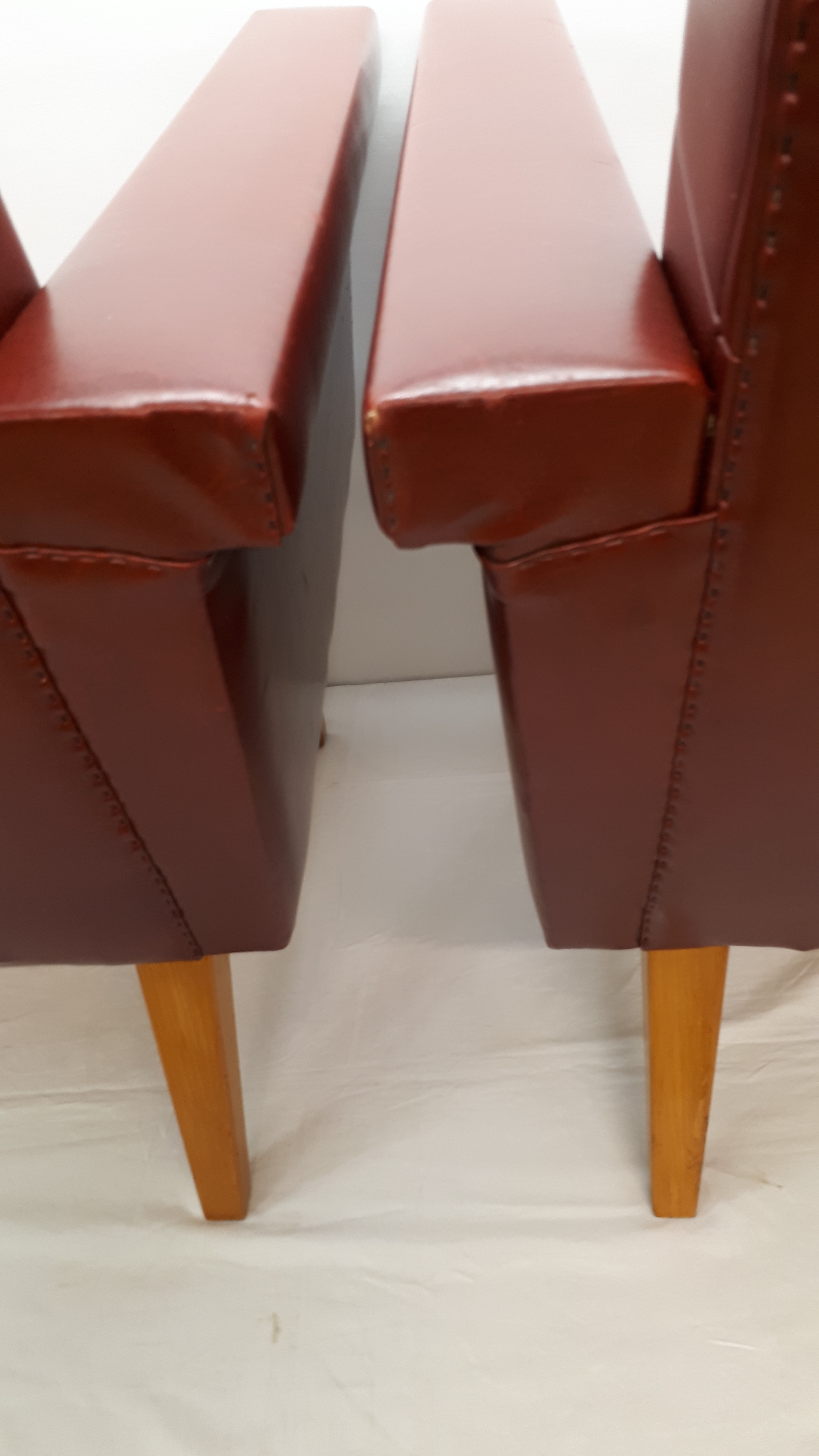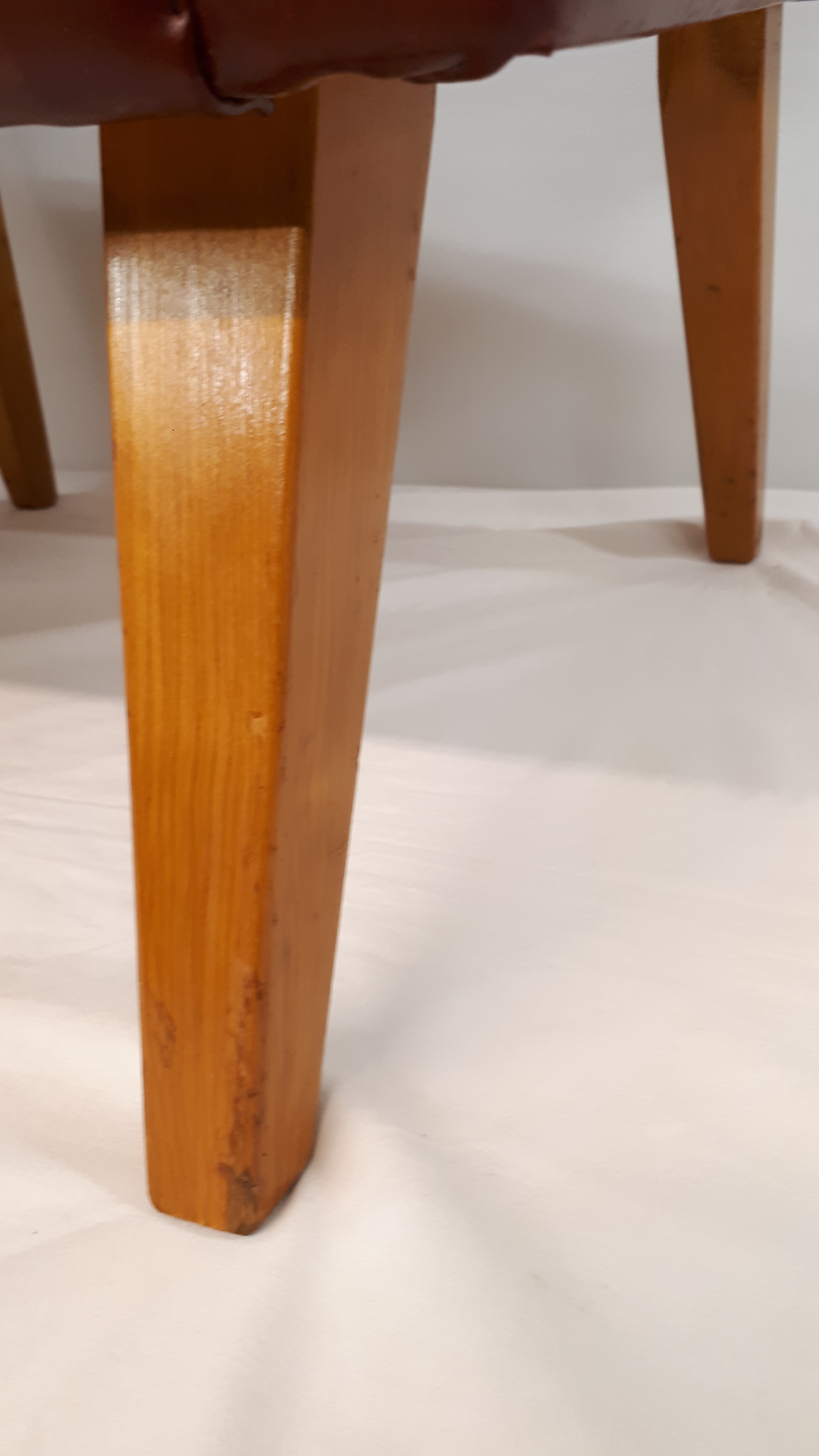 Kunnostetut viininpunaiset kerninojatuolit. Tuolien kernipinnat on huolellisesti syväpuhdistettu ja koivupuiset jalat on pintakäsitelty jättäen niihin hieman patinaa. Tuolien kernipinta on ikäisekseen hyvässä kunnossa ja yleisilmeeltään kernipinta on siisti, puhdas ja kiitävä. Pinnoissa on toki joitakin iän tuomia pieniä vaurioita, joista merkittävin on toisen tuoli vasemmassa alakulmassa olevat vauriot (Ilmeisesti kissan raapimia pintanaarmuja).