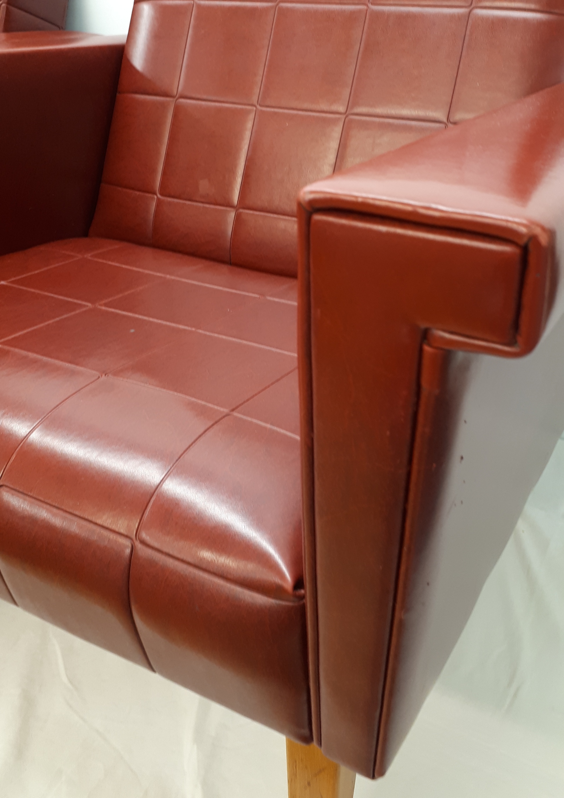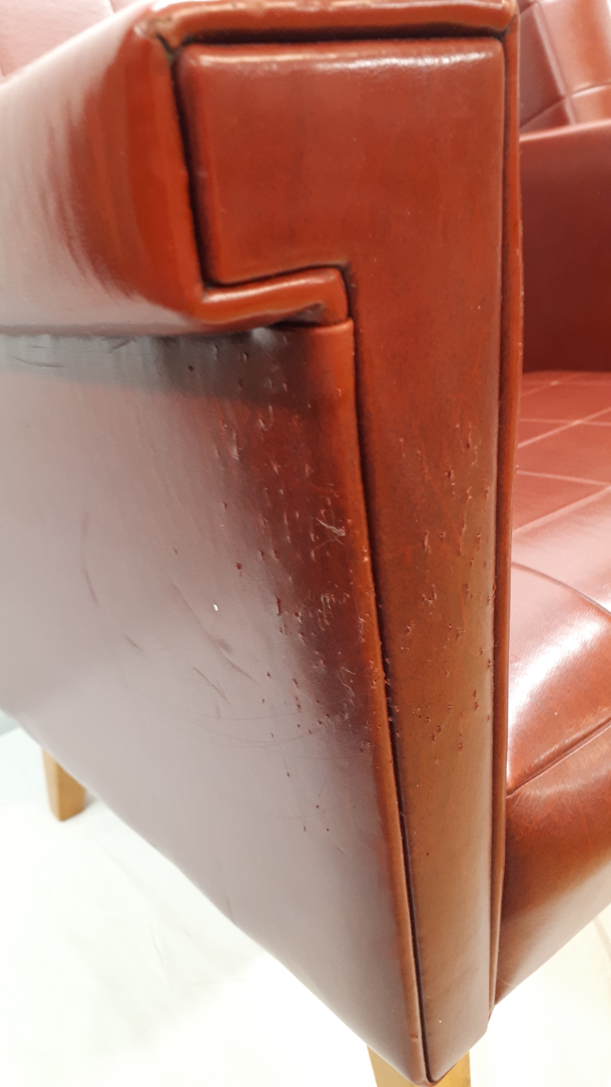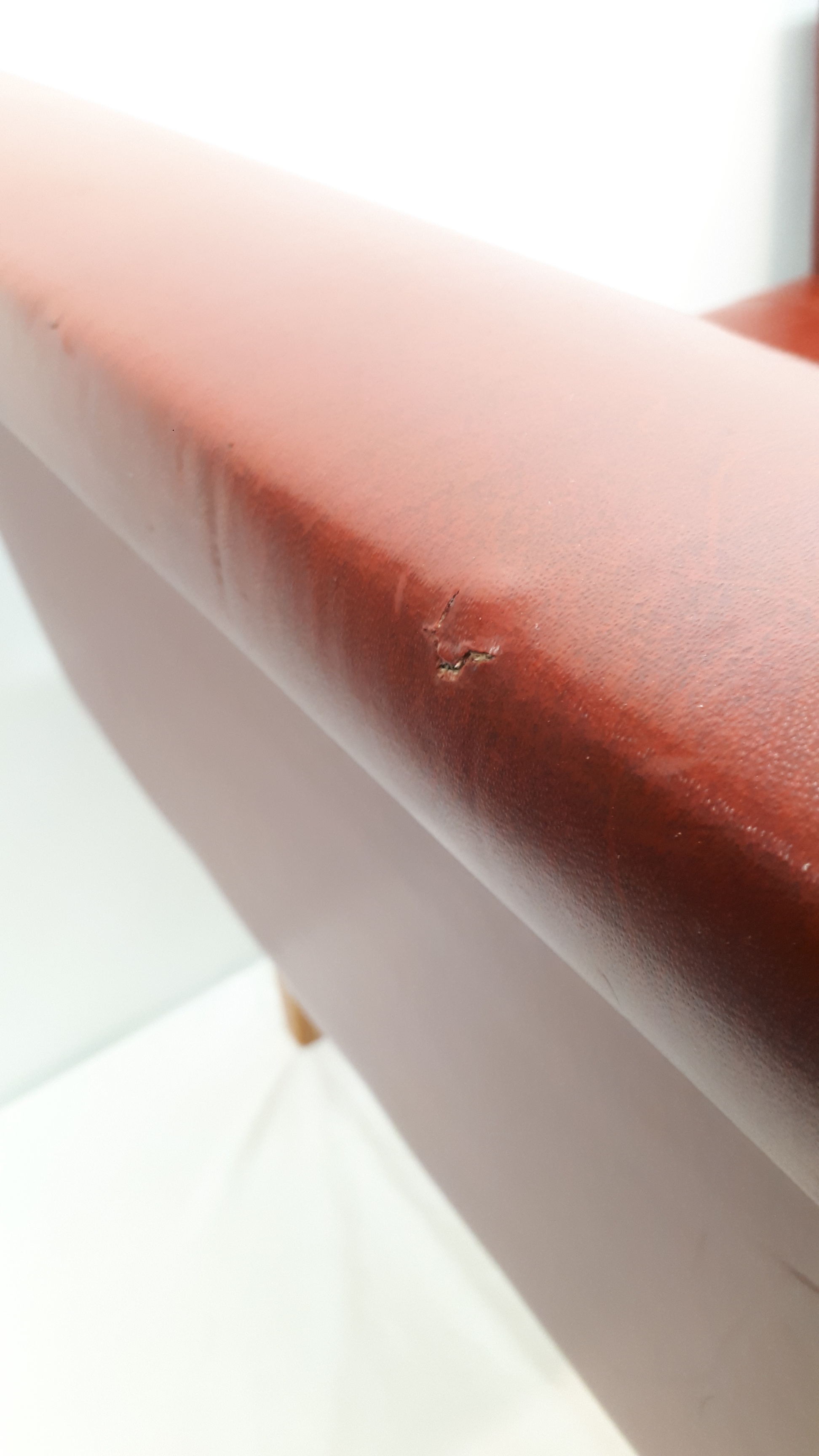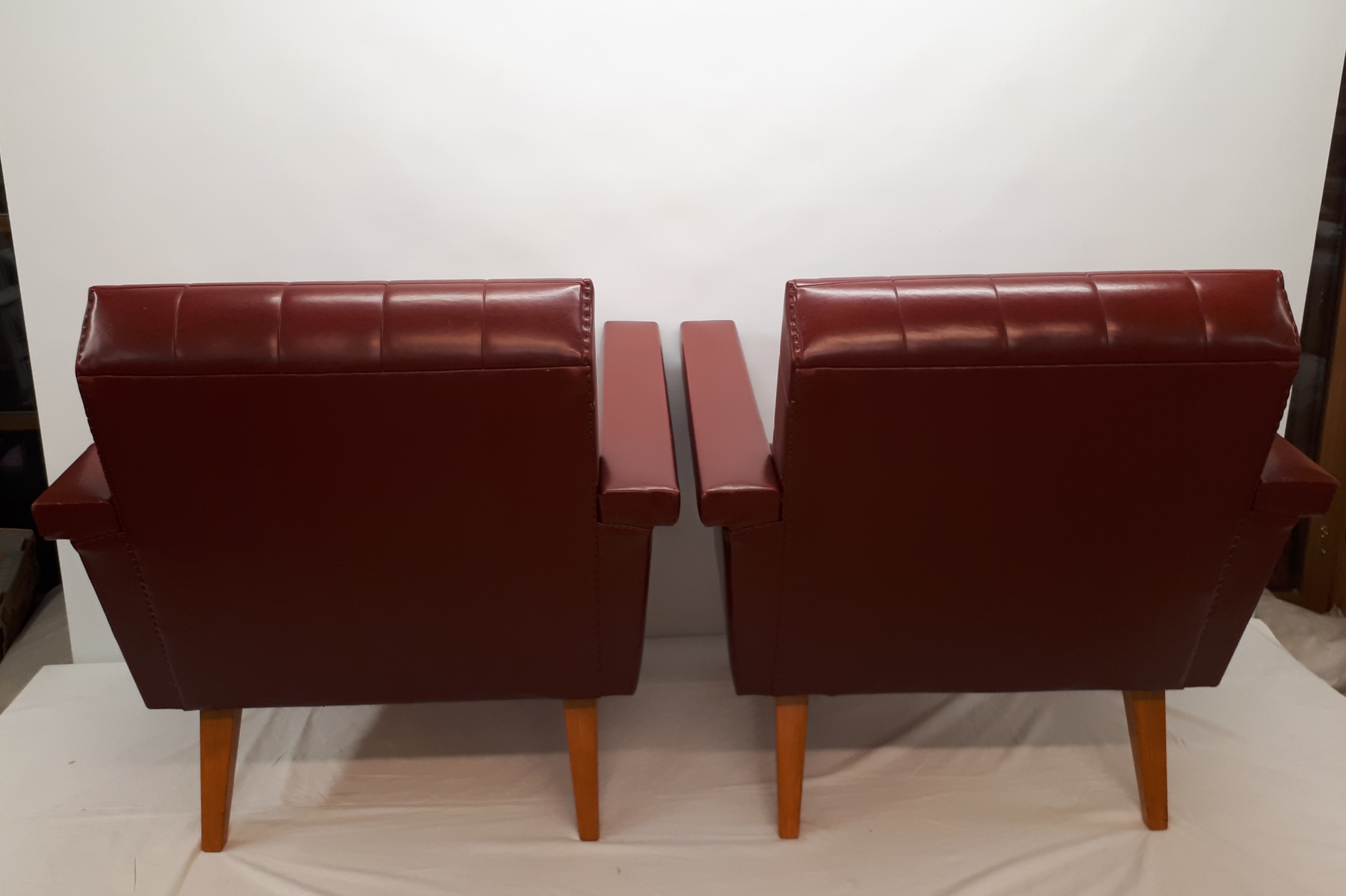 Kunnostetut viininpunaiset kerninojatuolit. Tuolien kernipinnat on huolellisesti syväpuhdistettu ja koivupuiset jalat on pintakäsitelty jättäen niihin hieman patinaa. Tuolien kernipinta on ikäisekseen hyvässä kunnossa ja yleisilmeeltään kernipinta on siisti, puhdas ja kiitävä. Pinnoissa on toki joitakin iän tuomia pieniä vaurioita, joista merkittävin on toisen tuoli vasemmassa alakulmassa olevat vauriot (Ilmeisesti kissan raapimia pintanaarmuja).