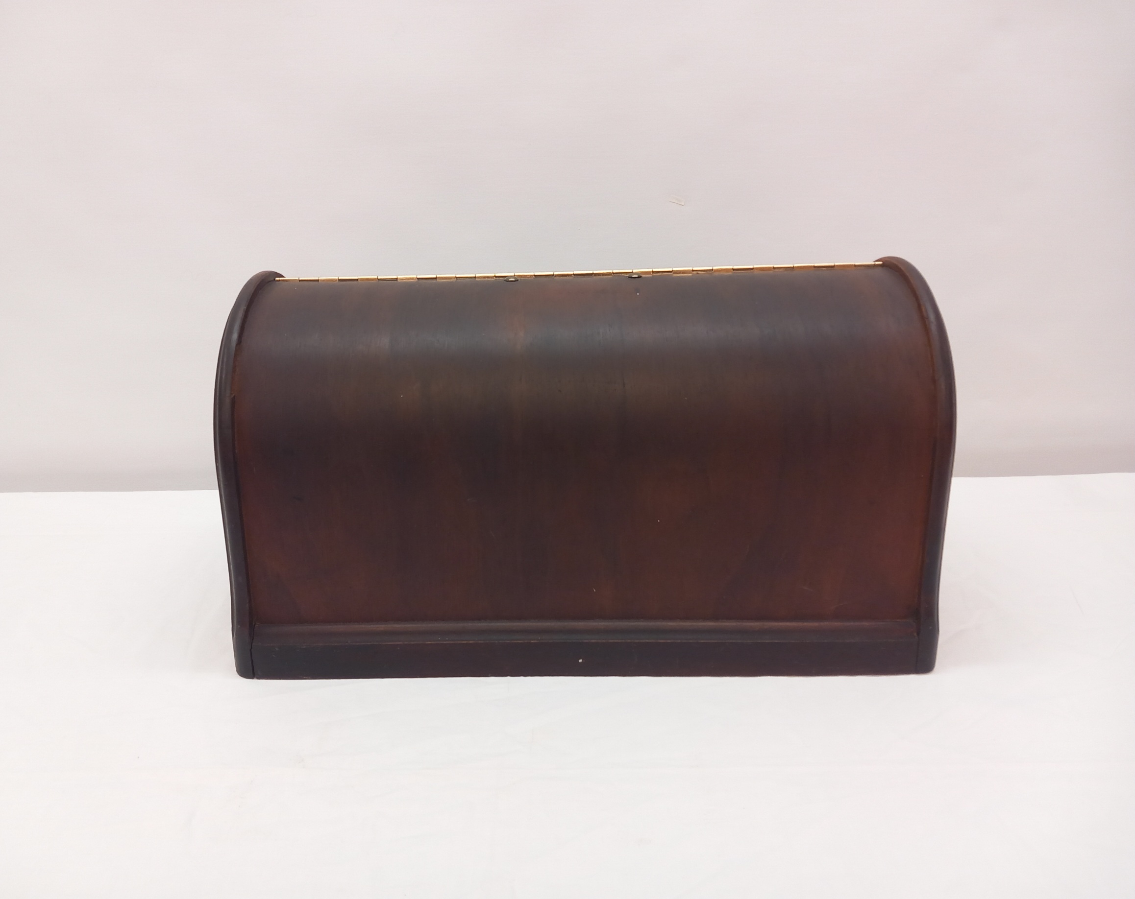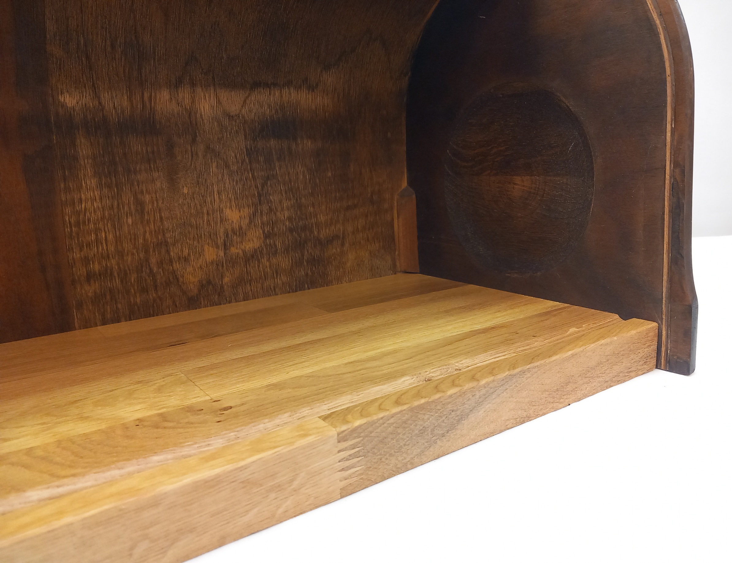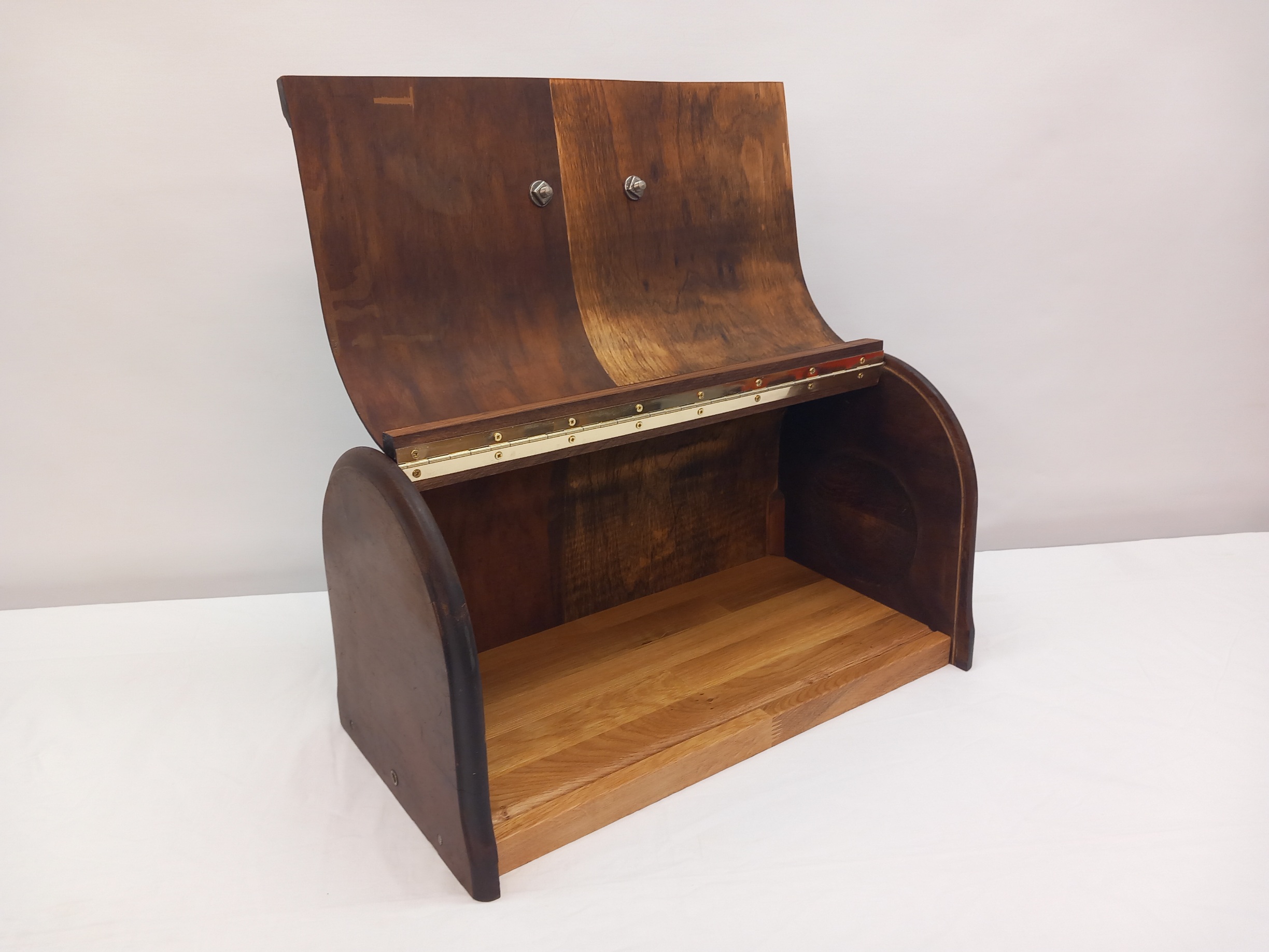 Poljettavan Singer-ompelukoneen suojakuvusta tehty leipälaatikko. Vedin ja runko ovat alkuperäisiä. Saranointi ja tammipohja on lisätty. Pohjan etureunassa on ura leivänmuruille. Laatikko on käsitelty sisältä elintarviketurvallisella parafiiniöljyllä.