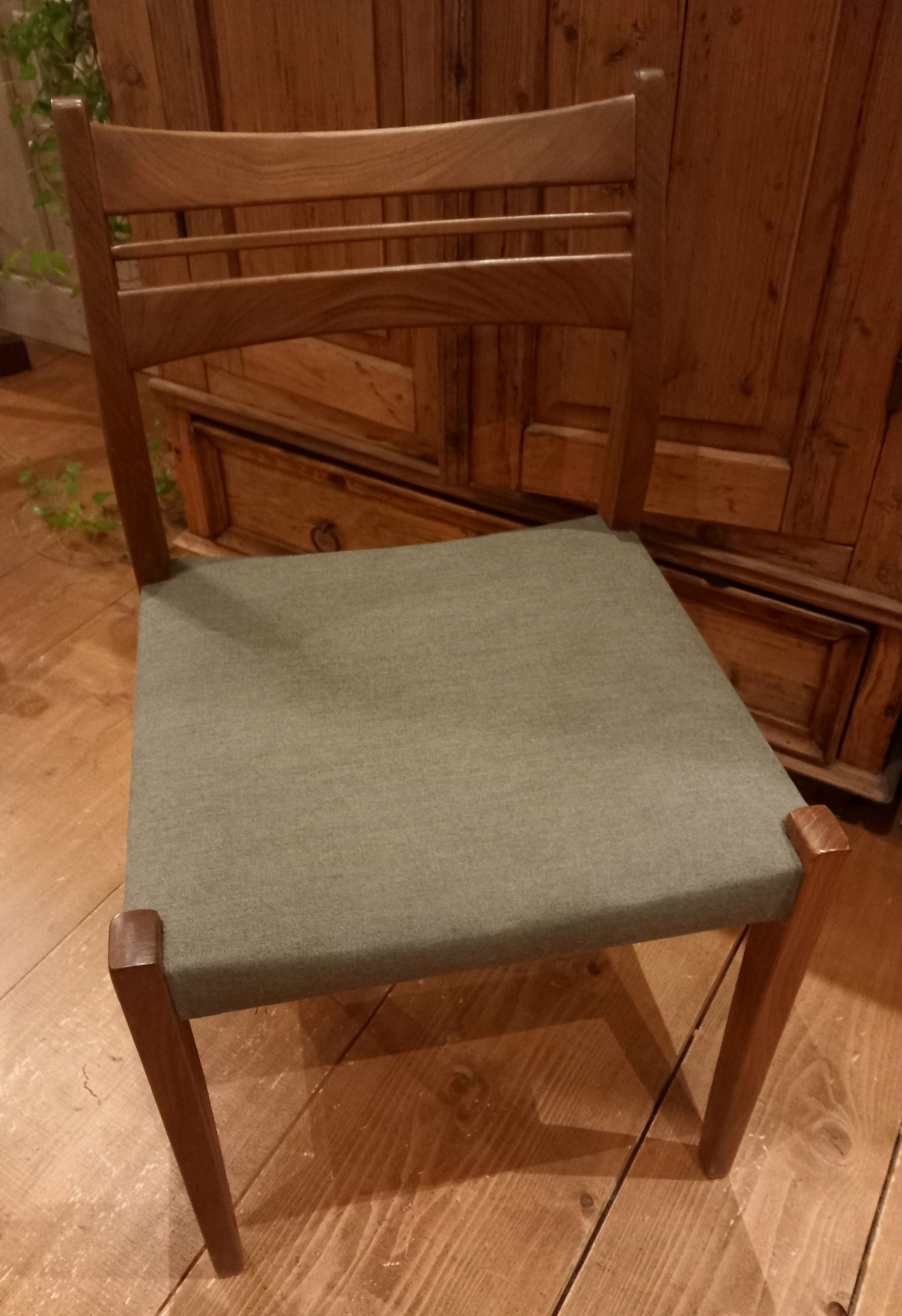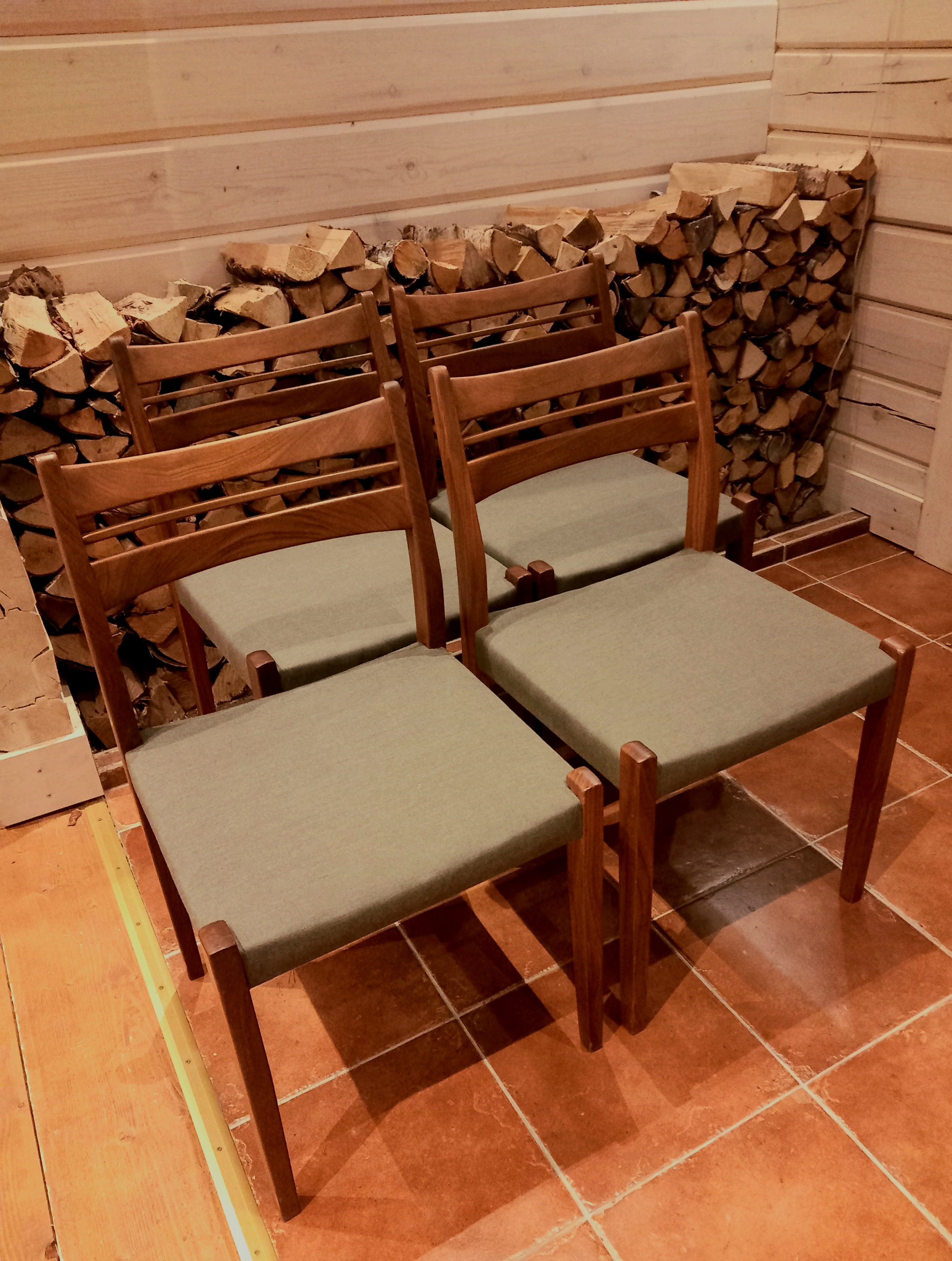 Neljä kappaletta 1960-luvun alkupuolen tiikkituoleja. Tuolit on kunnostettu: Niiden rungot ovat ikäisekseen erinomaisessa kunnossa. Kaikki liitokset ovat ehjiä ja tukevia. Tuolien verhoilu on uusittu kosteutta ja likaa hylkivällä harmaalla laadukkaalla verhoilukankaalla.