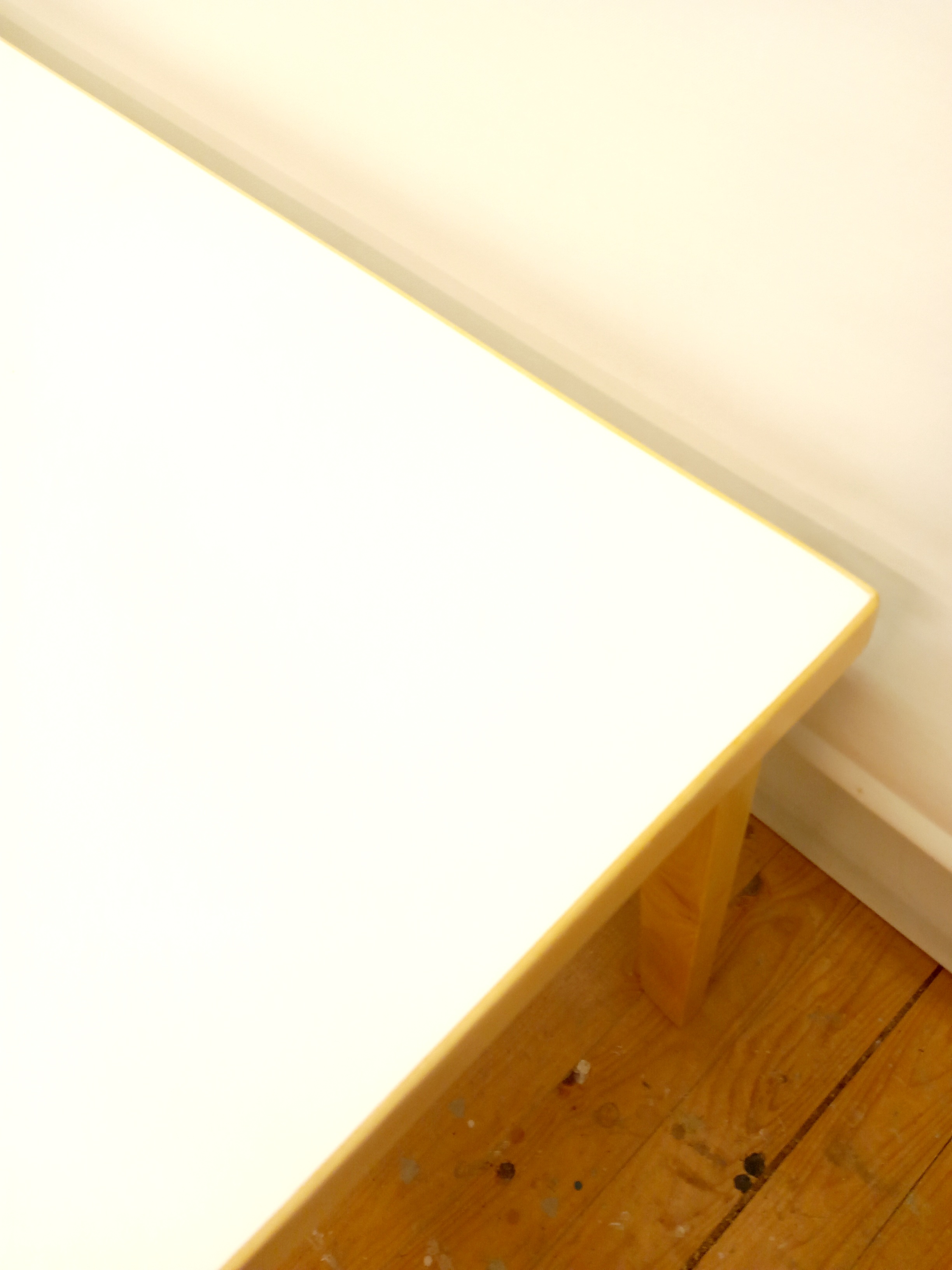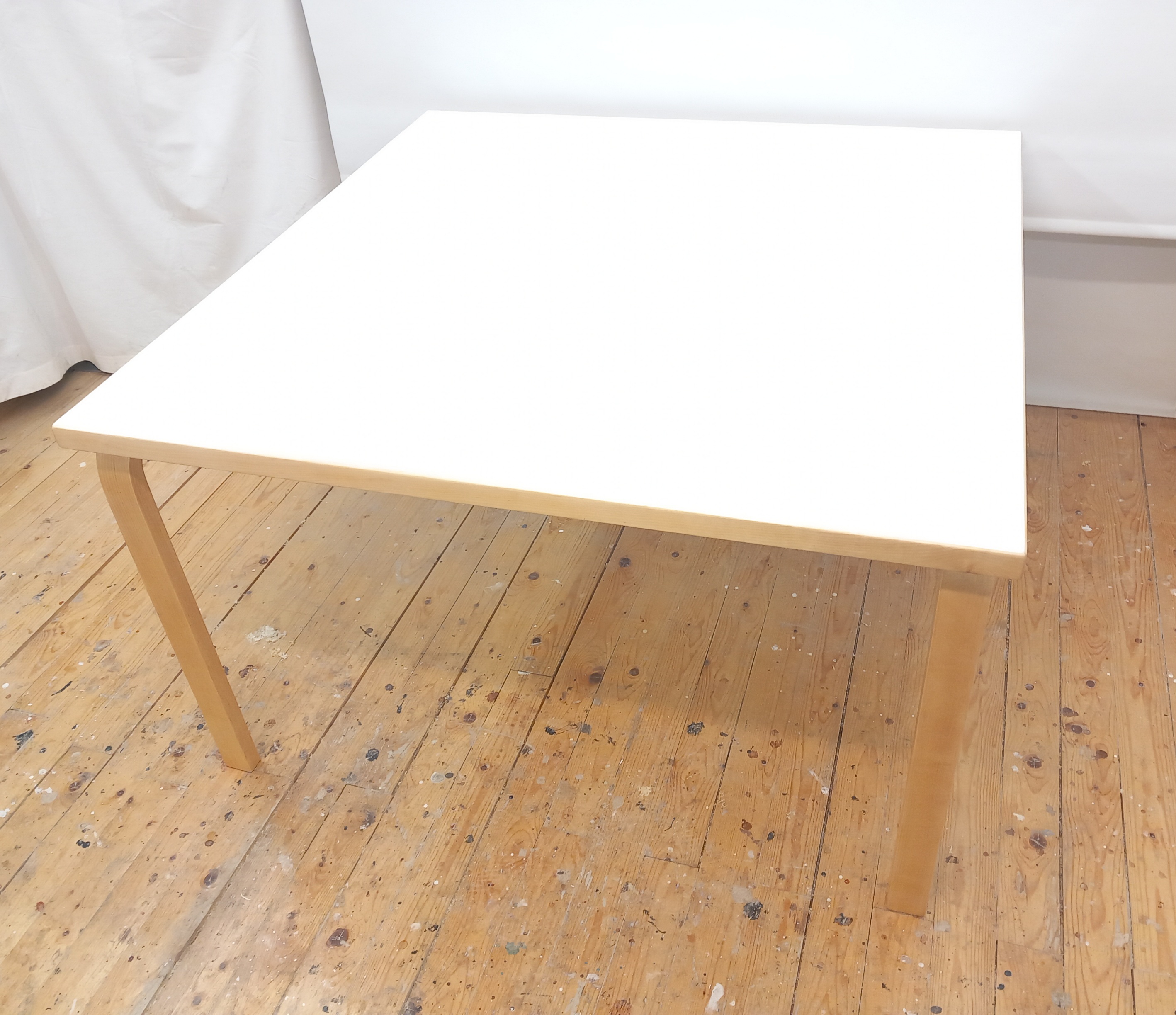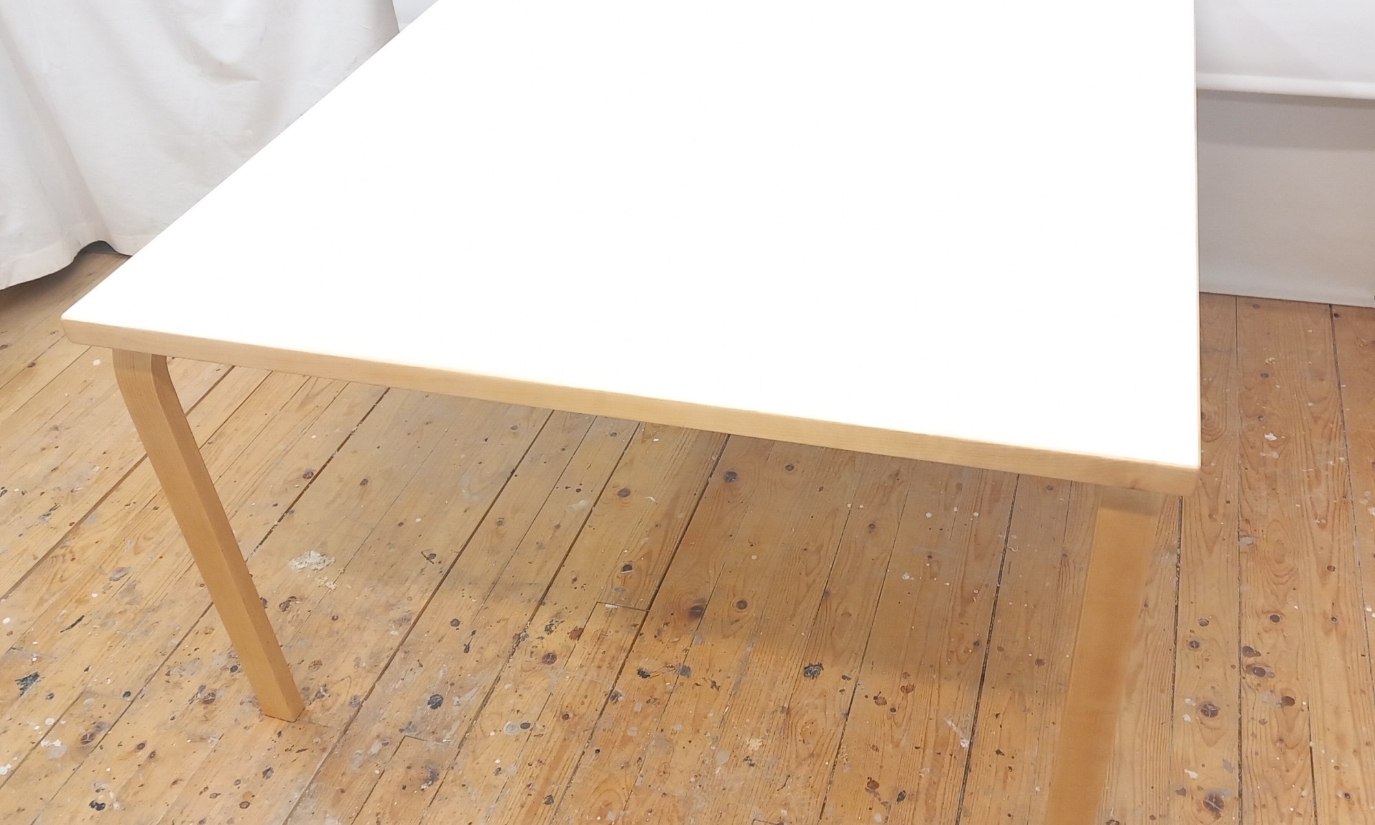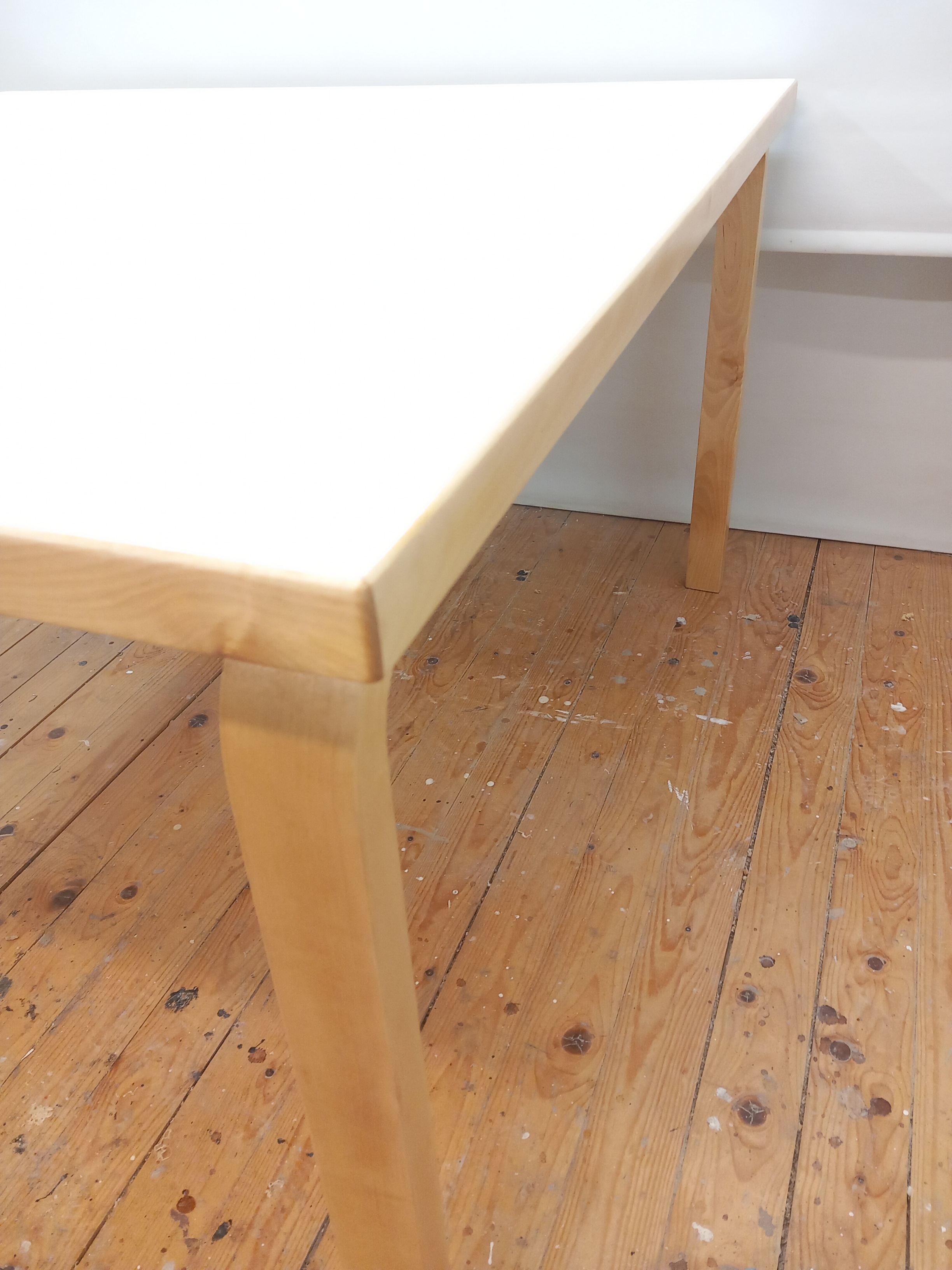 Kunnostettu Artek 84 -ruokapöytä. Pöydän pinta on hyväkuntoinen, siisti ja naarmuton. Kannen sivulistojen ja jalkojen lakkapinnat ovat ehjät ja kirkkaat. Ei kolhuja, naarmuja tai patinaa.