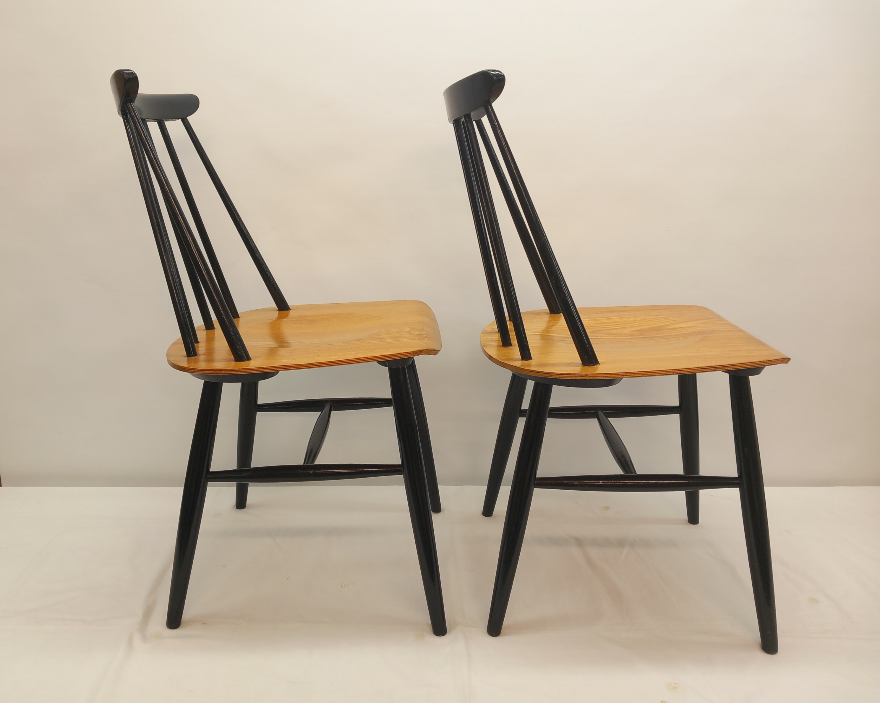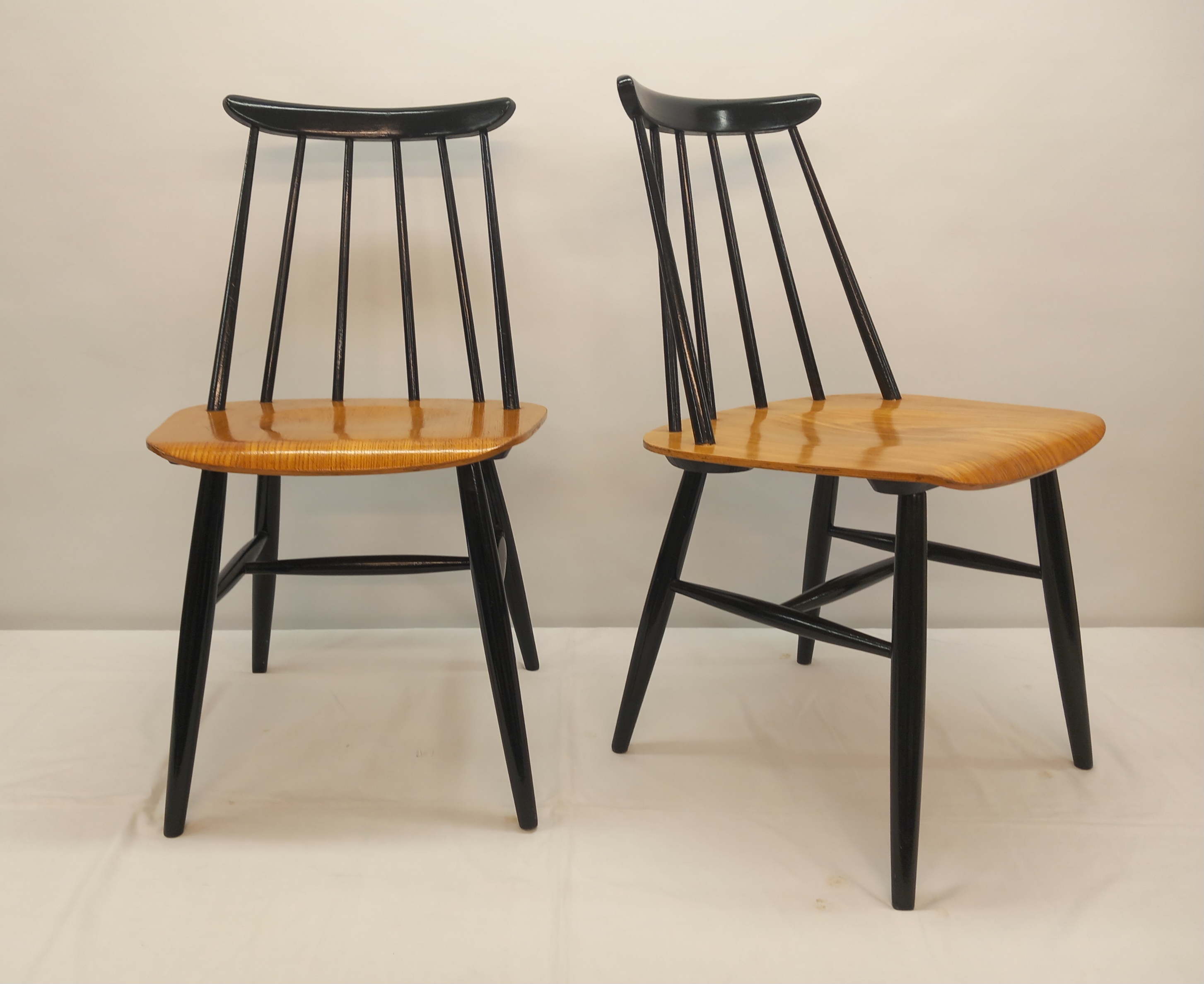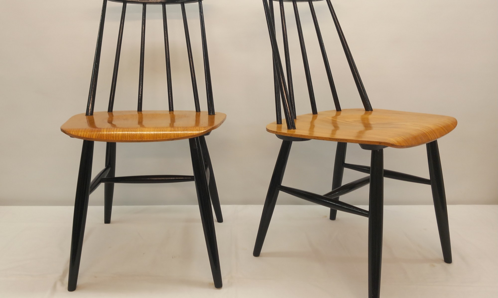 Kaksi Askon alkuperäismallista Fanett-tuolia 1950-60 -luvuilta. Kyseisessä mallissa tuolin istuinosa oli jalopuuviilua ja pinnaselkänoja sekä jalat mustaksi maalatut.