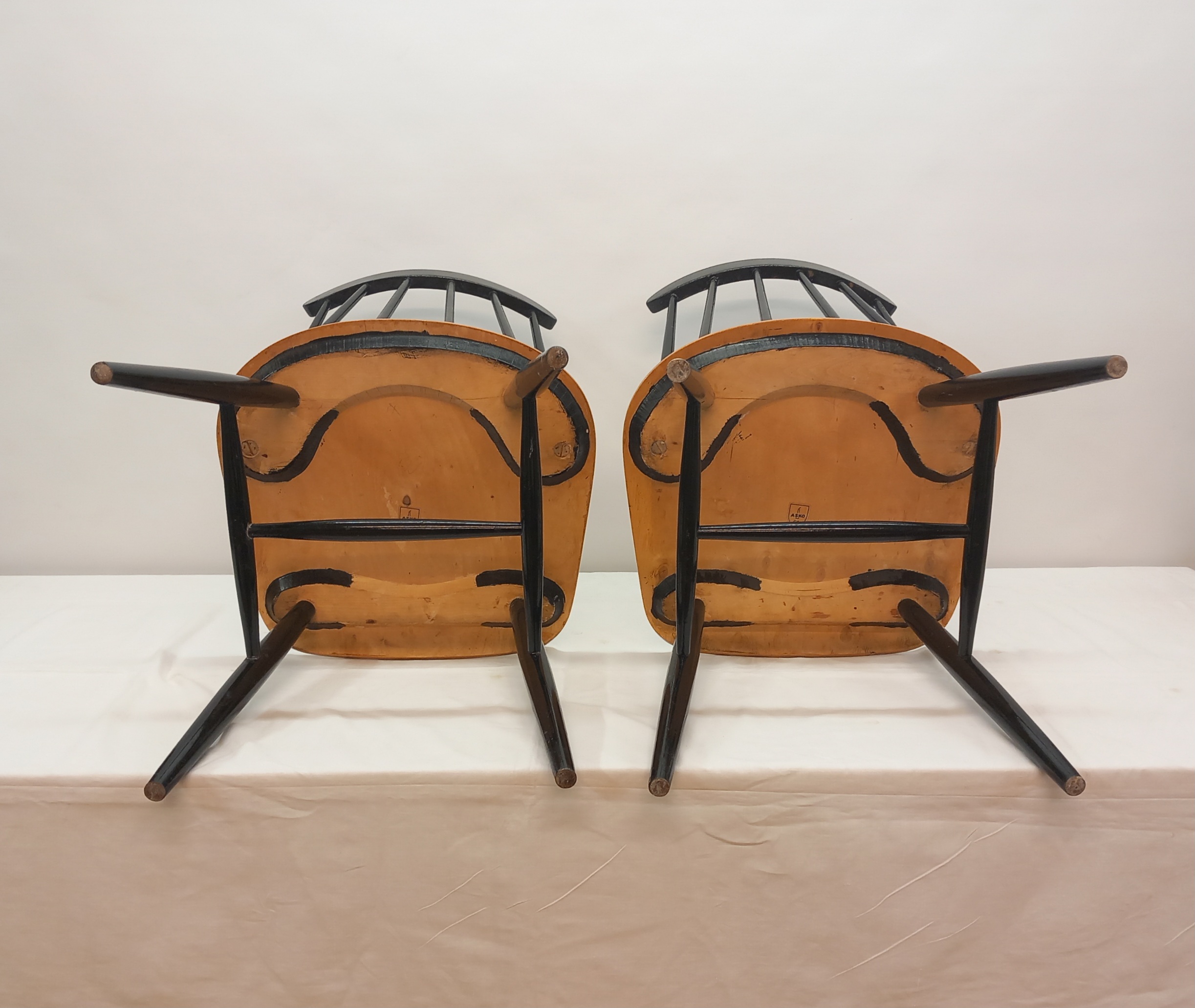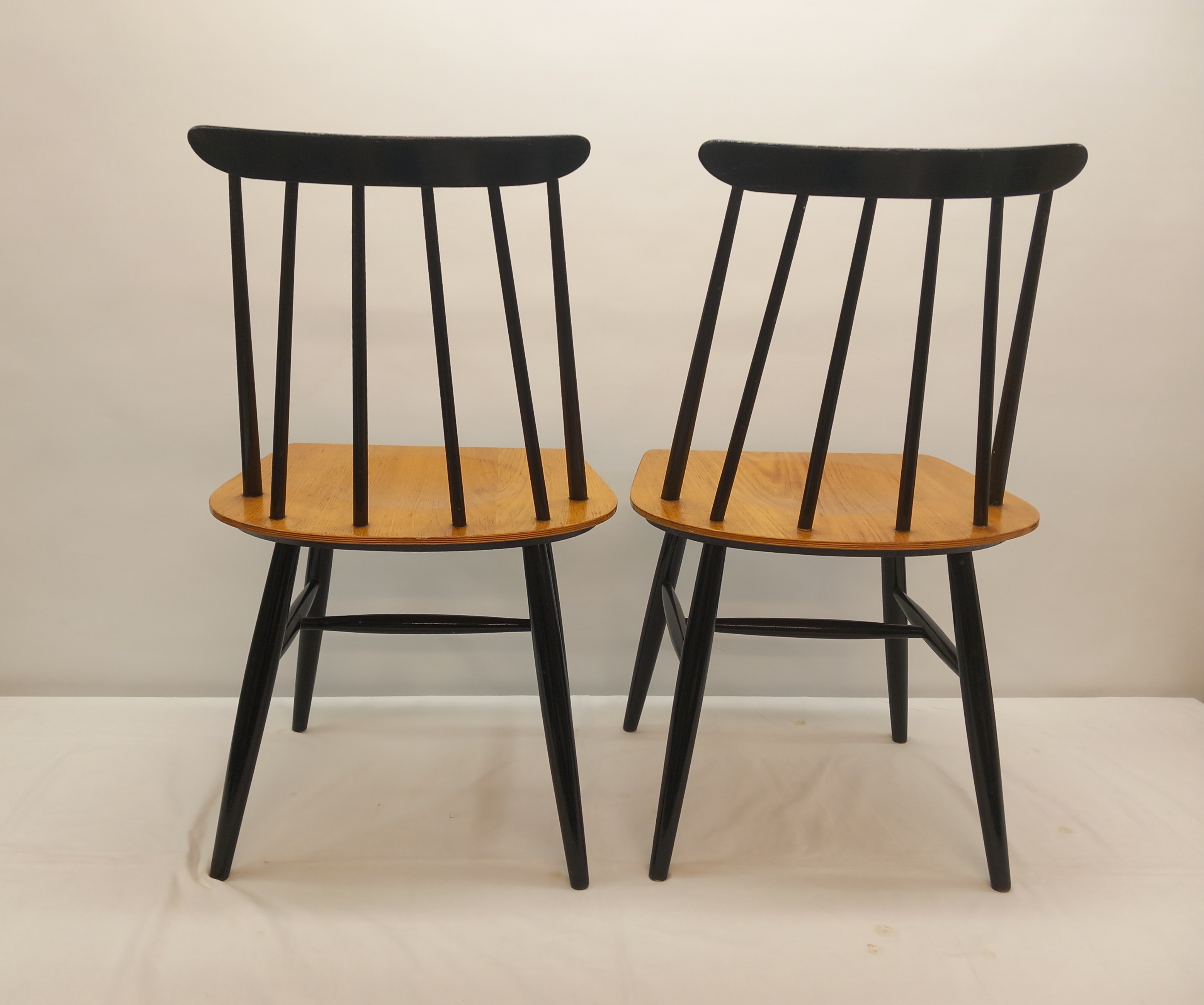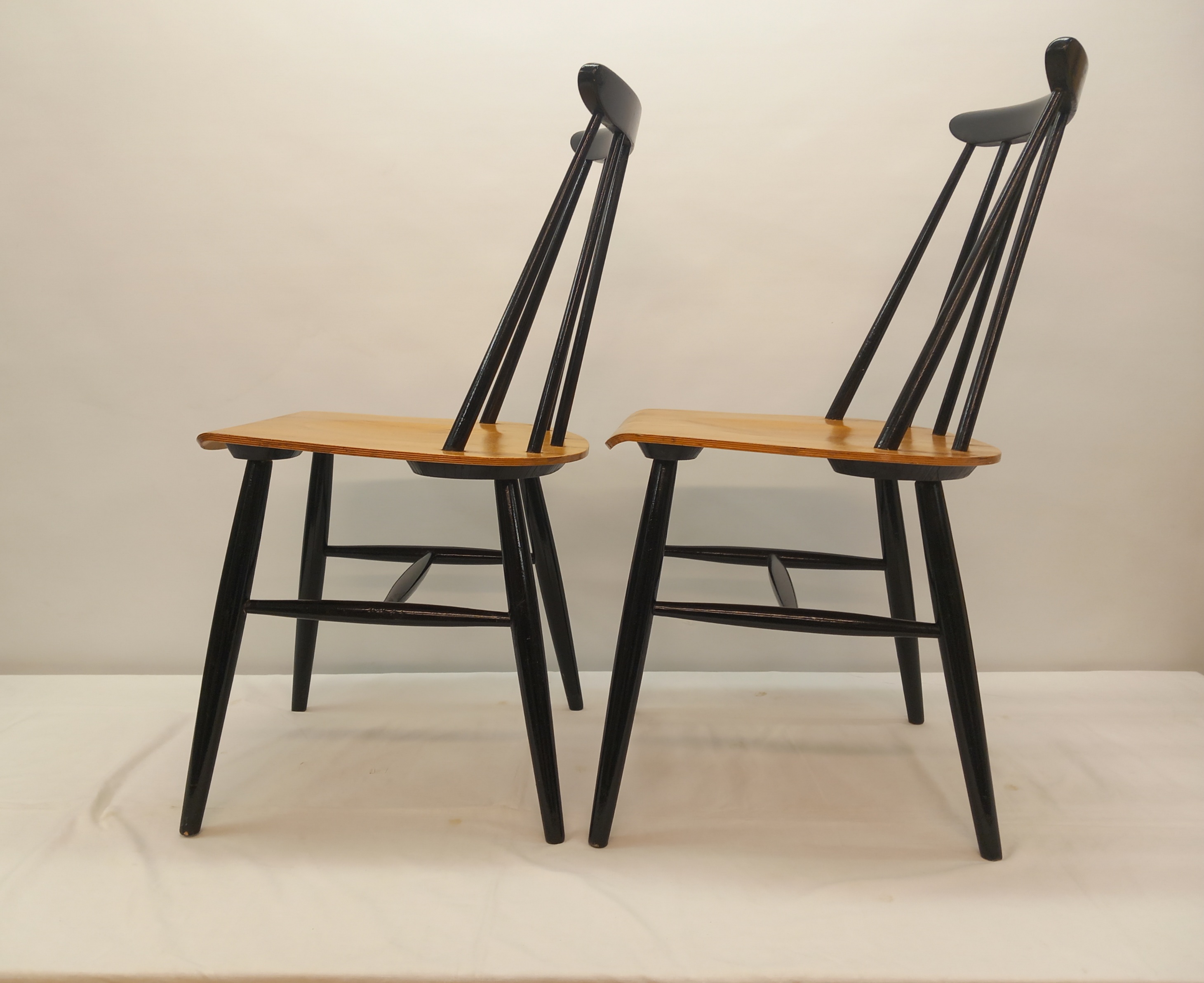 Kaksi Askon alkuperäismallista Fanett-tuolia 1950-60 -luvuilta. Kyseisessä mallissa tuolin istuinosa oli jalopuuviilua ja pinnaselkänoja sekä jalat mustaksi maalatut.