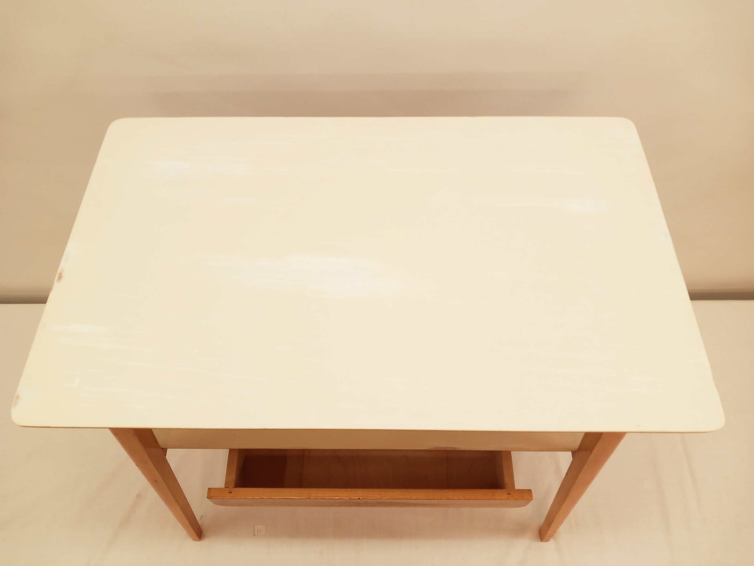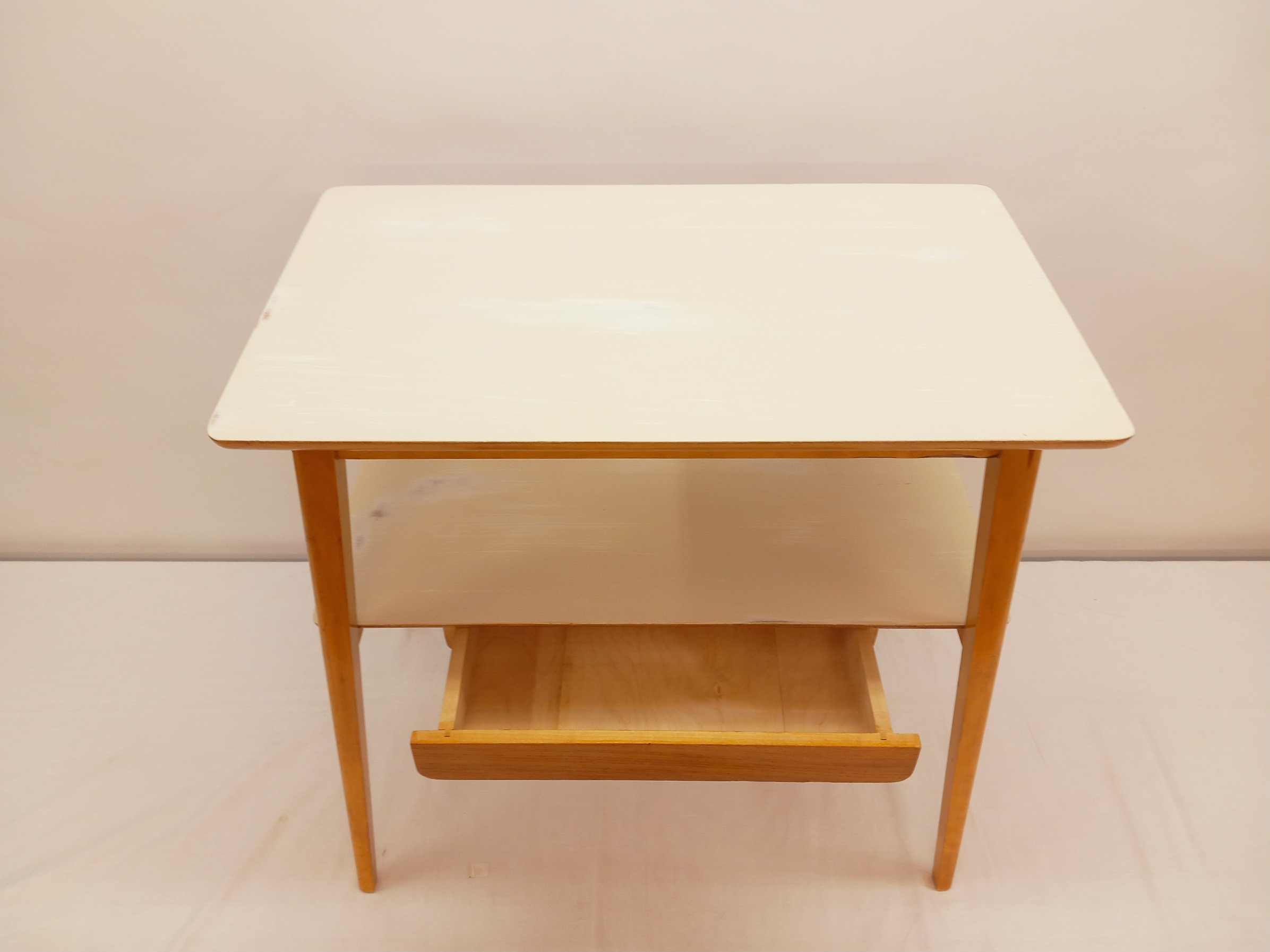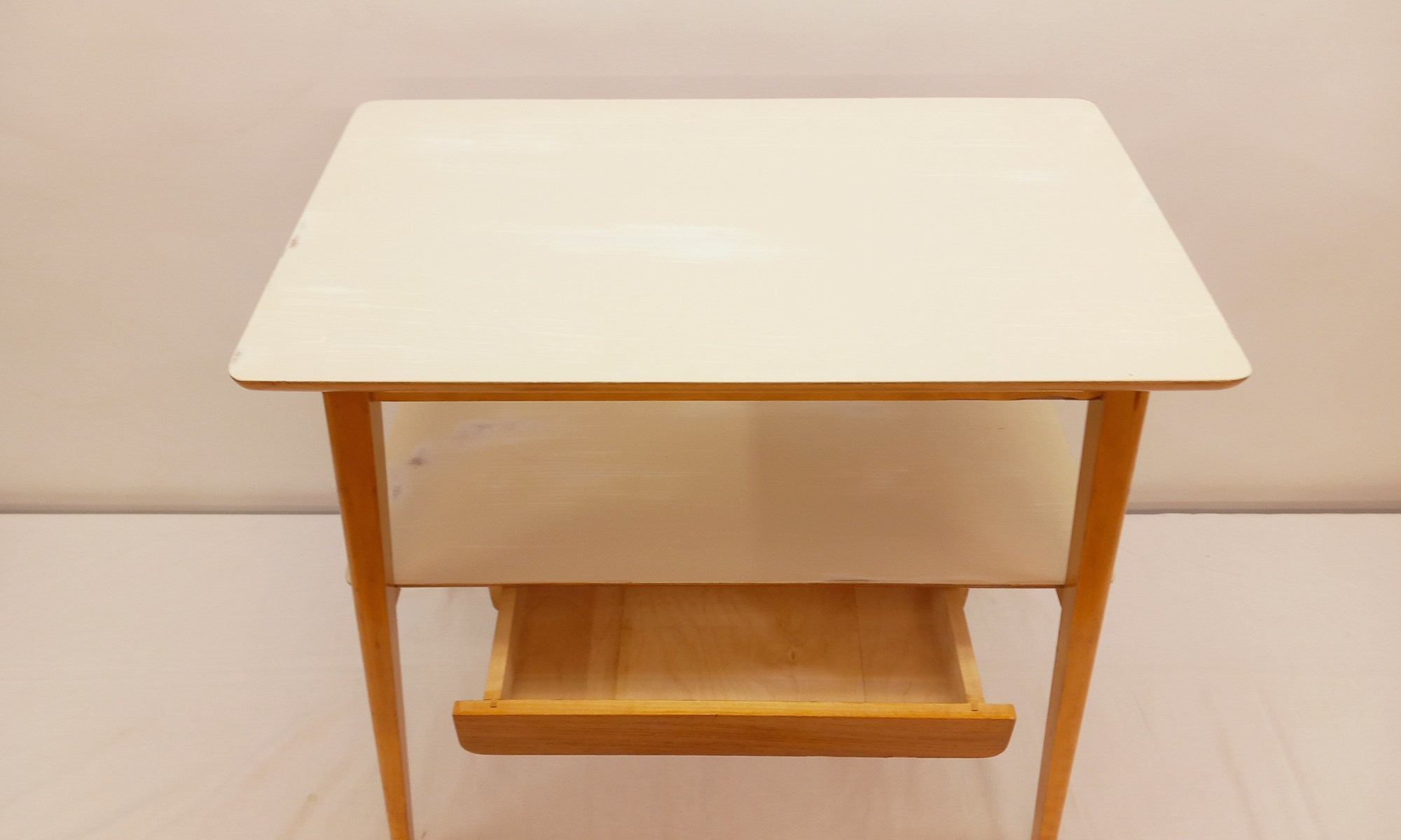 Kunnostettu, siro Shabby Chic -pikkupöytä 1950-luvulta yhdellä vetolaatikolla. Pöydän kansi on uusittu valkoisella ja vaalean beigellä maaleilla, joissa on paikoittain kulumia. Puuosissa on pientä patinaa.