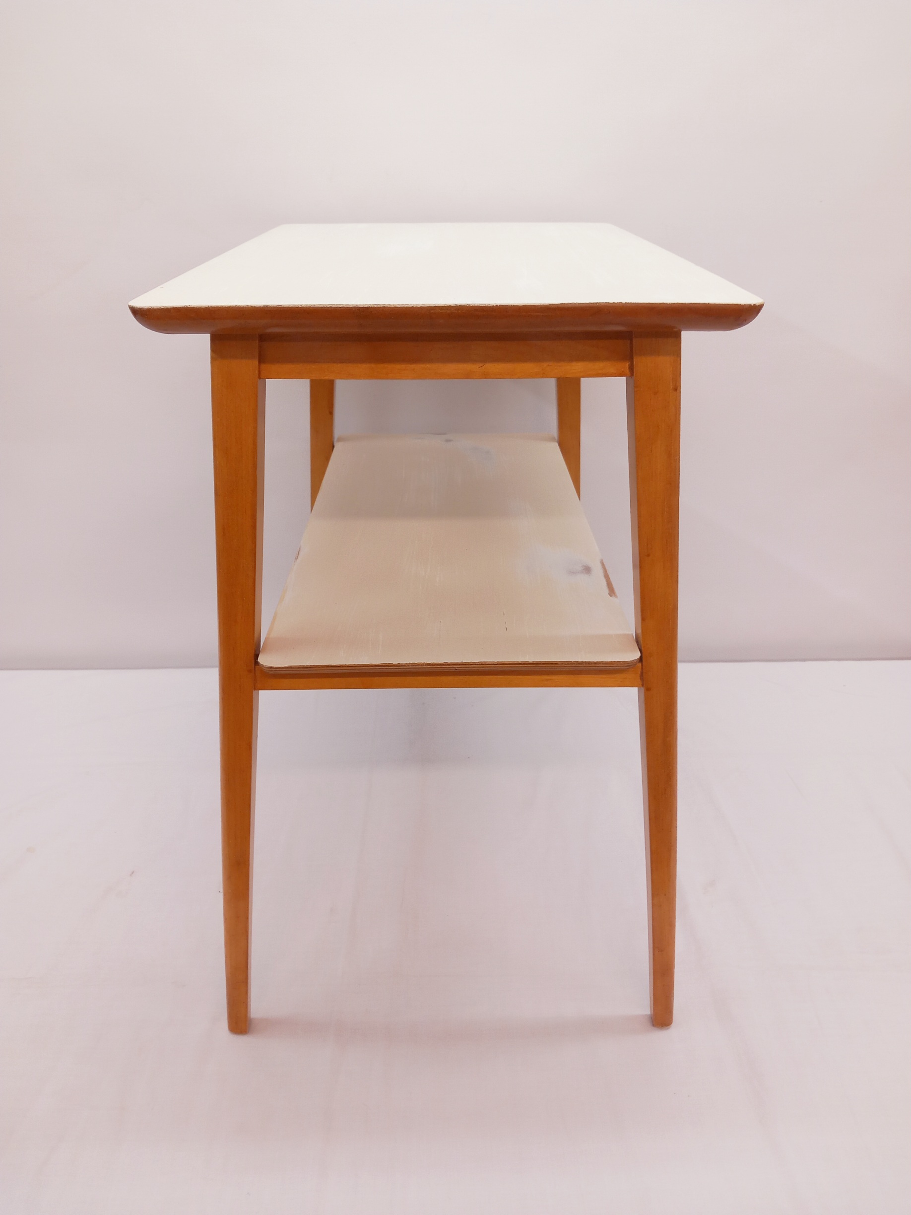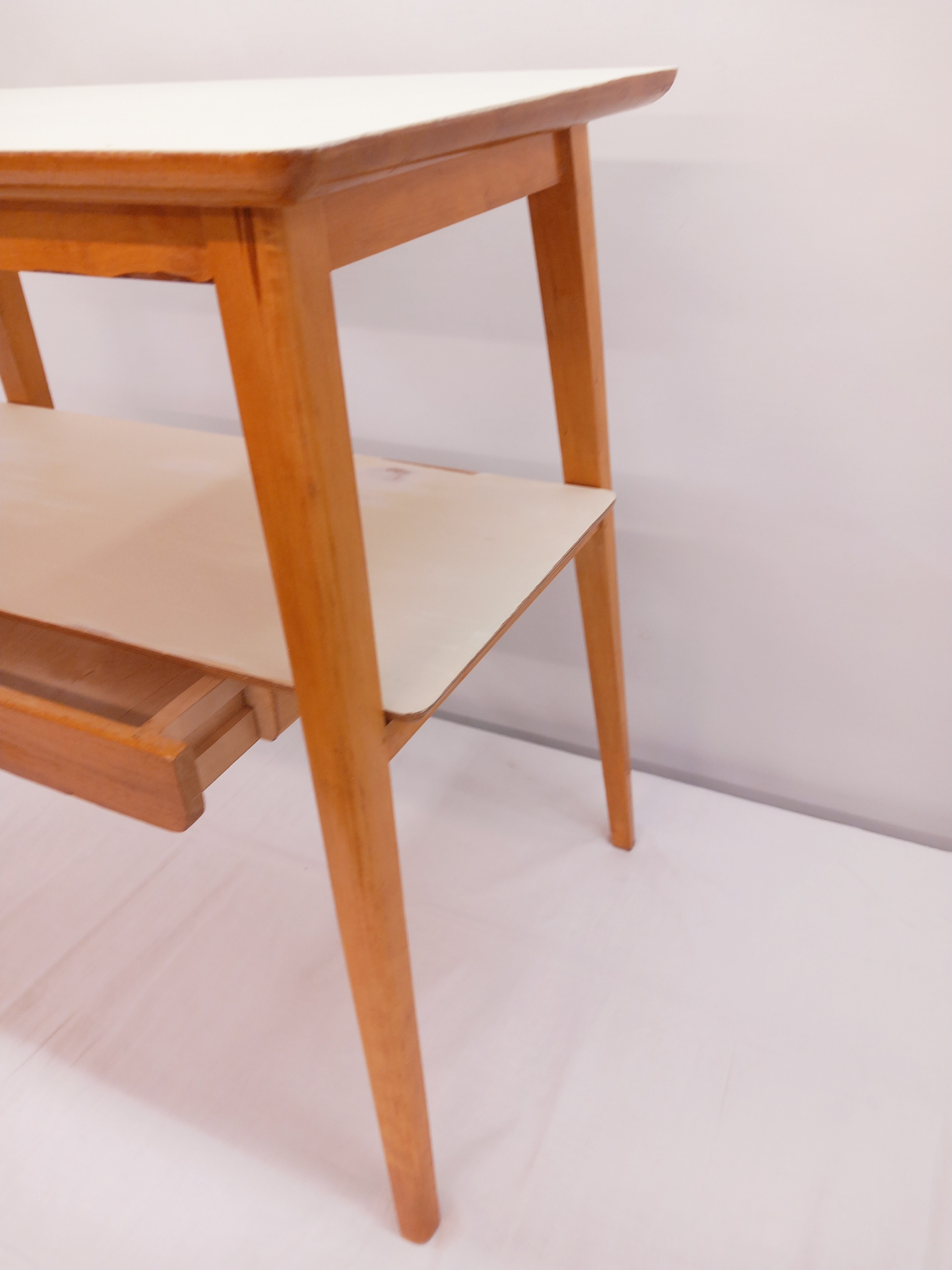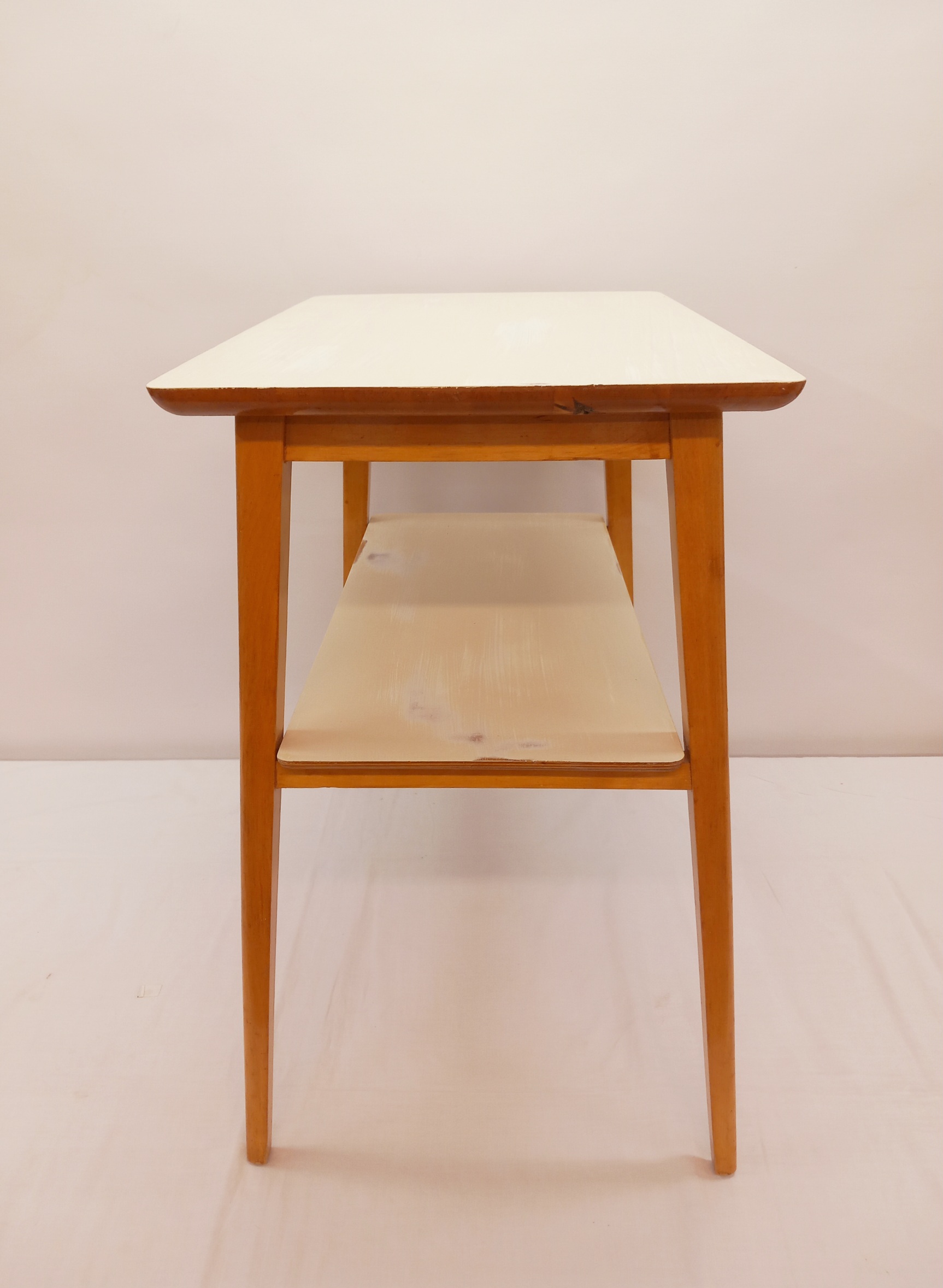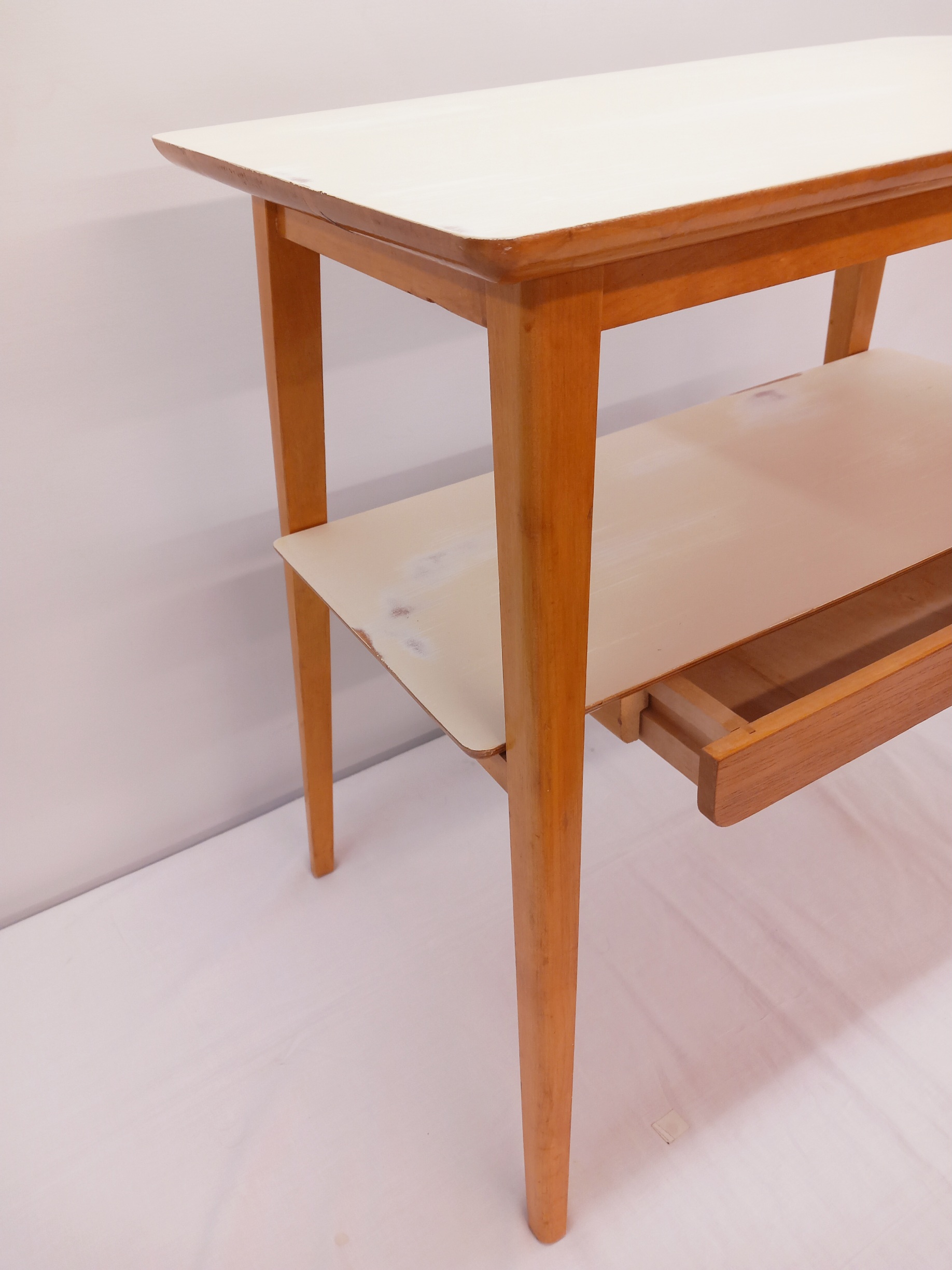 Kunnostettu, siro Shabby Chic -pikkupöytä 1950-luvulta yhdellä vetolaatikolla. Pöydän kansi on uusittu valkoisella ja vaalean beigellä maaleilla, joissa on paikoittain kulumia. Puuosissa on pientä patinaa.
