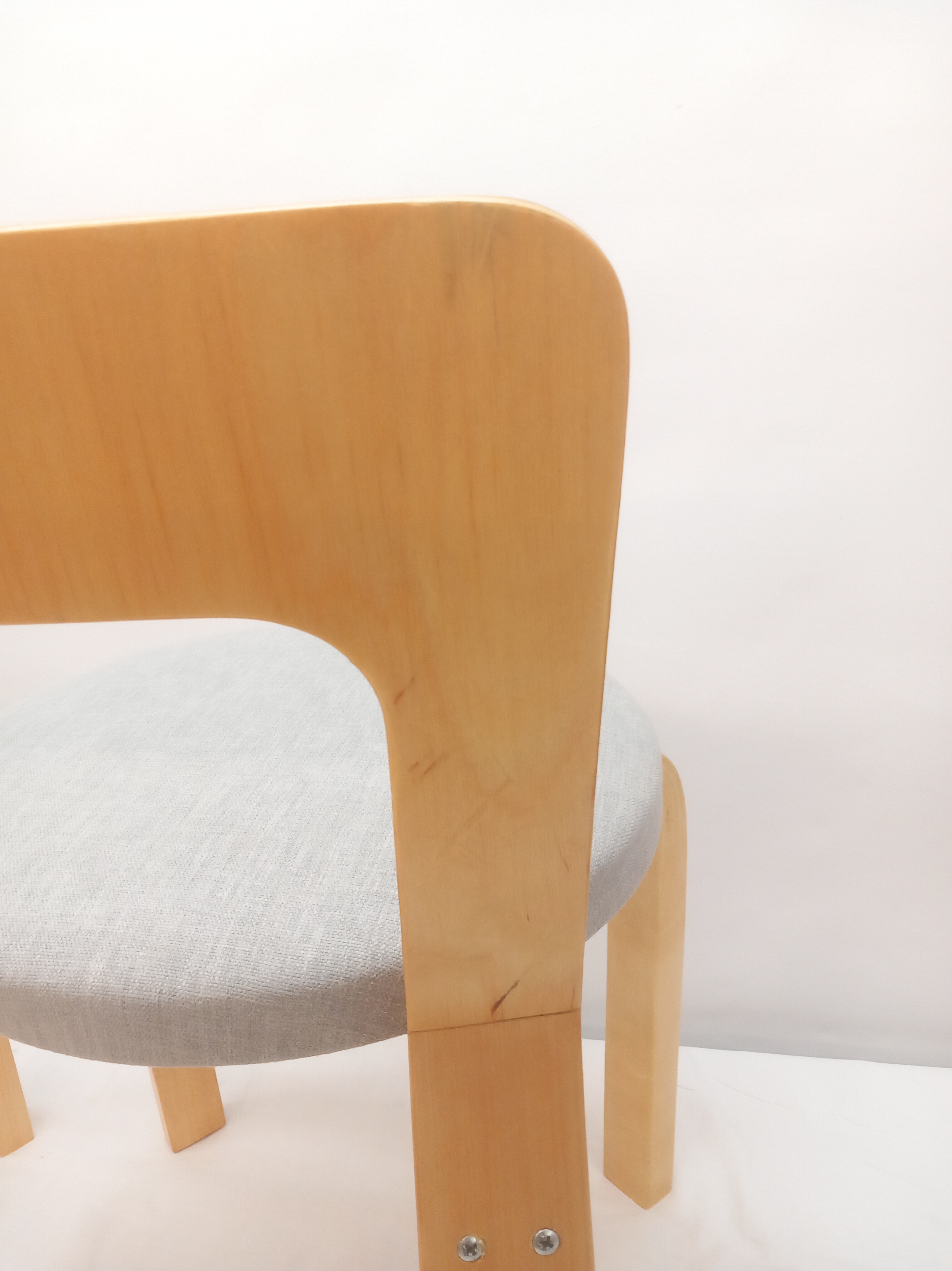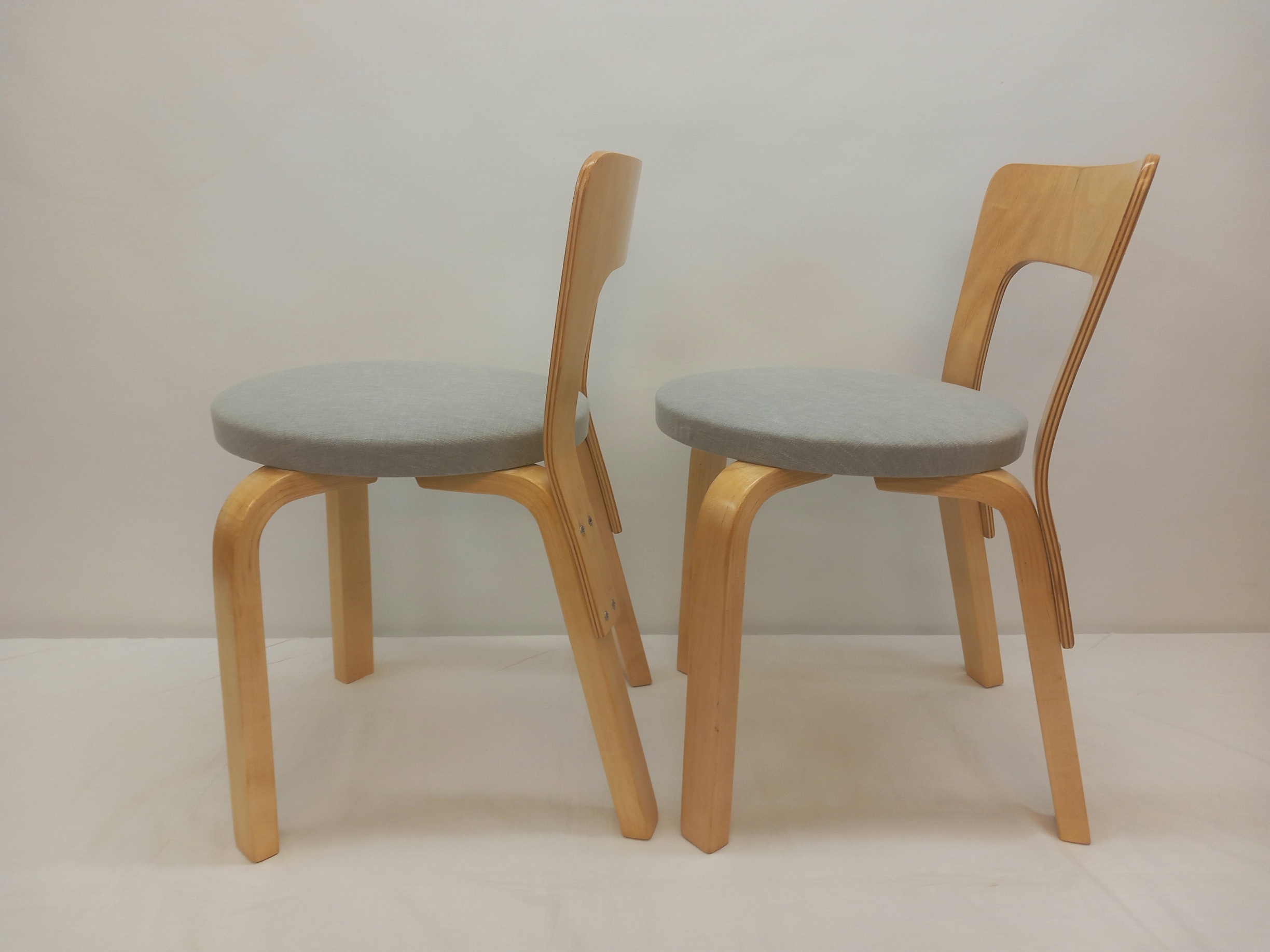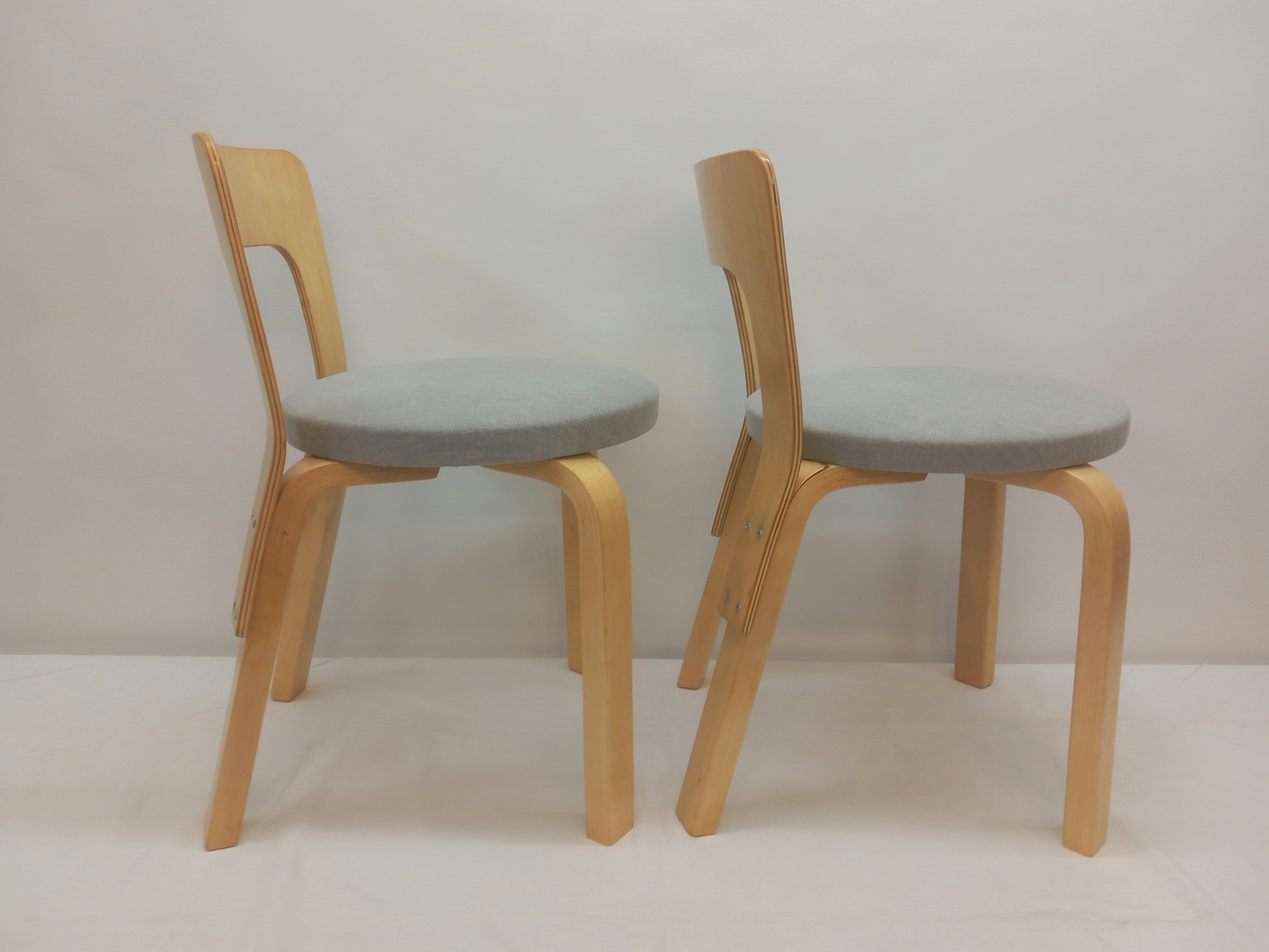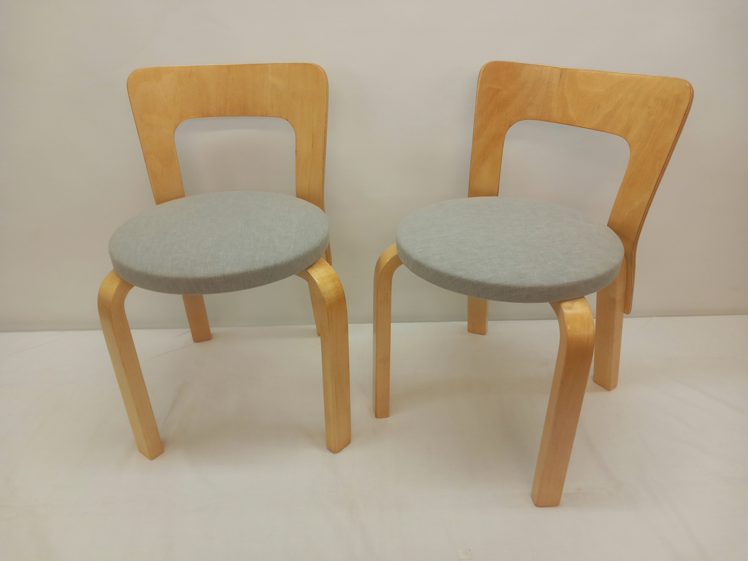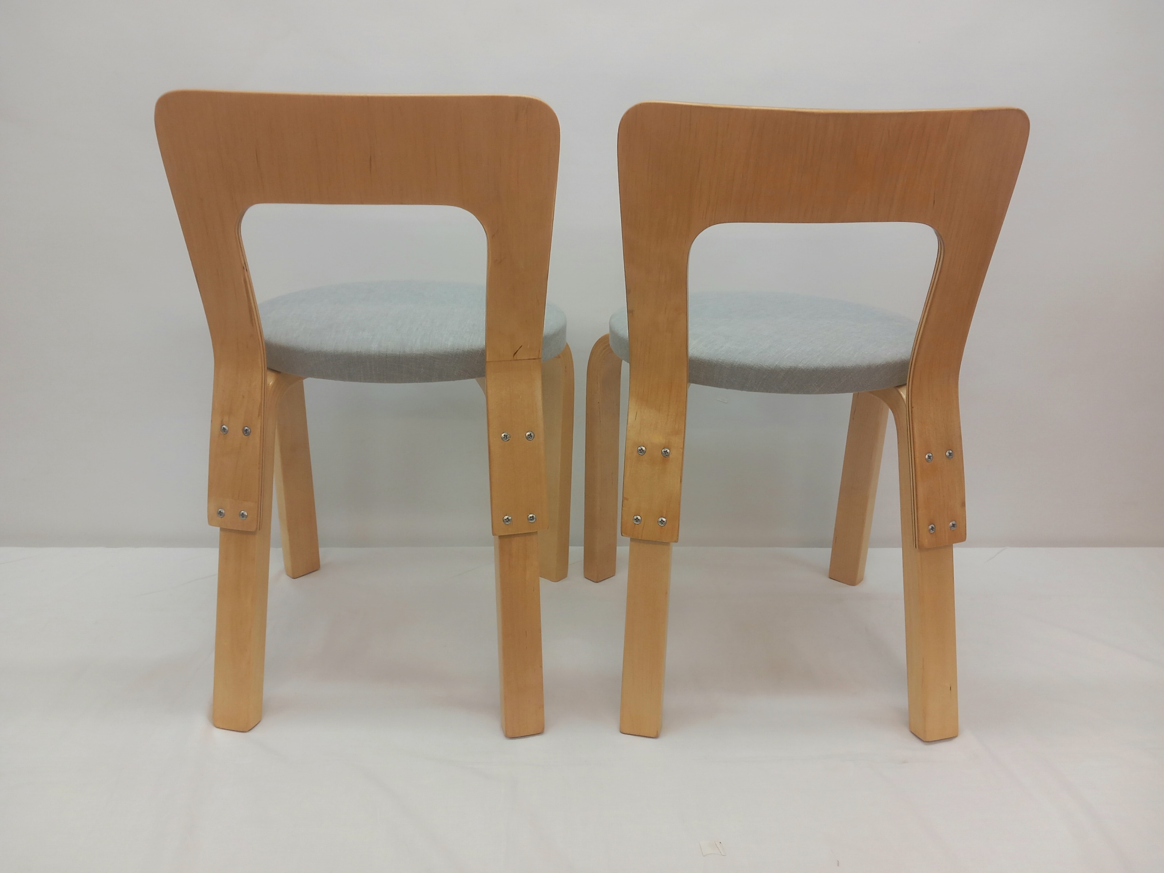 Kunnostuksessa tuolien istuinosien pehmusteet on uusittu ja tuolit on verhoiltu laadukkaalla, likaa ja kosteutta hylkivällä harmaalla verhoilukankaalla. Tuoleja on jossakin vaiheessa niiden elinkaarta korjattu. Nyt nämä (varsin hyvin tehdyt) korjaukset on siistitty ja kaikki pinnat on lakattu. Tukevat, siistit ja ehjät lastentuolit.