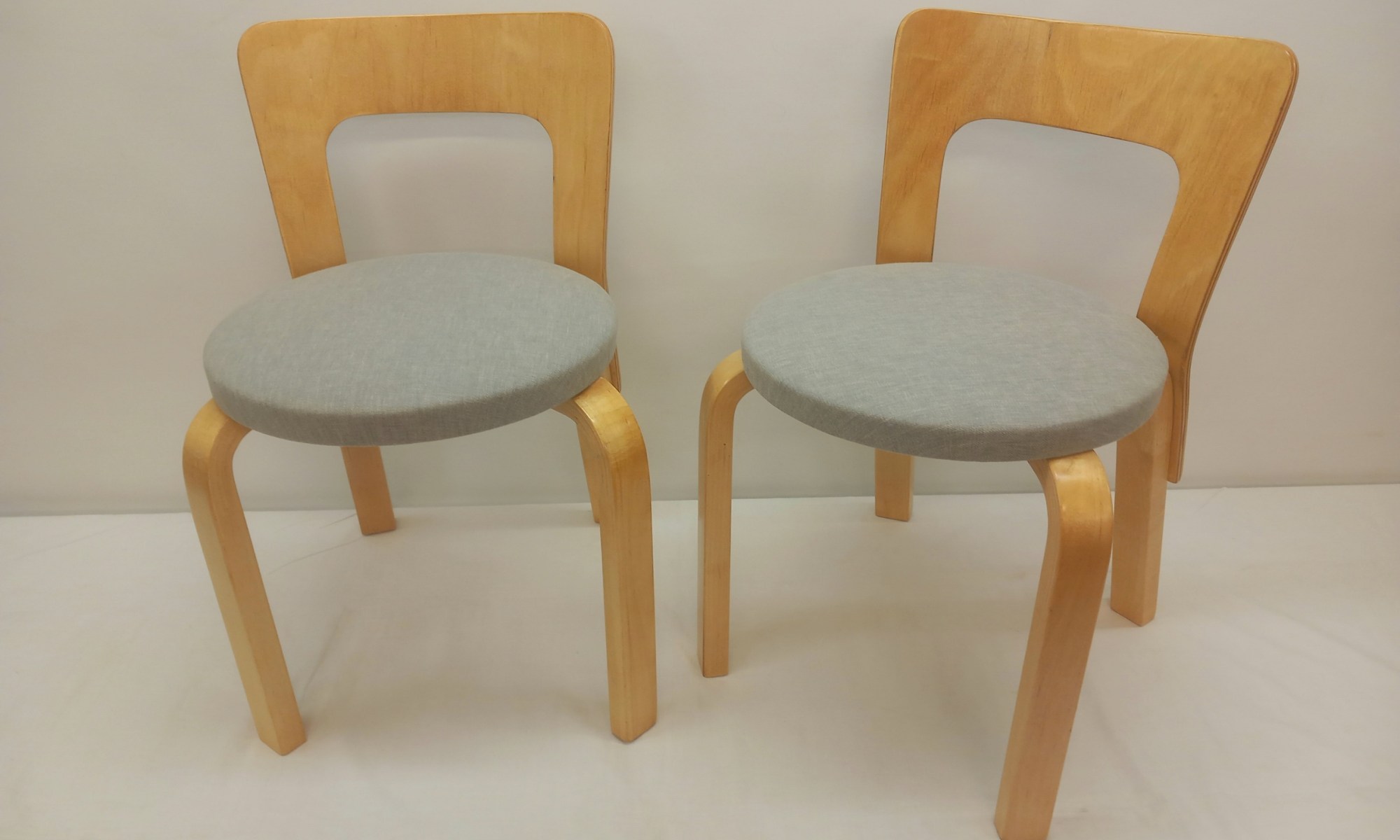 Kaksi kappaletta kunnostettuja Artekin N65-lastentuoleja harmailla pehmustetuilla istuinosilla 1960-70 -luvuilta.