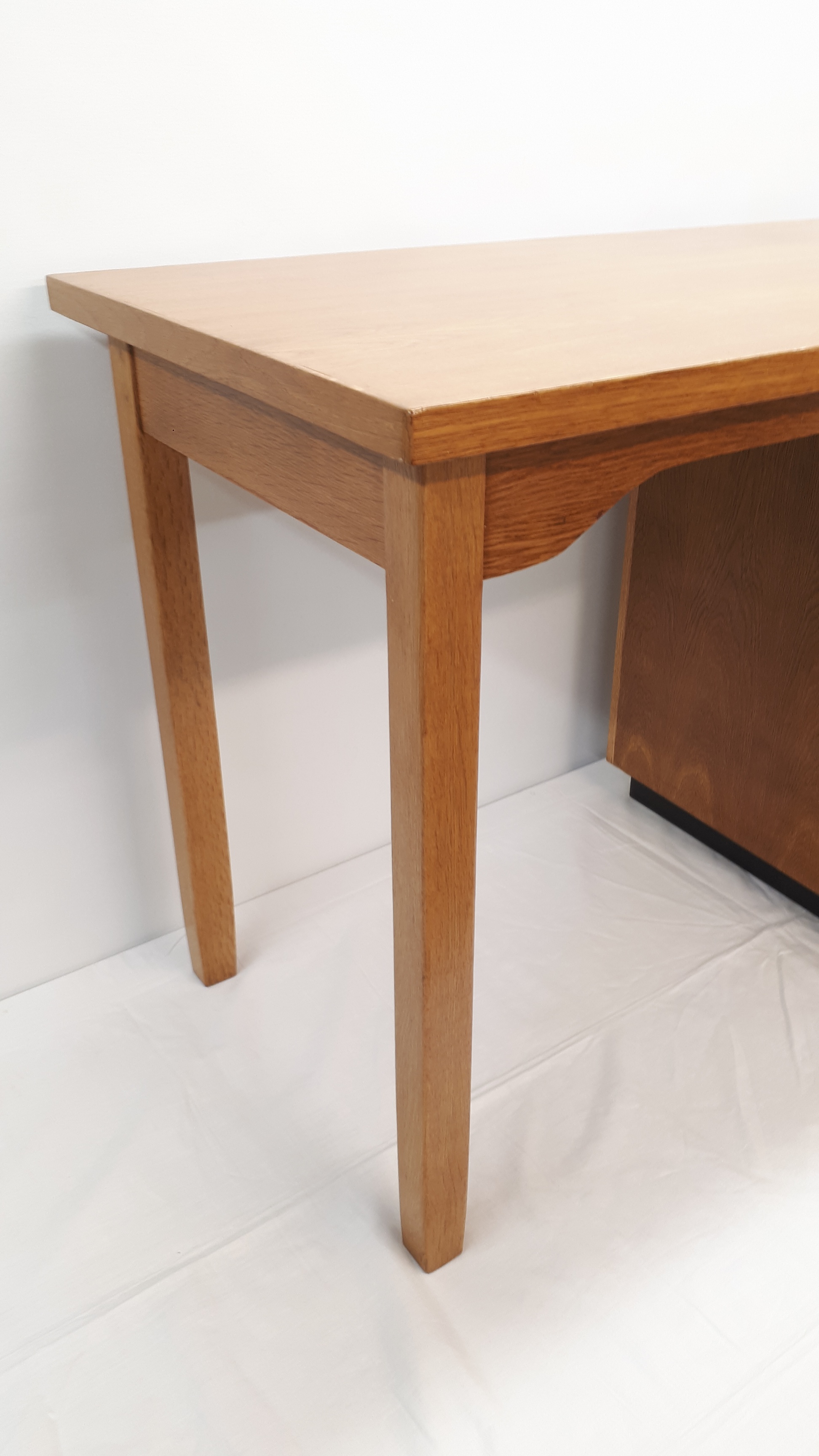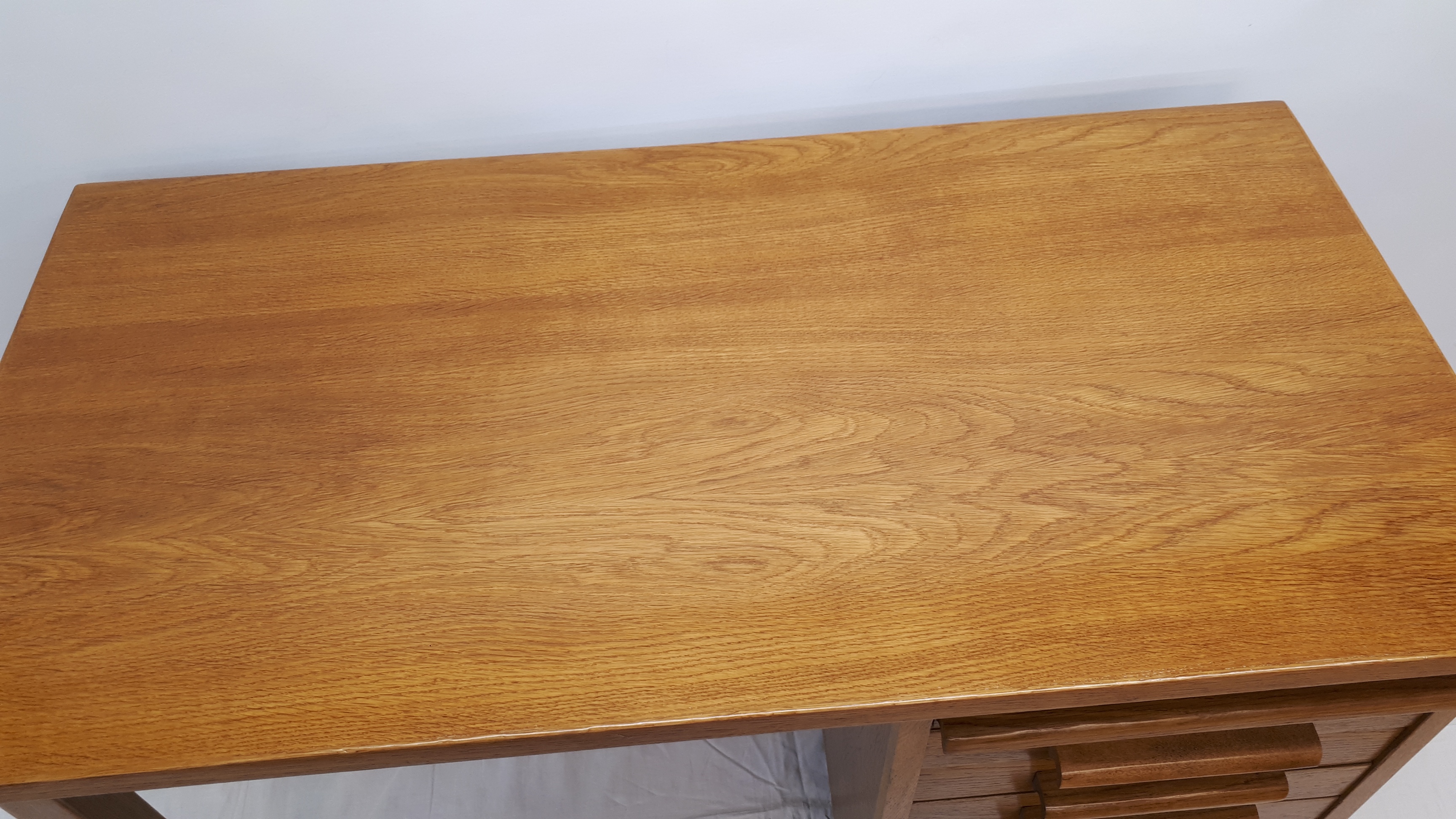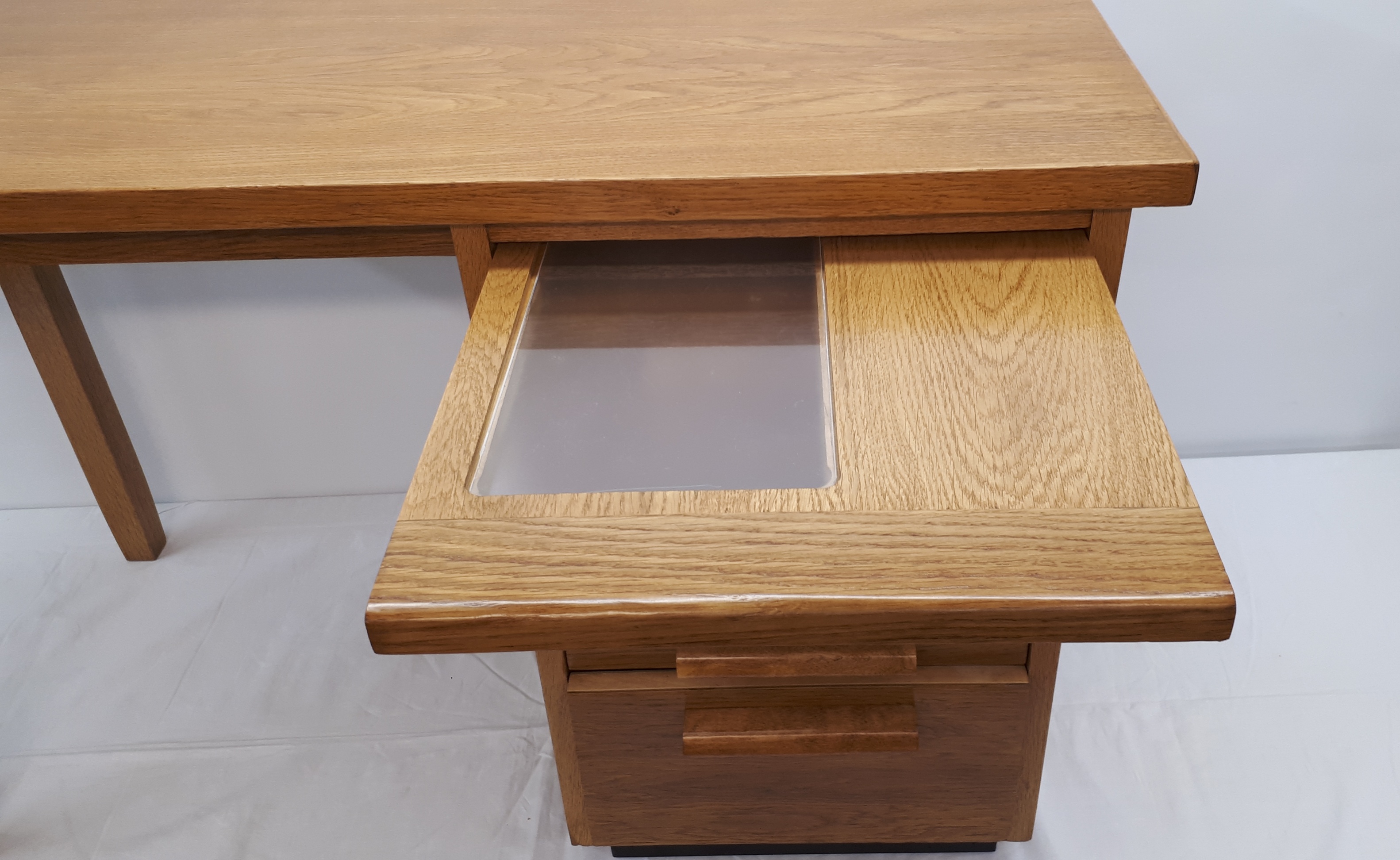 Kunnostettu, iso (190x98cm) Billnäsin kirjoituspöytä. Pöytä on tammipetsattu ja lakattu nitroselluloosalakalla. Pöydässä on kaksi laatikostoa, joissa ylimpinä ovat ulosvedettävät tasot. Lukkojen metallipinnat on kiillotettu. Lukkoihin ei ole avainta.