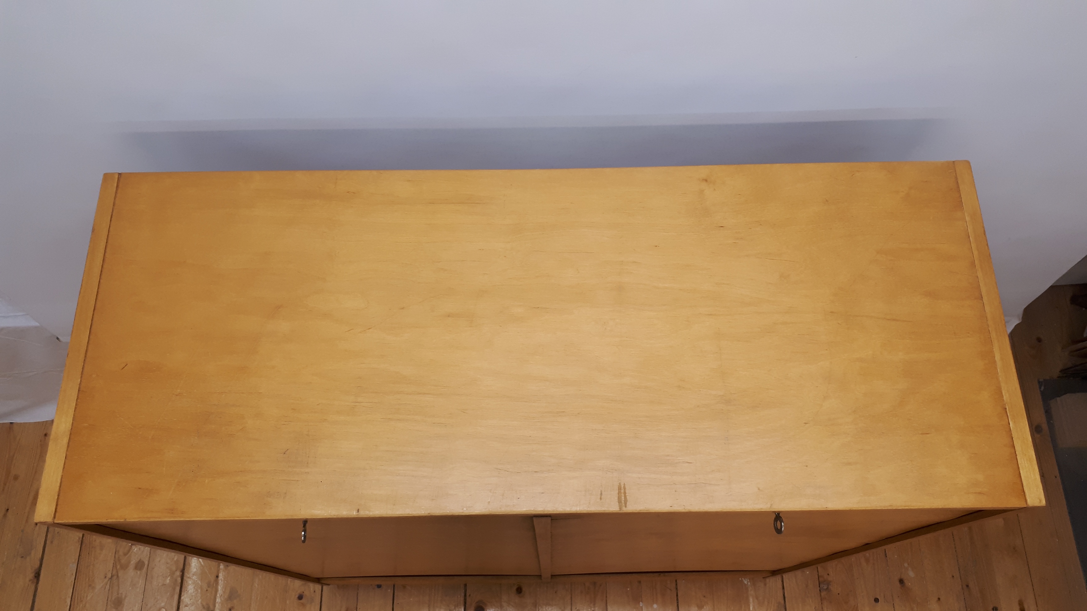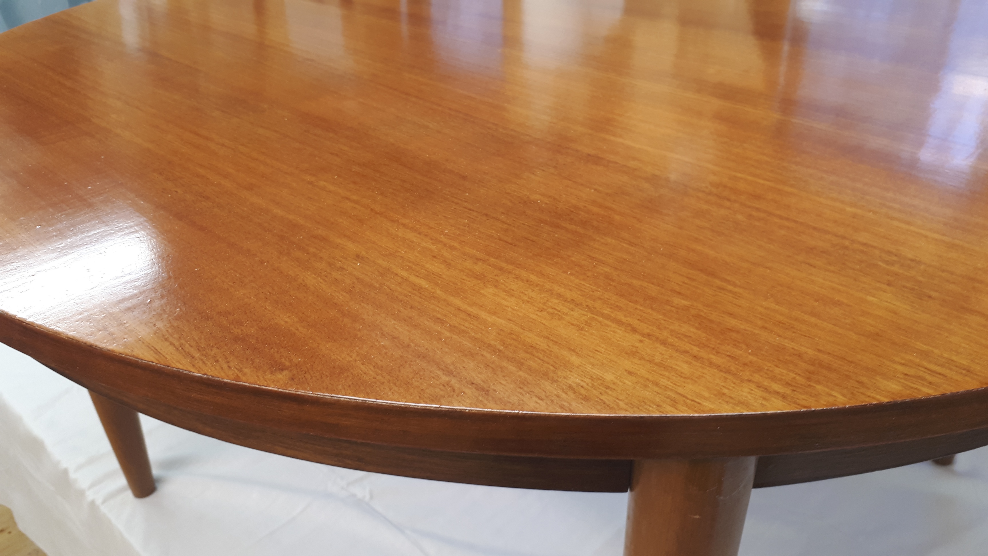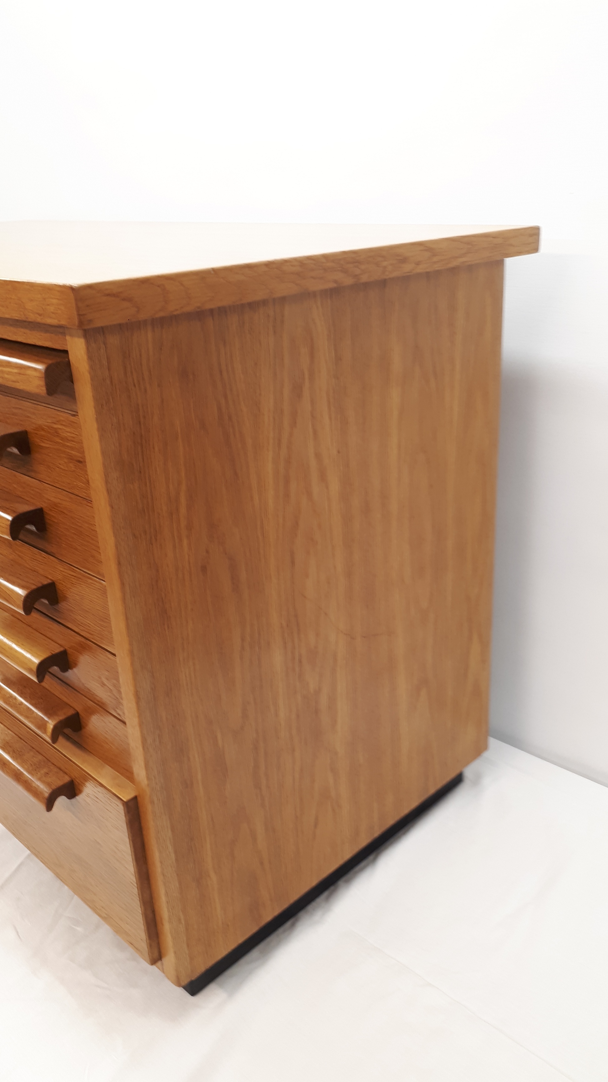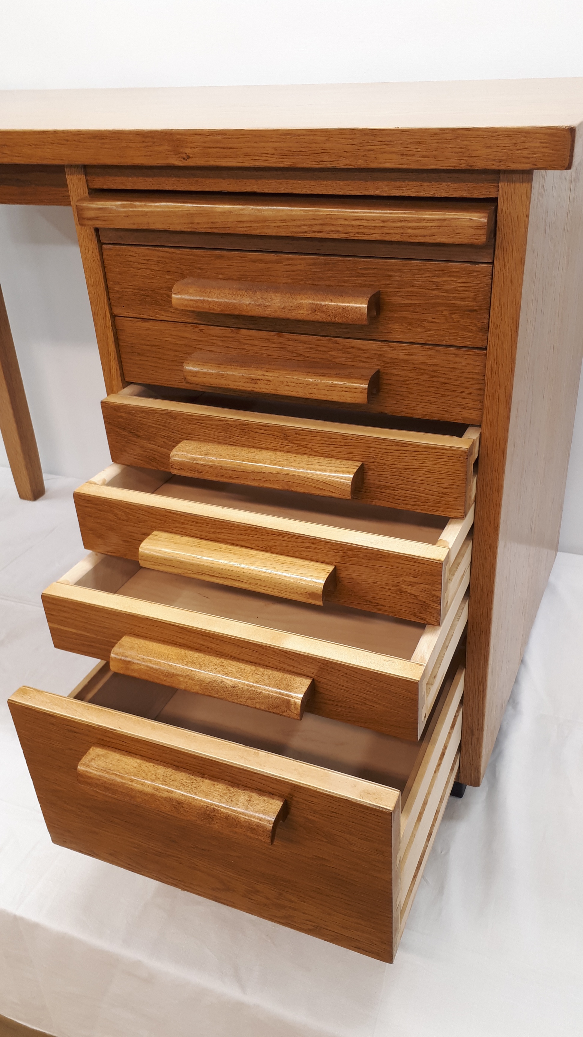 Kunnostettu, iso (190x98cm) Billnäsin kirjoituspöytä. Pöytä on tammipetsattu ja lakattu nitroselluloosalakalla. Pöydässä on kaksi laatikostoa, joissa ylimpinä ovat ulosvedettävät tasot. Lukkojen metallipinnat on kiillotettu. Lukkoihin ei ole avainta.