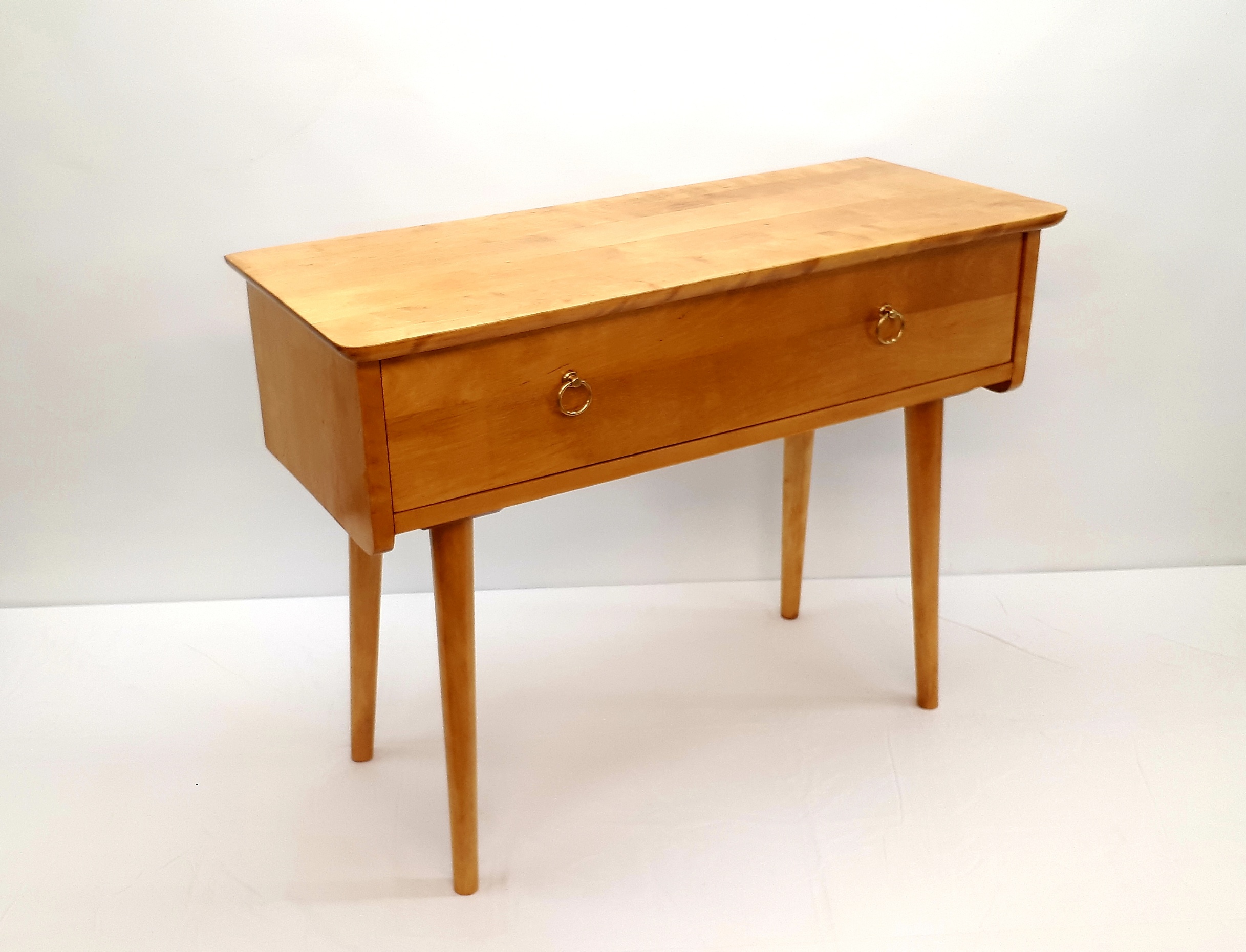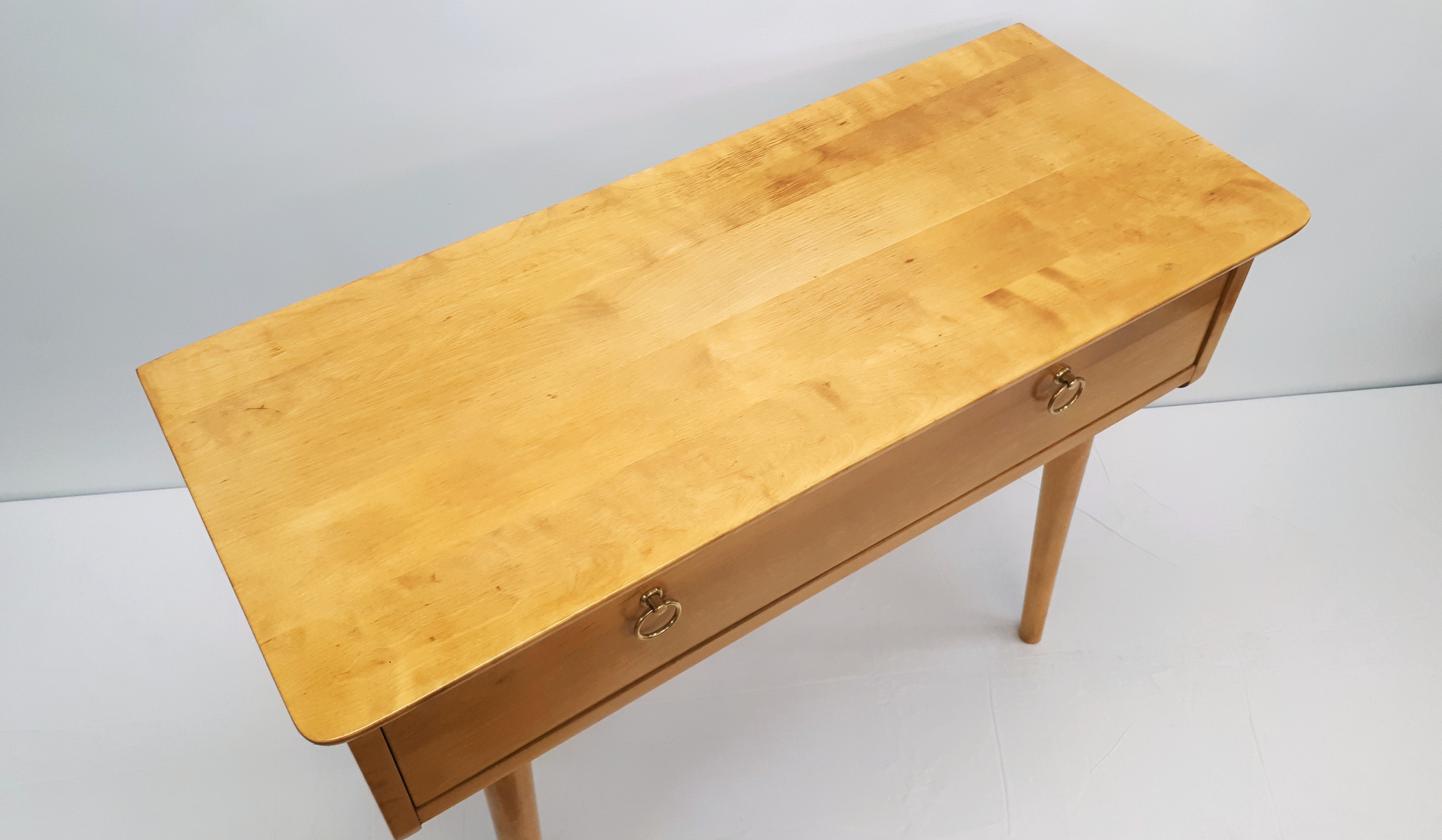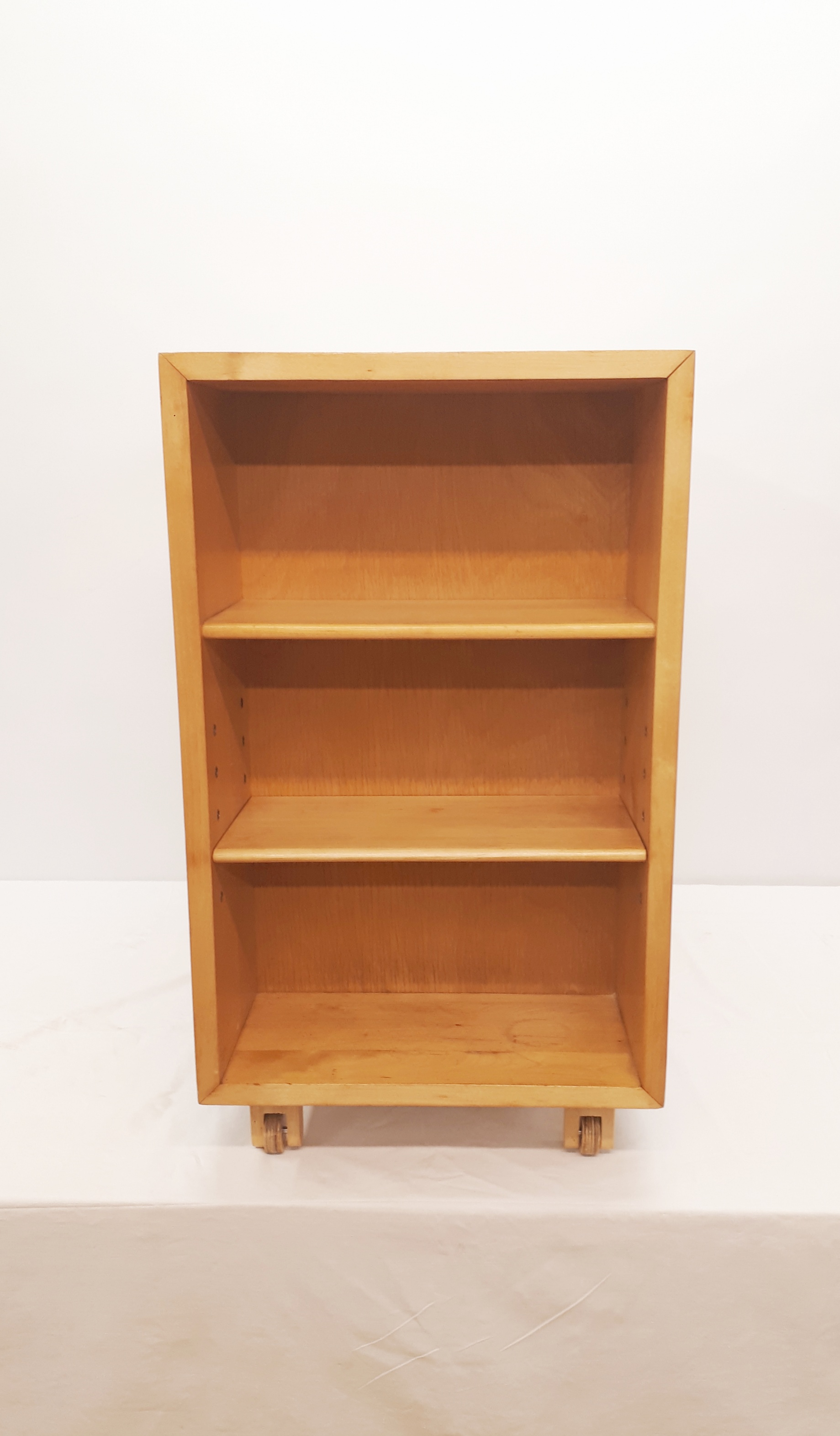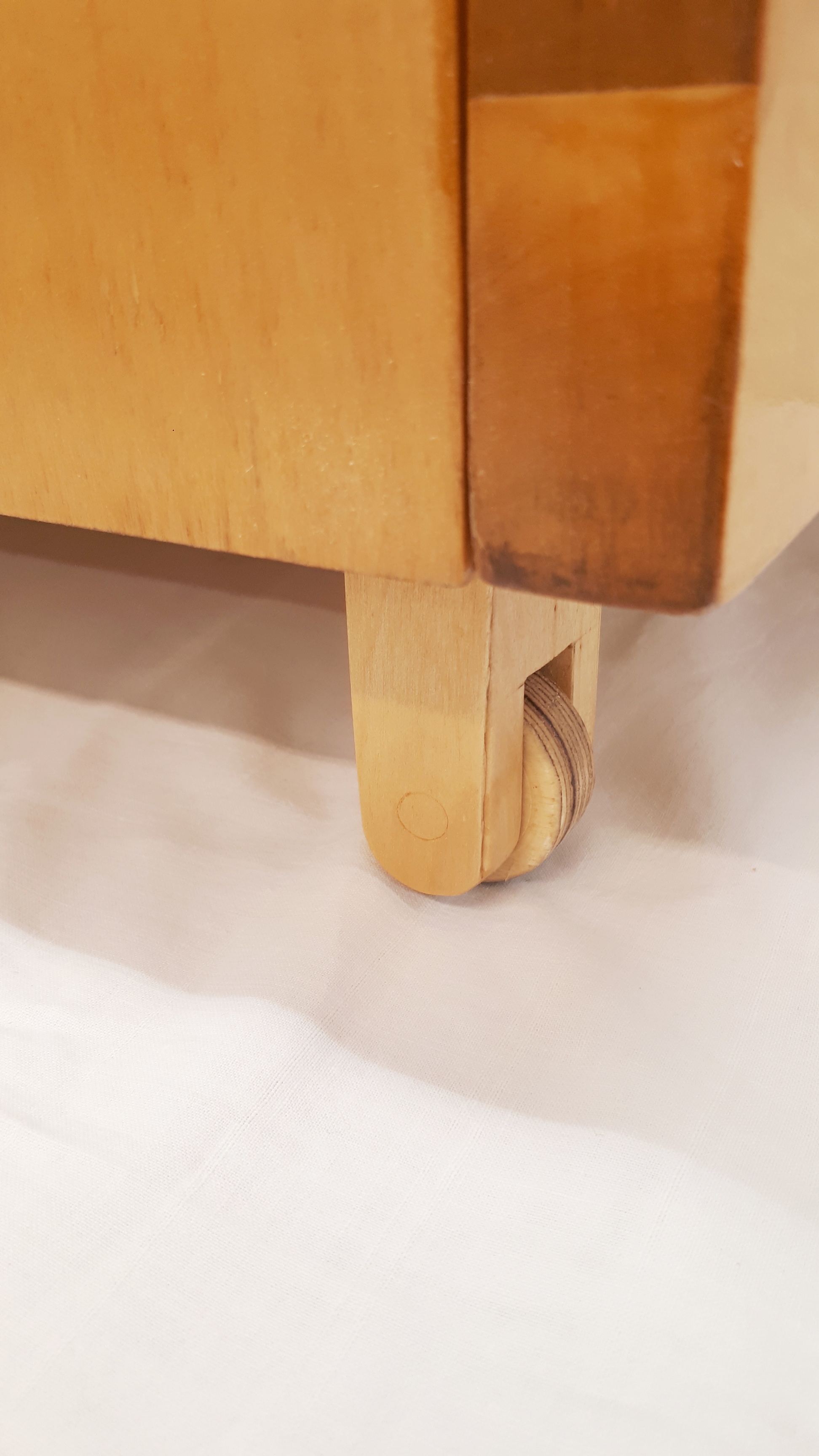 Takaosan irtohylly ja puupyörät eivät ole alkuperäiset. Hylly ja moitteetta toimivan pyörät on valmistettu alkuperäisen mallin mukaan 1950-luvun koivusta.