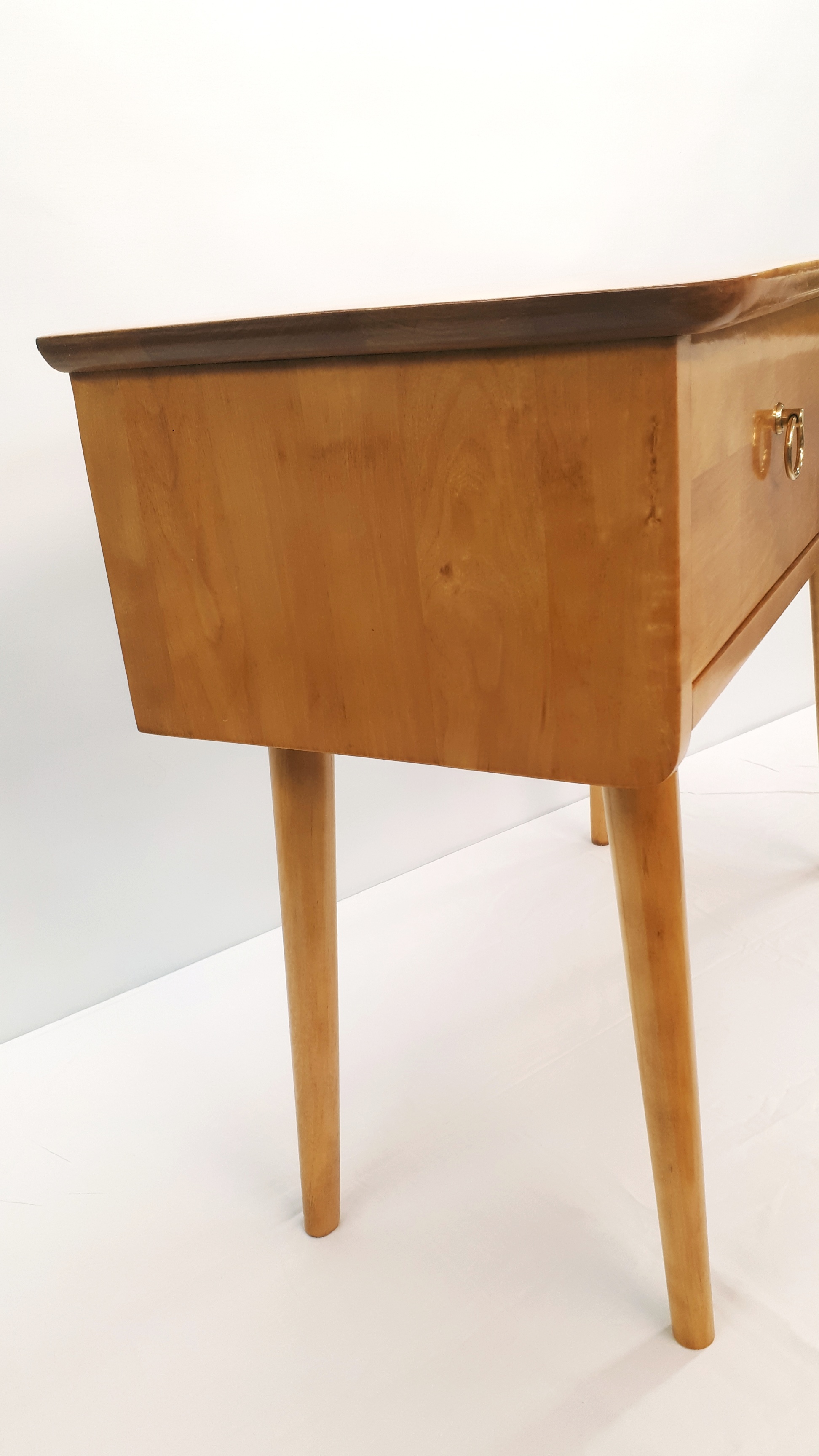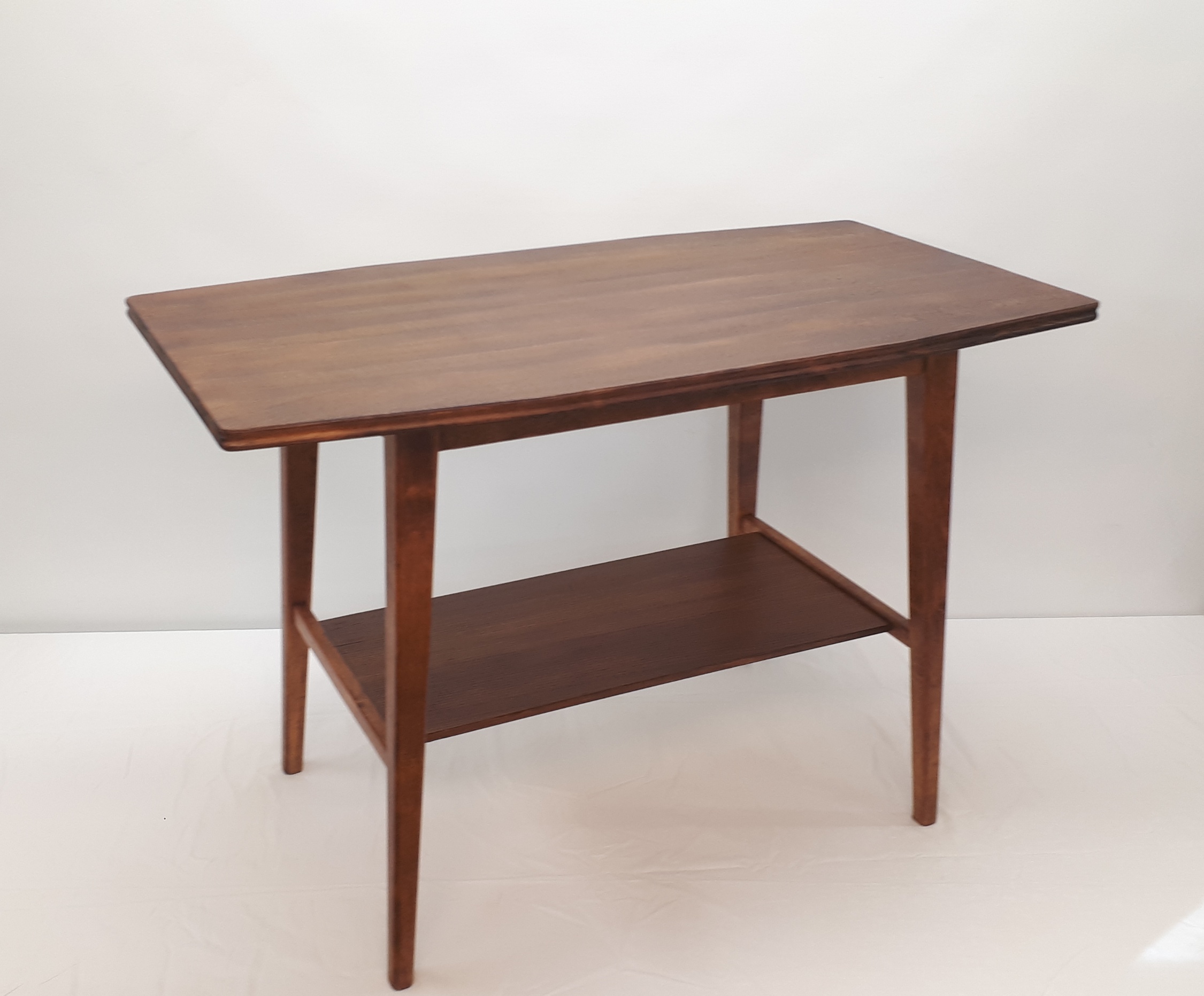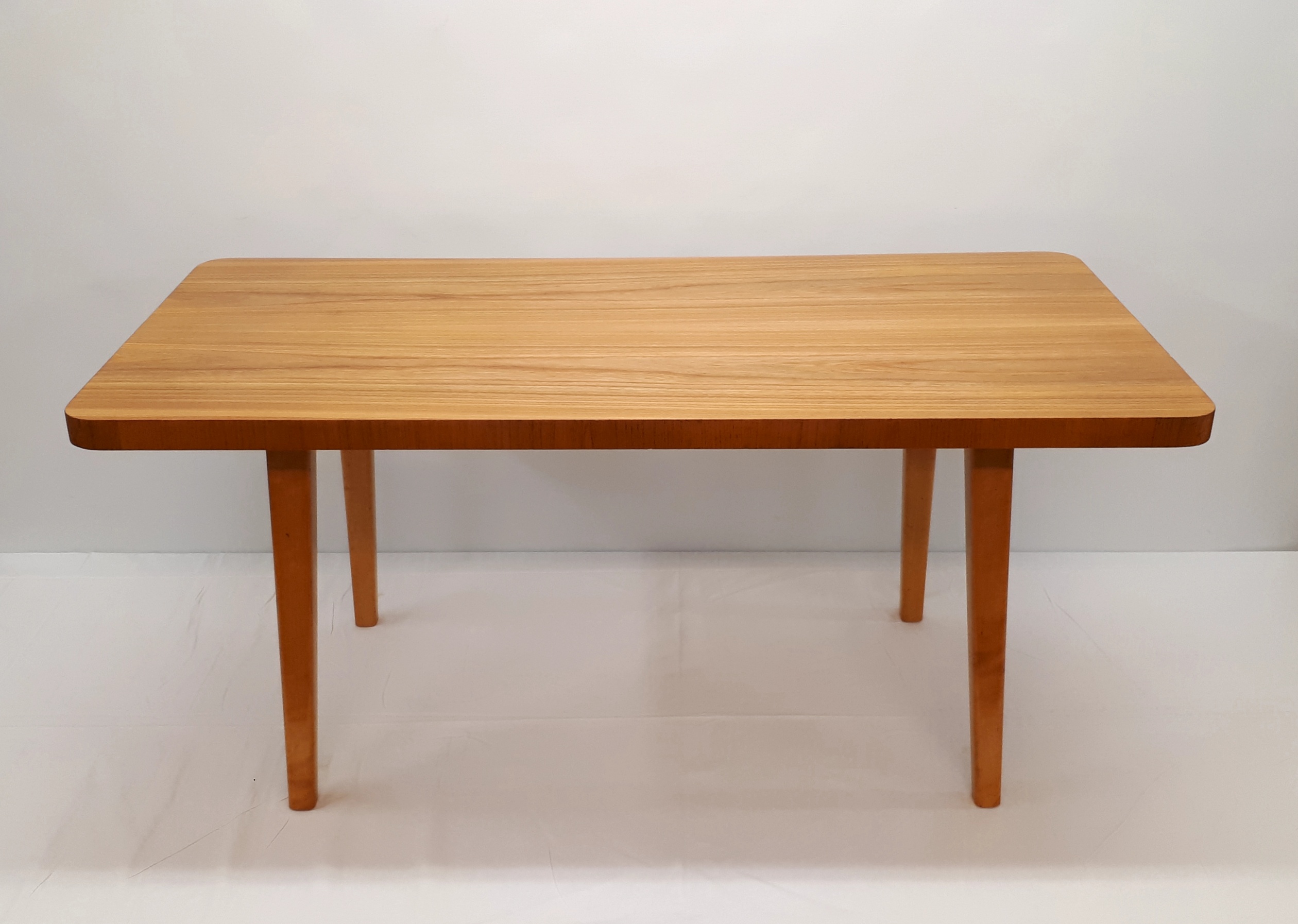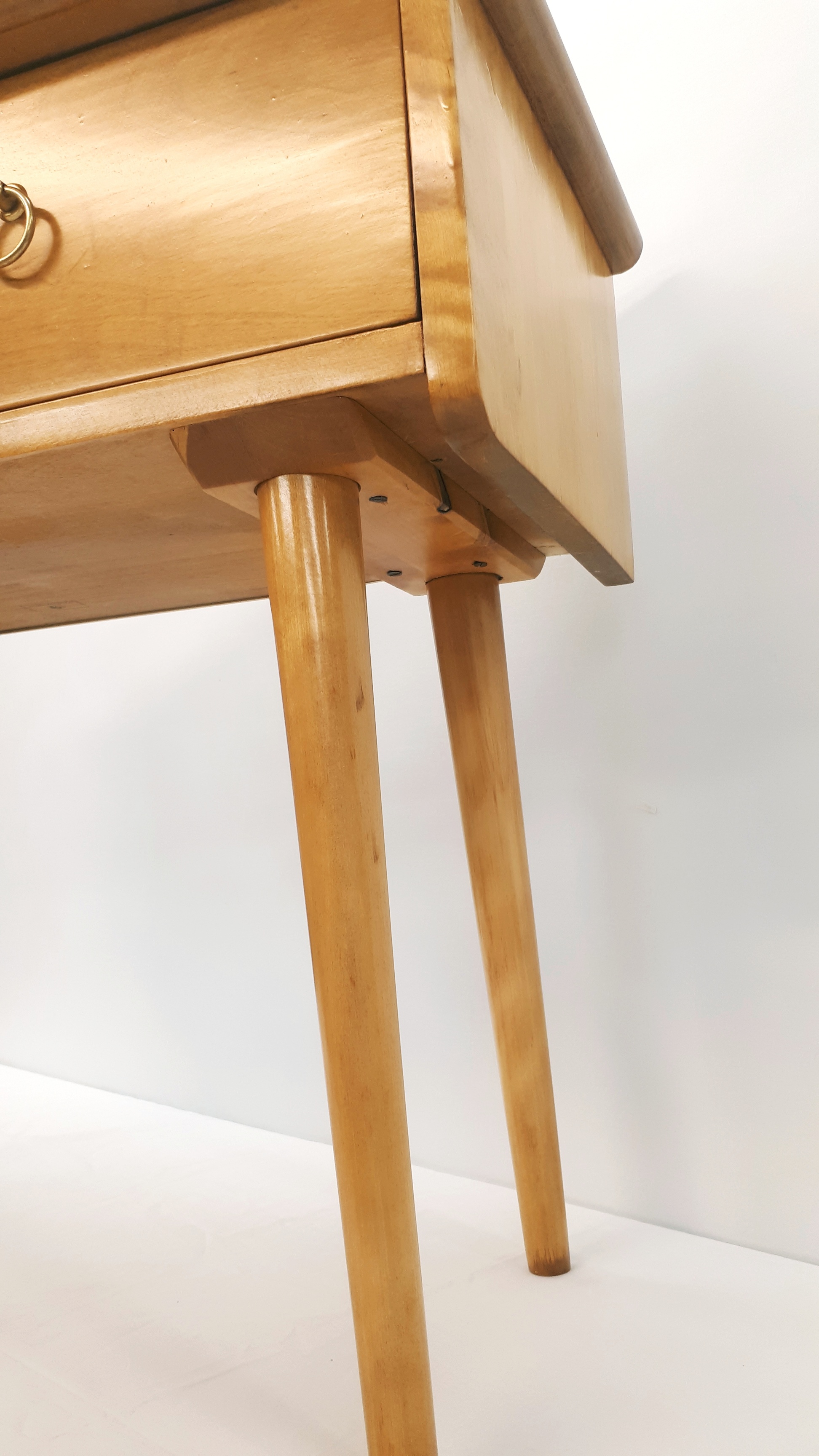 Takaosan irtohylly ja puupyörät eivät ole alkuperäiset. Hylly ja moitteetta toimivan pyörät on valmistettu alkuperäisen mallin mukaan 1950-luvun koivusta.