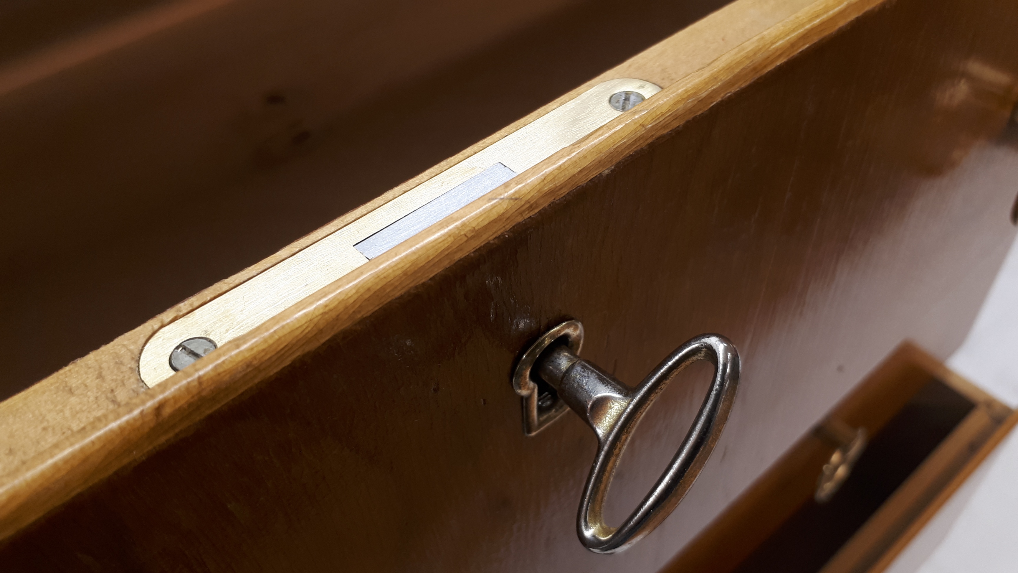 Laatikoston alkuperäinen lukitusmekanismi toimii: kaikki laatikot lukittuvat ylimmän laatikon ollessa kiinni. Lukko on huollettu. Avain oli kadonnut ja se on korvattu saman aikakauden vastaavalla avaimella.