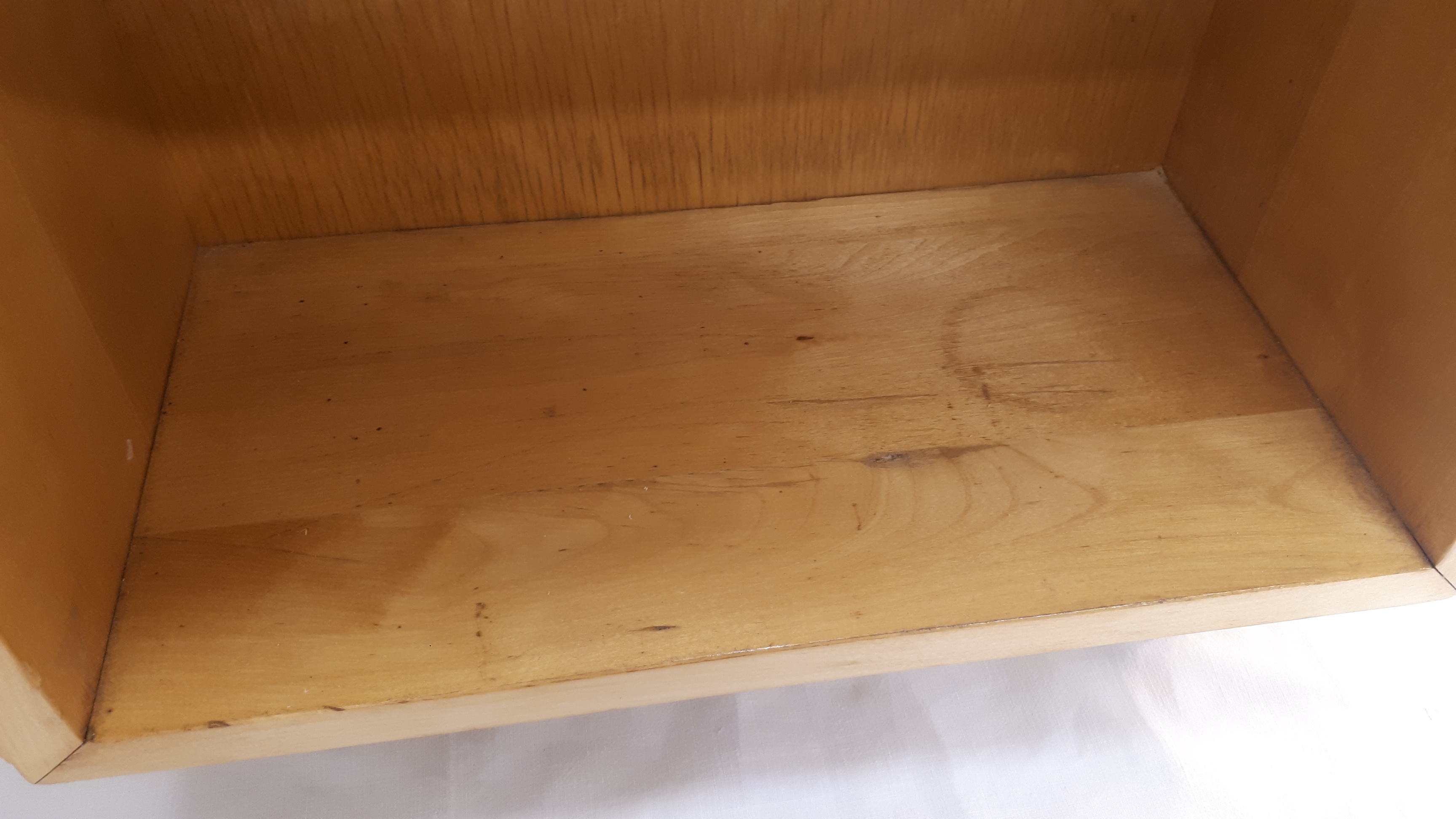 Laatikostossa on takahyllykössä häivytetty himmeä rengasmainen kosteusvaurio). Ylimmän laatikon oikeassa sisäyläkulmassa on punaisesta musteesta pieni läikkä.