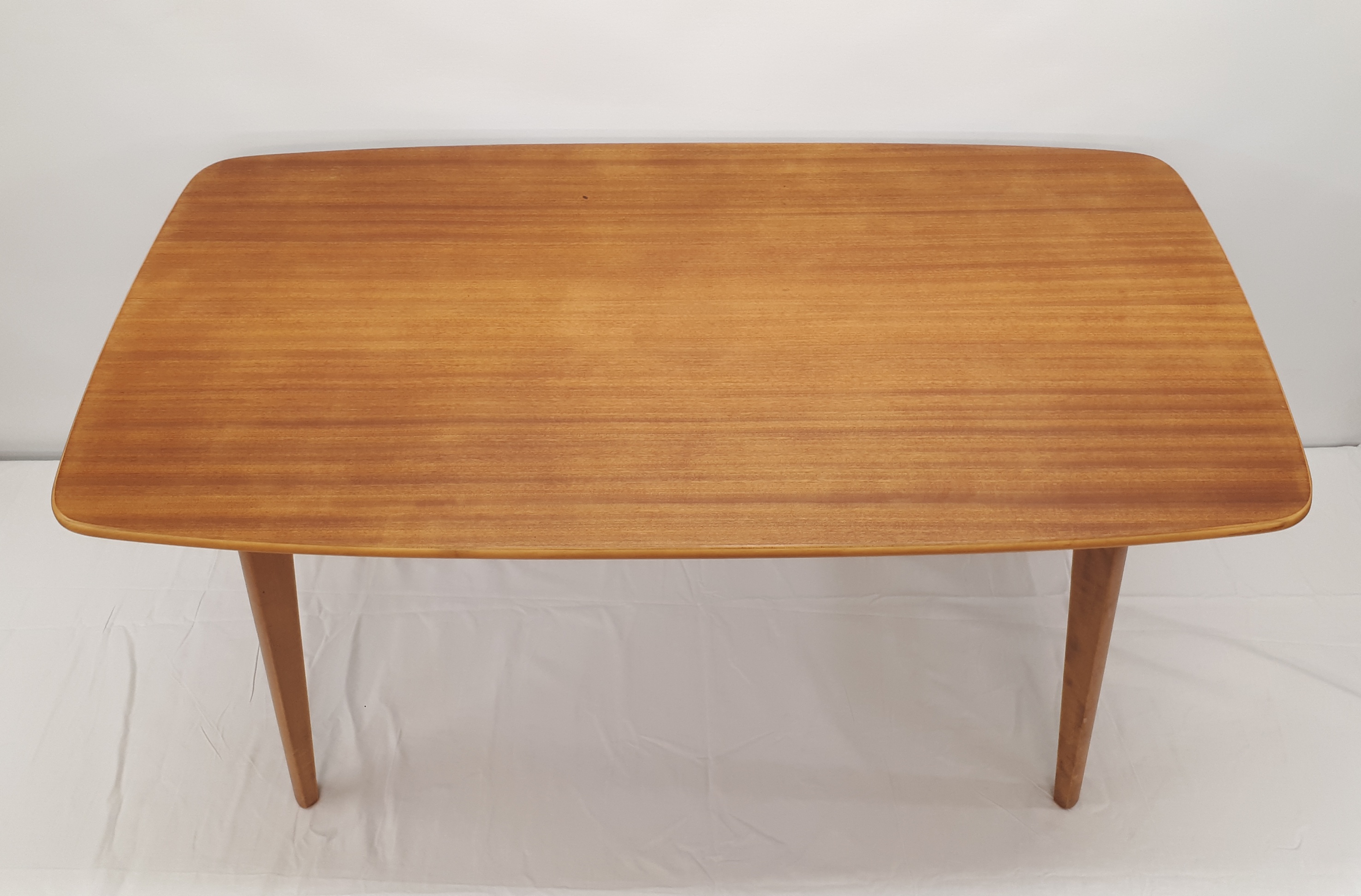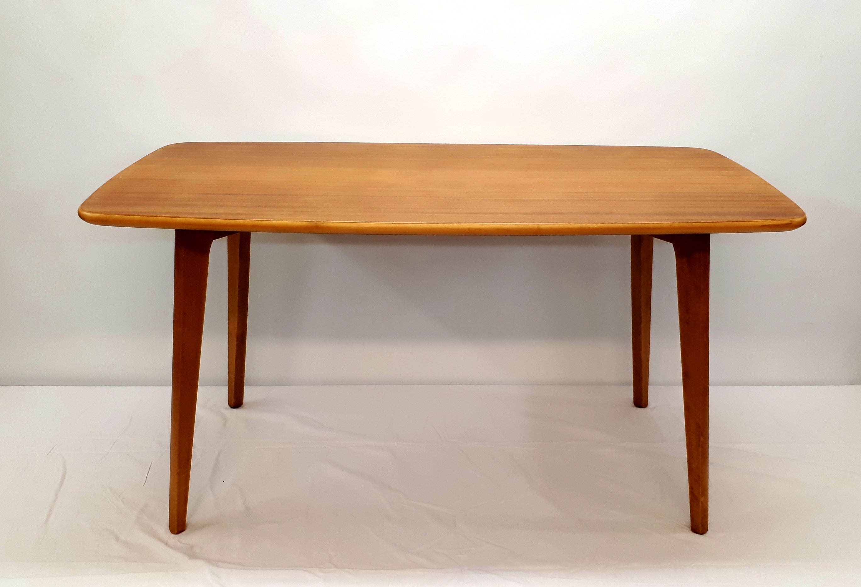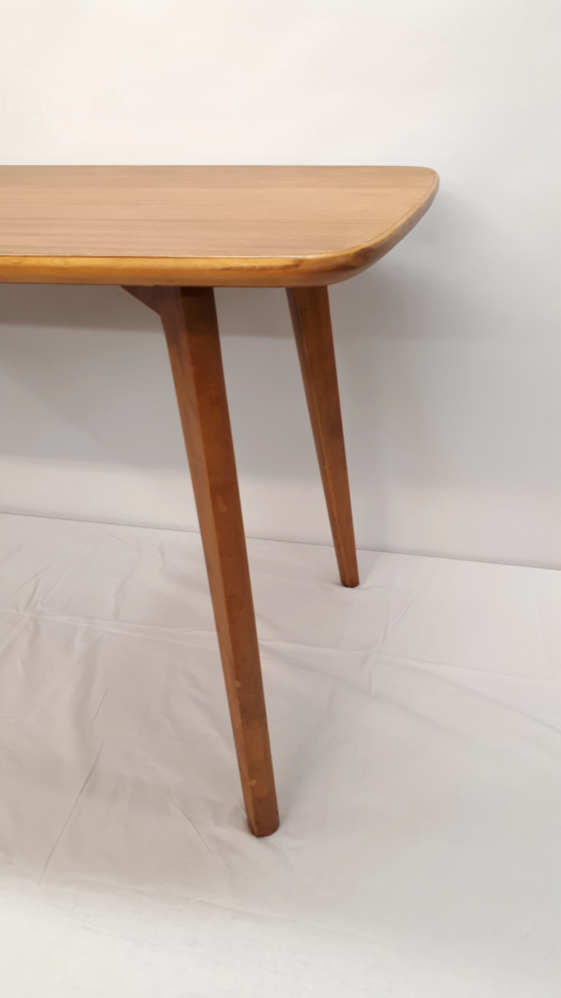 Erittäin hyväkuntoinen jatkettava Haimi Oy:n tiikkipöytä 1960-luvulta. Pöydän tiikkipinnassa ei ole patinaa, naarmuja, kulumia tai kolhuja. Pinnassa on yksi pieni tummentuma, muutoin pöytä lähes uutta vastaavassa kunnossa. 45cm leveä jatkopala on virheetön ja sen messinkisaranoitu mekanismi toimii moitteettomasti. Näyttävissä tiikkijaloissa on pähkinäpuiset ”tassut”.