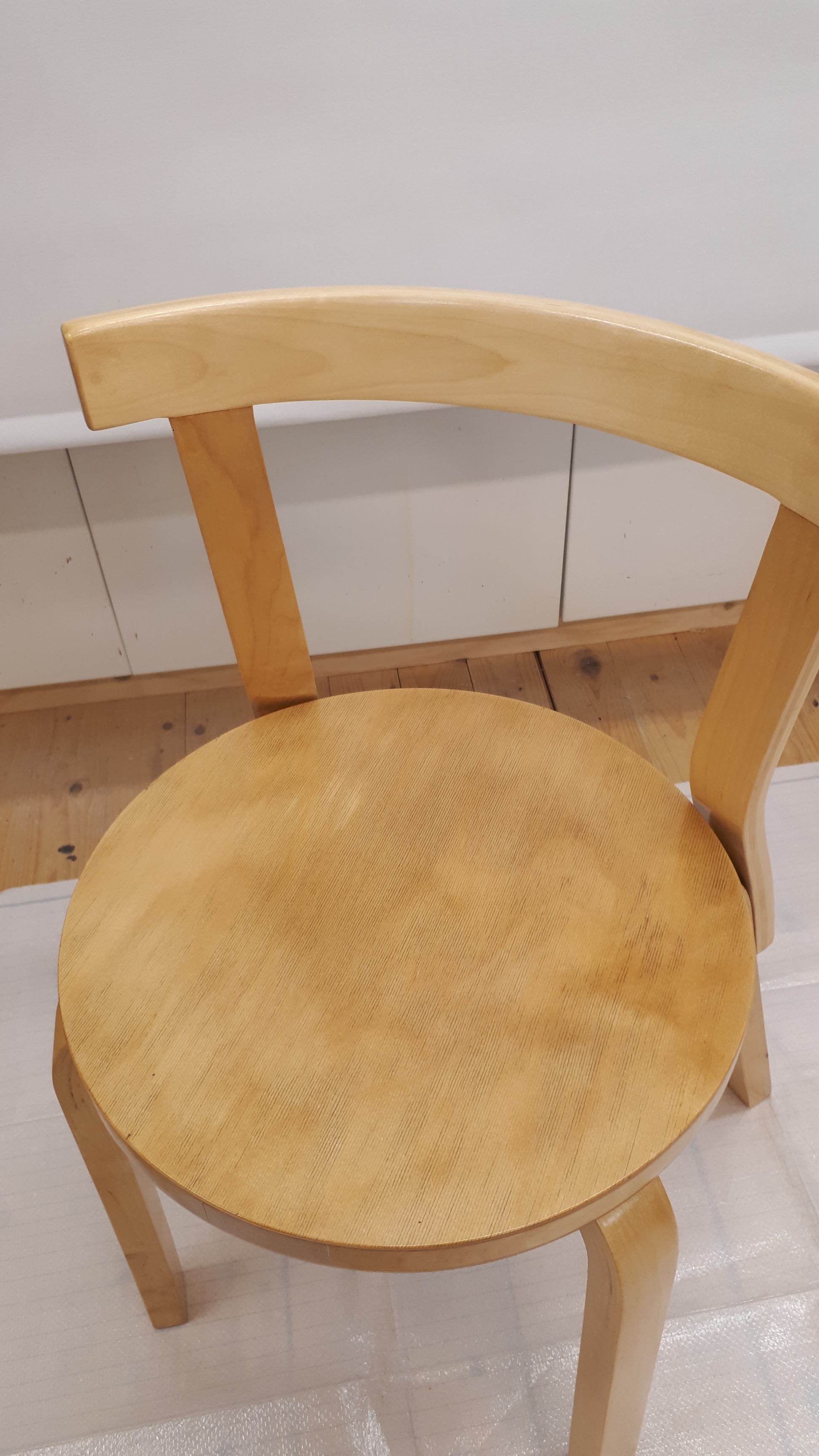 Kunnostettu, hyväkuntoinen Artekin 65 -koivutuoli. Tuolista on poistettu keinonahkainen istuinosan päällys. Lakkapinnat on uusittu ja pienet kolhut on siistitty. Lisäksi kaikki liitokset (talttaruuvit) on tarkistettu. Tukeva, hyväkuntoinen tuoli.