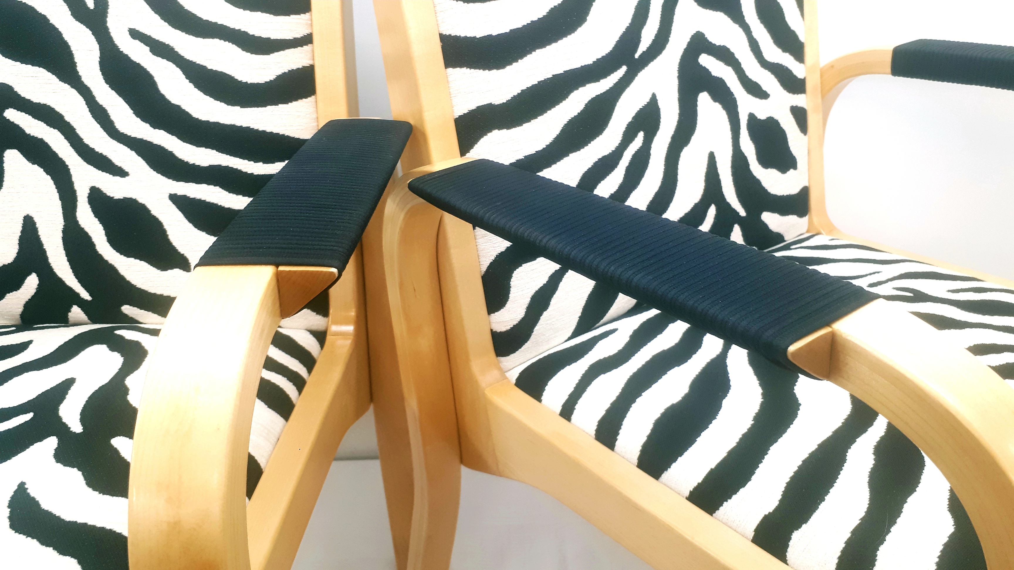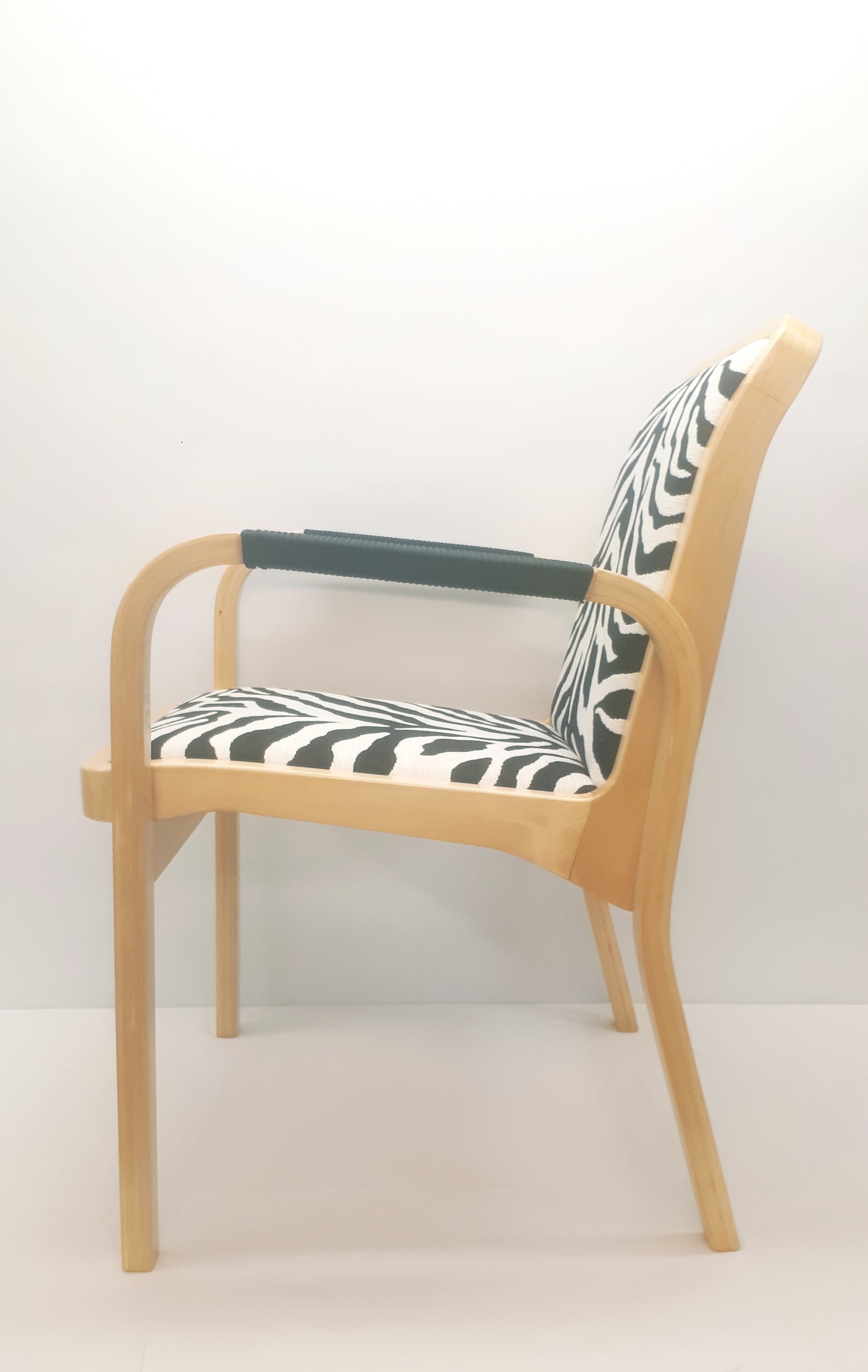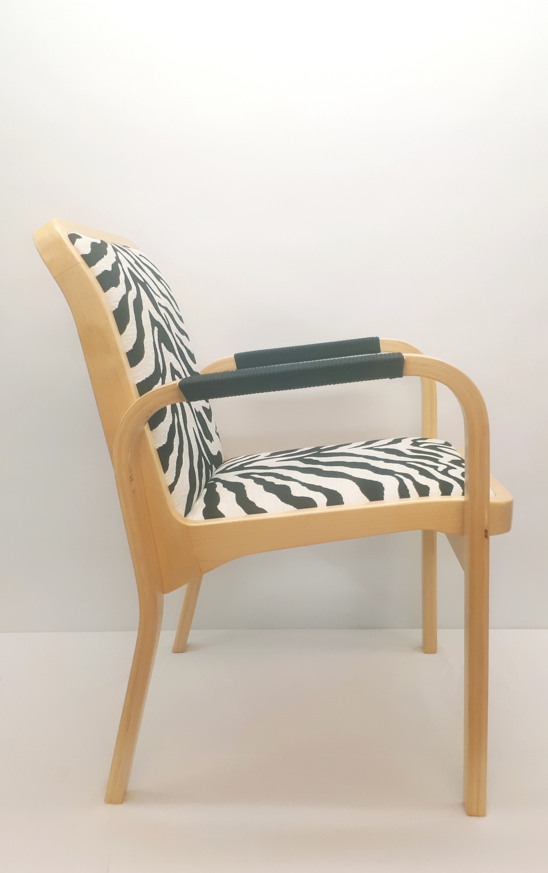 Kunnostetut Artekin E45 tuolit. Tuolien lakkapinnat on uusittu. Tuolit on verhoiltu ja käsinojien mustat materiaalit on vaihdettu uusiin. (ei Artekin tuotteita).