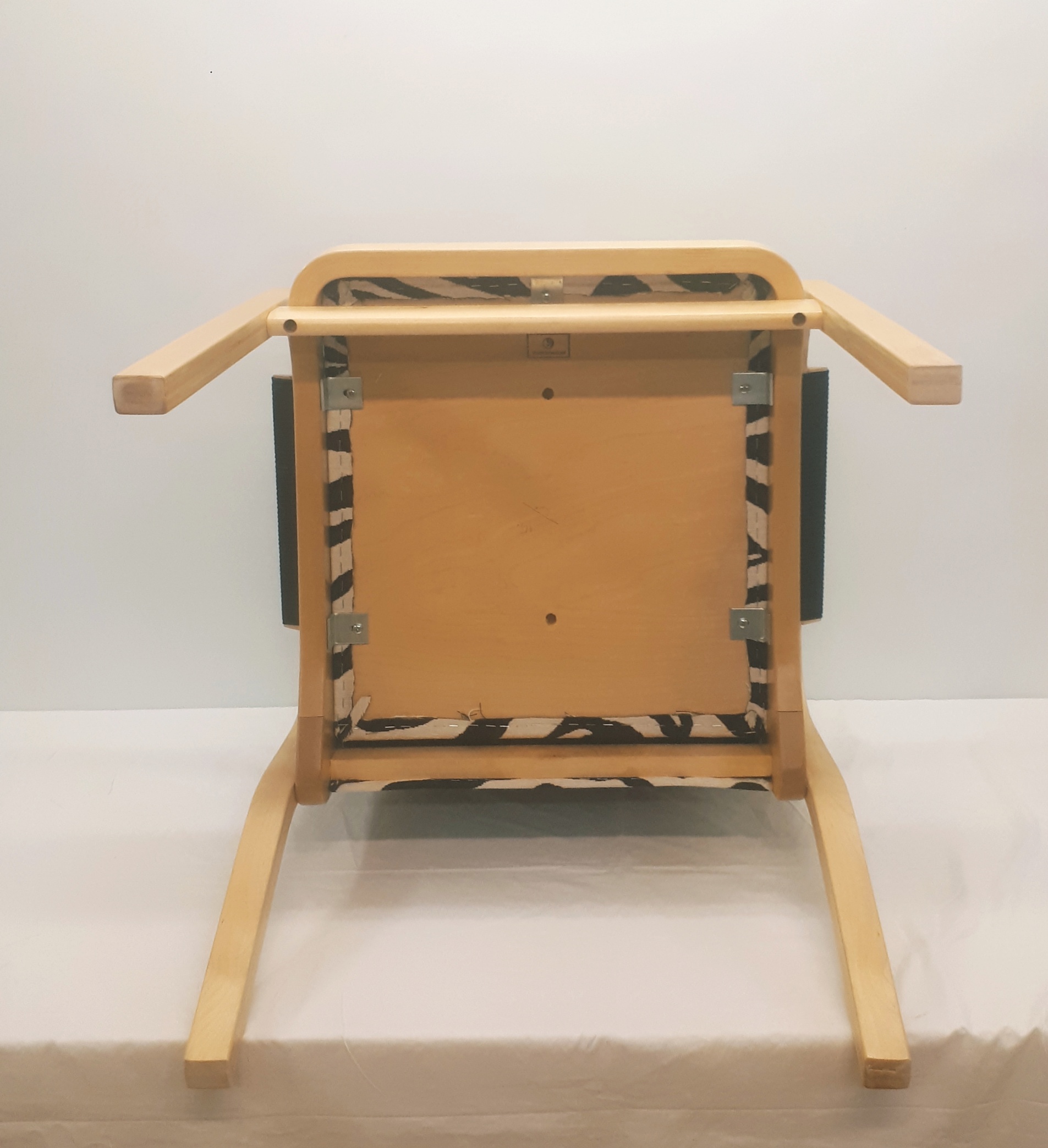 Artekin 615 satulavyötuoli mustilla satulavöillä. Artekin leima. Satulavyöt ovat ehjiä ja kaikki liitokset ovat tukevia. Tuolin lakatussa koivurungossa on joitakin pintavaurioita.