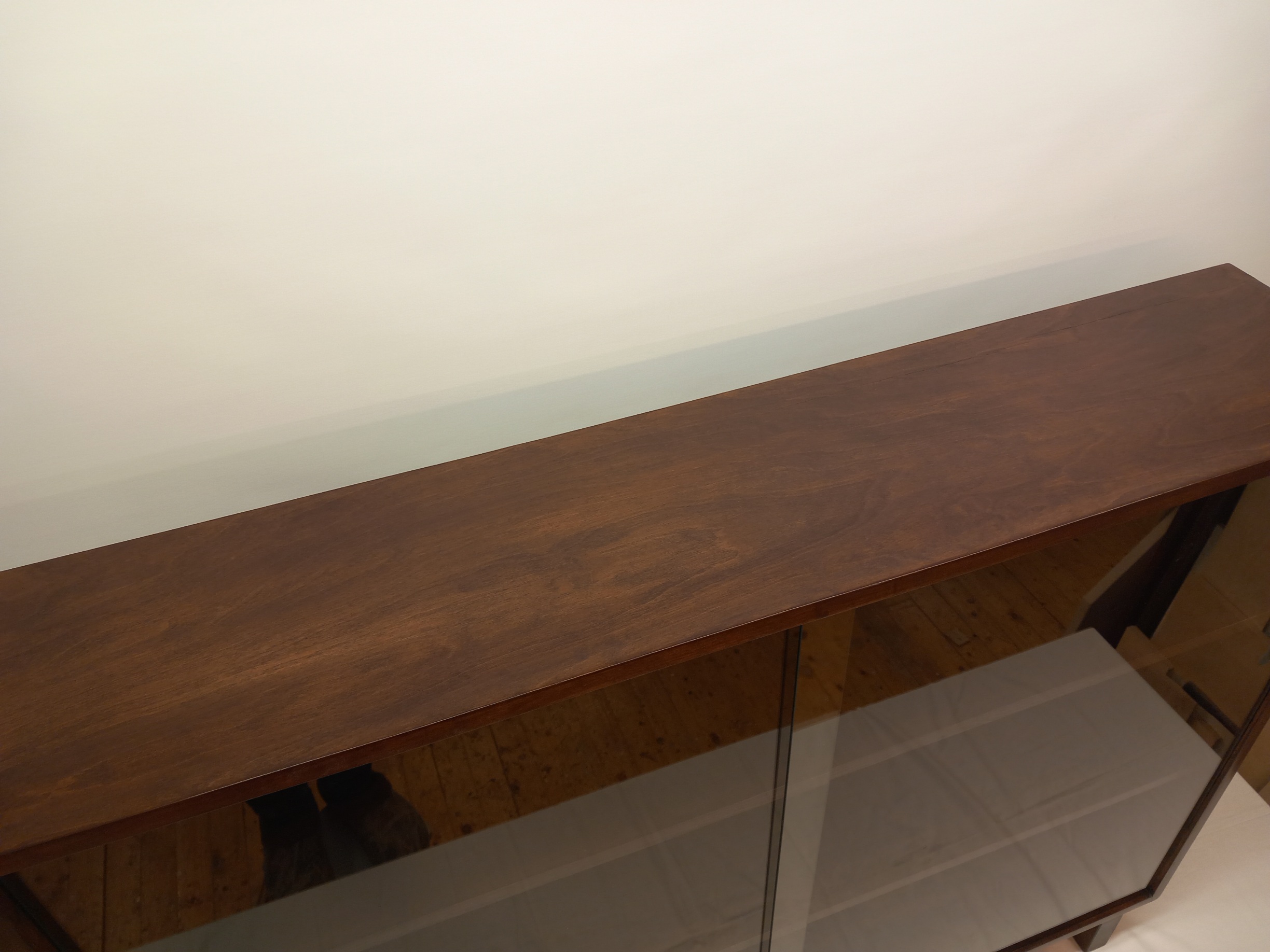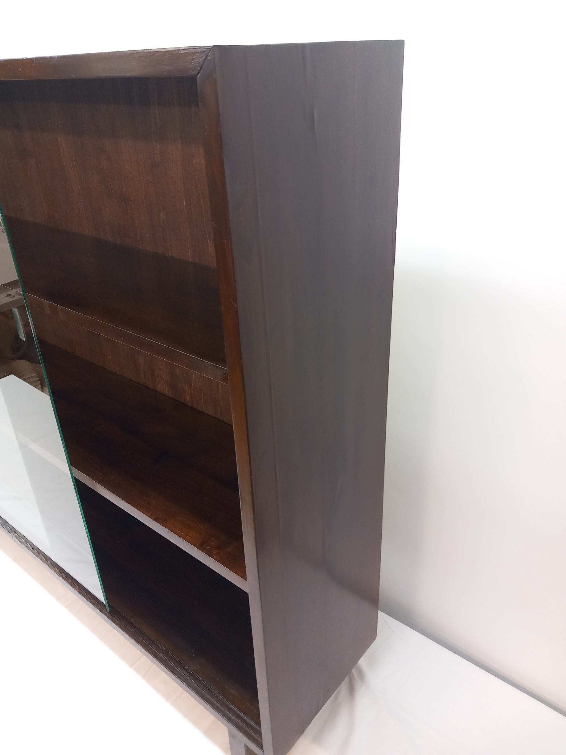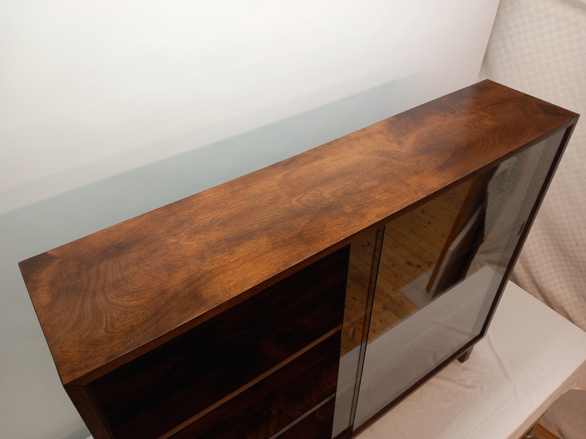 Kunnostettu, erinomaisessa kunnossa oleva kotimainen kirjakaappi/-vitriini 1940-luvulta. Kaappiin mahtuu 3,5 hyllymetriä kirjoja.