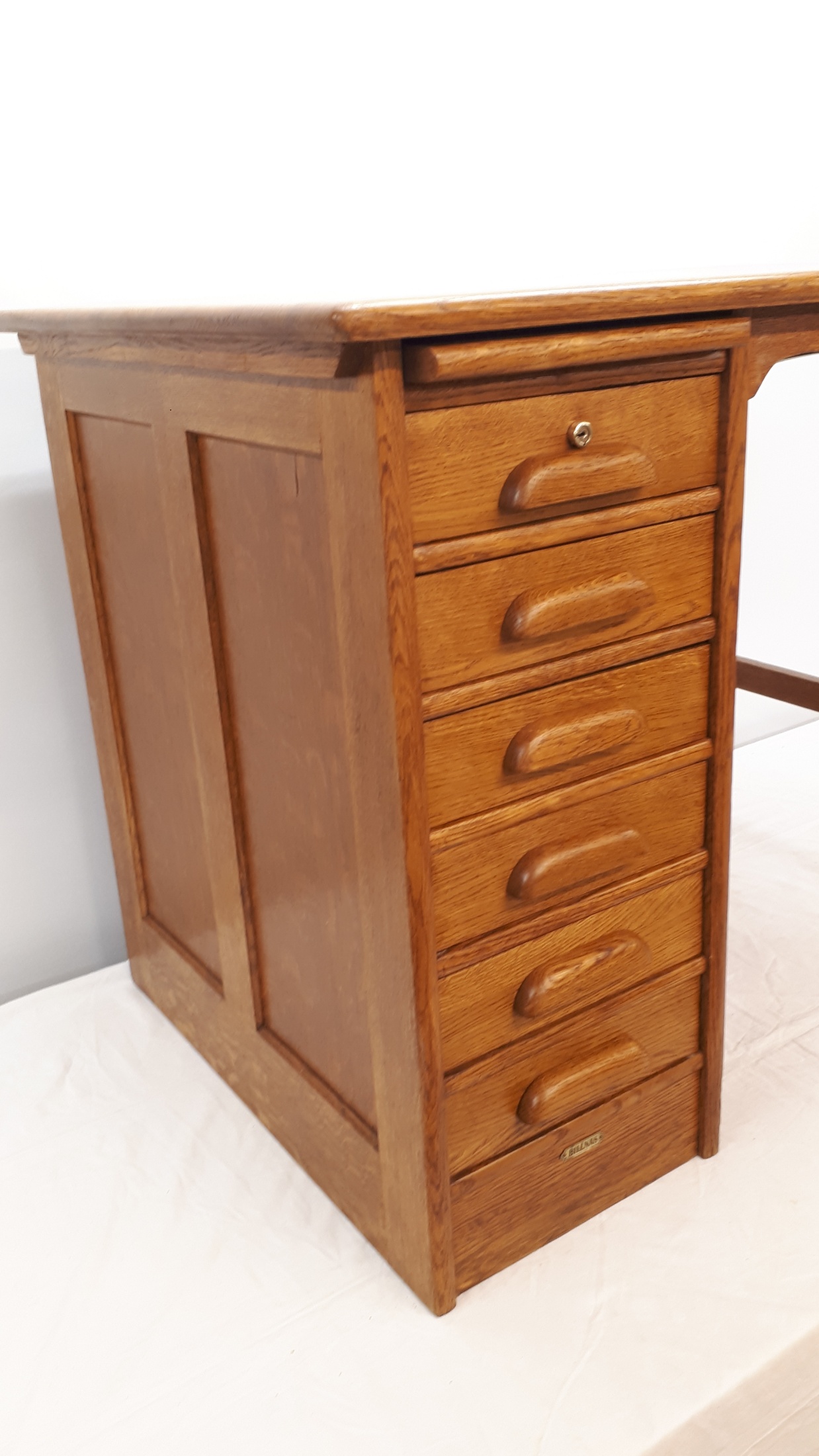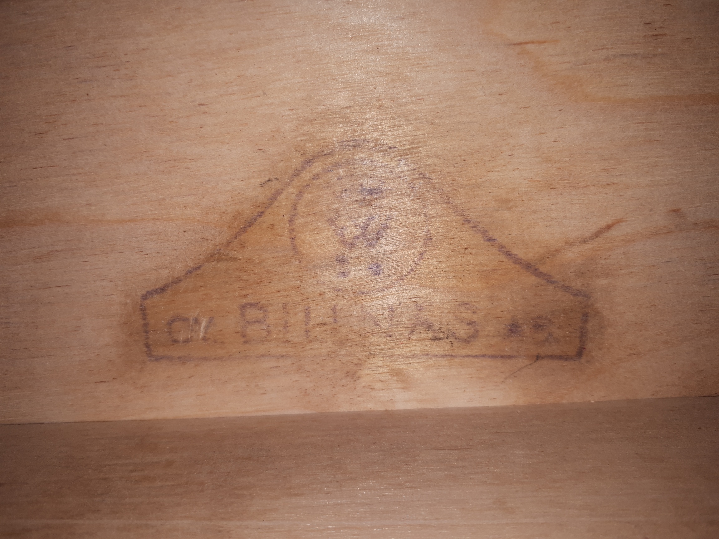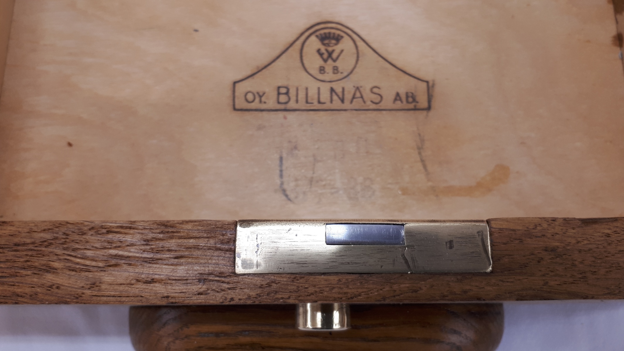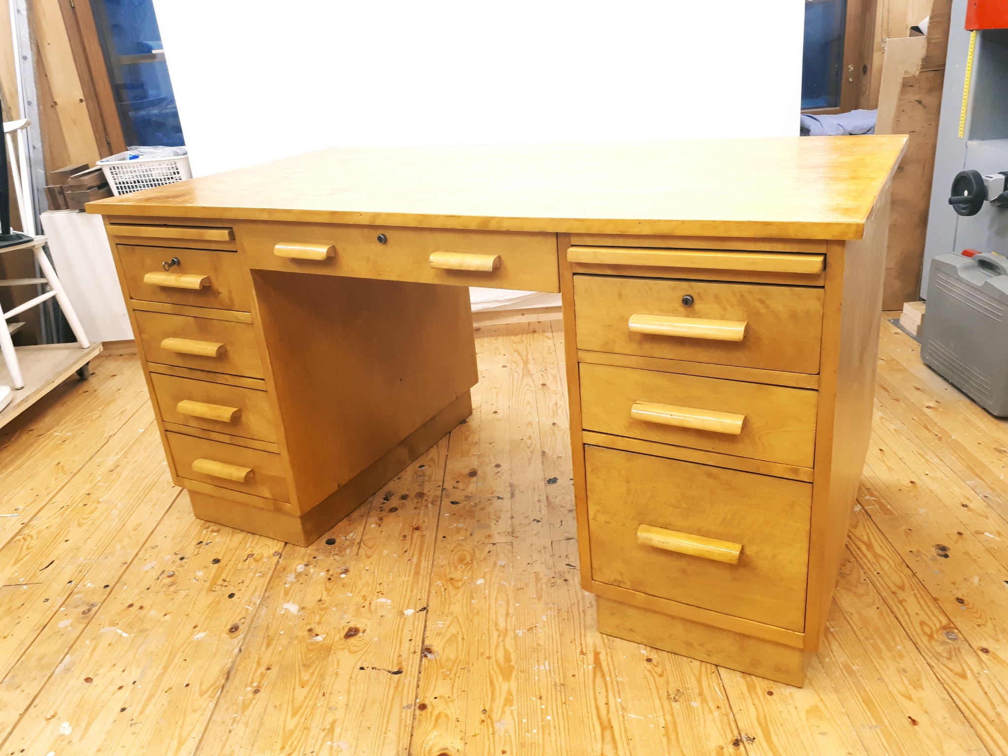 Kunnostettu, iso (190x98cm) Billnäsin kirjoituspöytä. Pöytä on tammipetsattu ja lakattu nitroselluloosalakalla. Pöydässä on kaksi laatikostoa, joissa ylimpinä ovat ulosvedettävät tasot. Lukkojen metallipinnat on kiillotettu. Lukkoihin ei ole avainta.