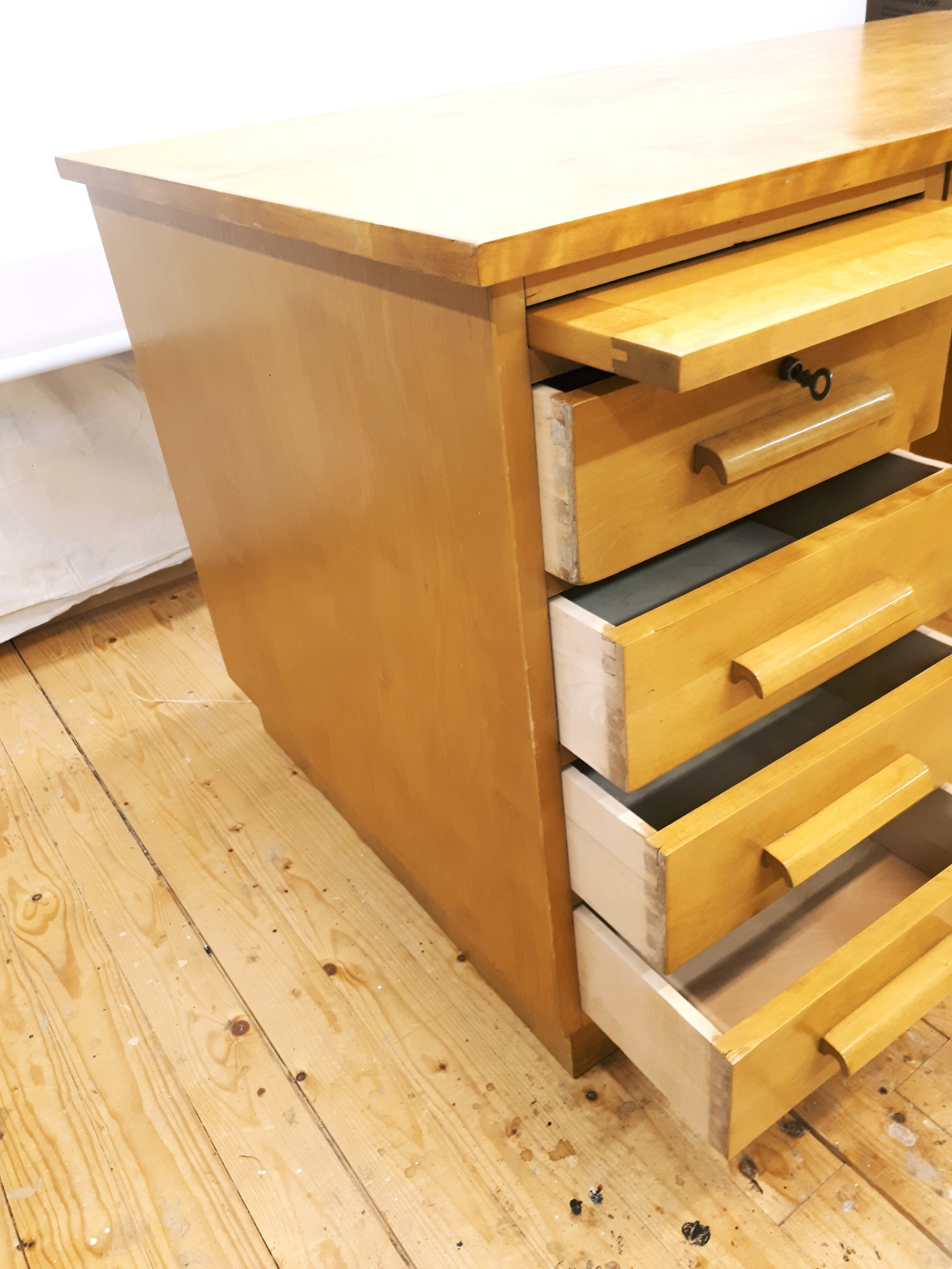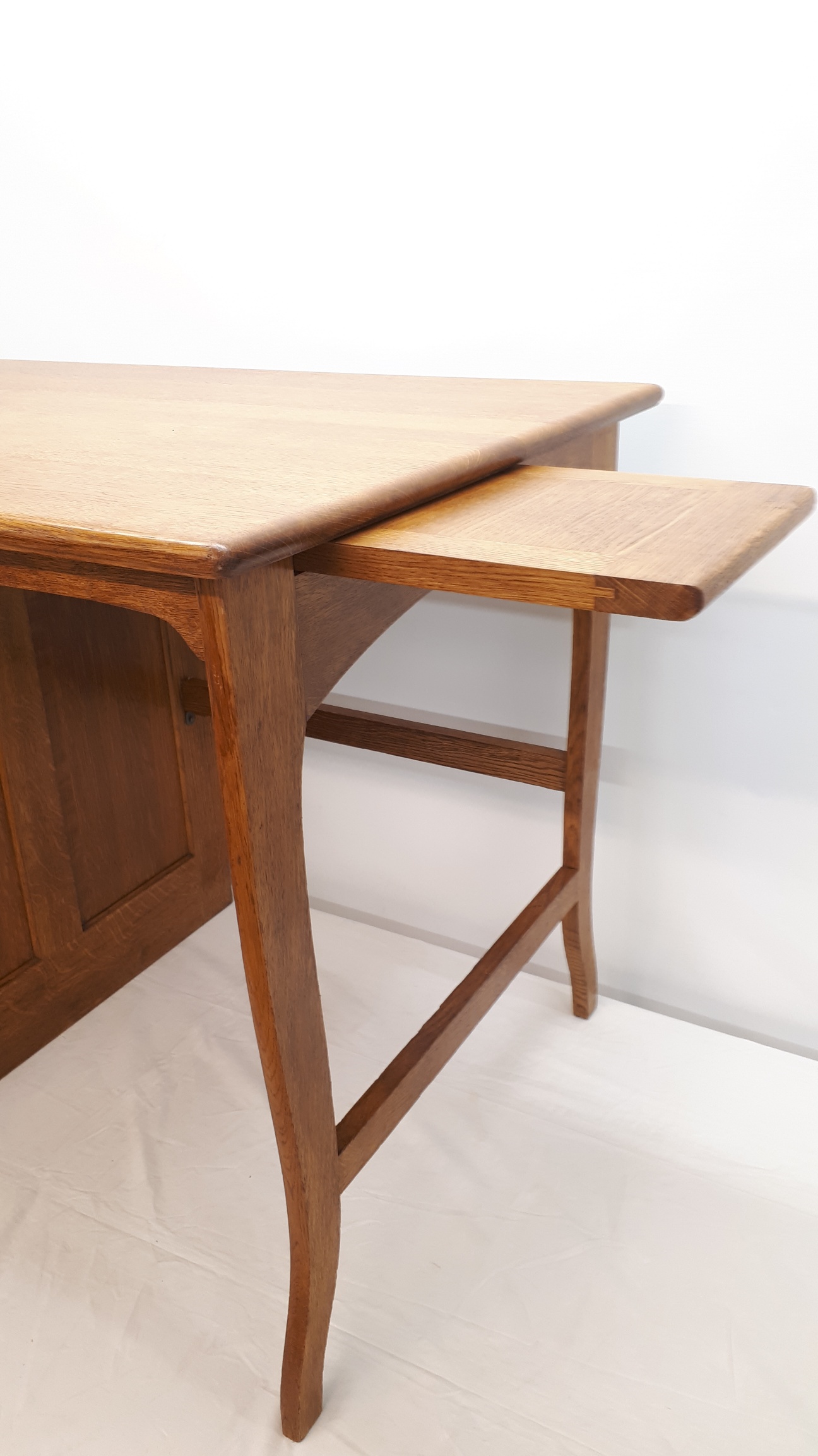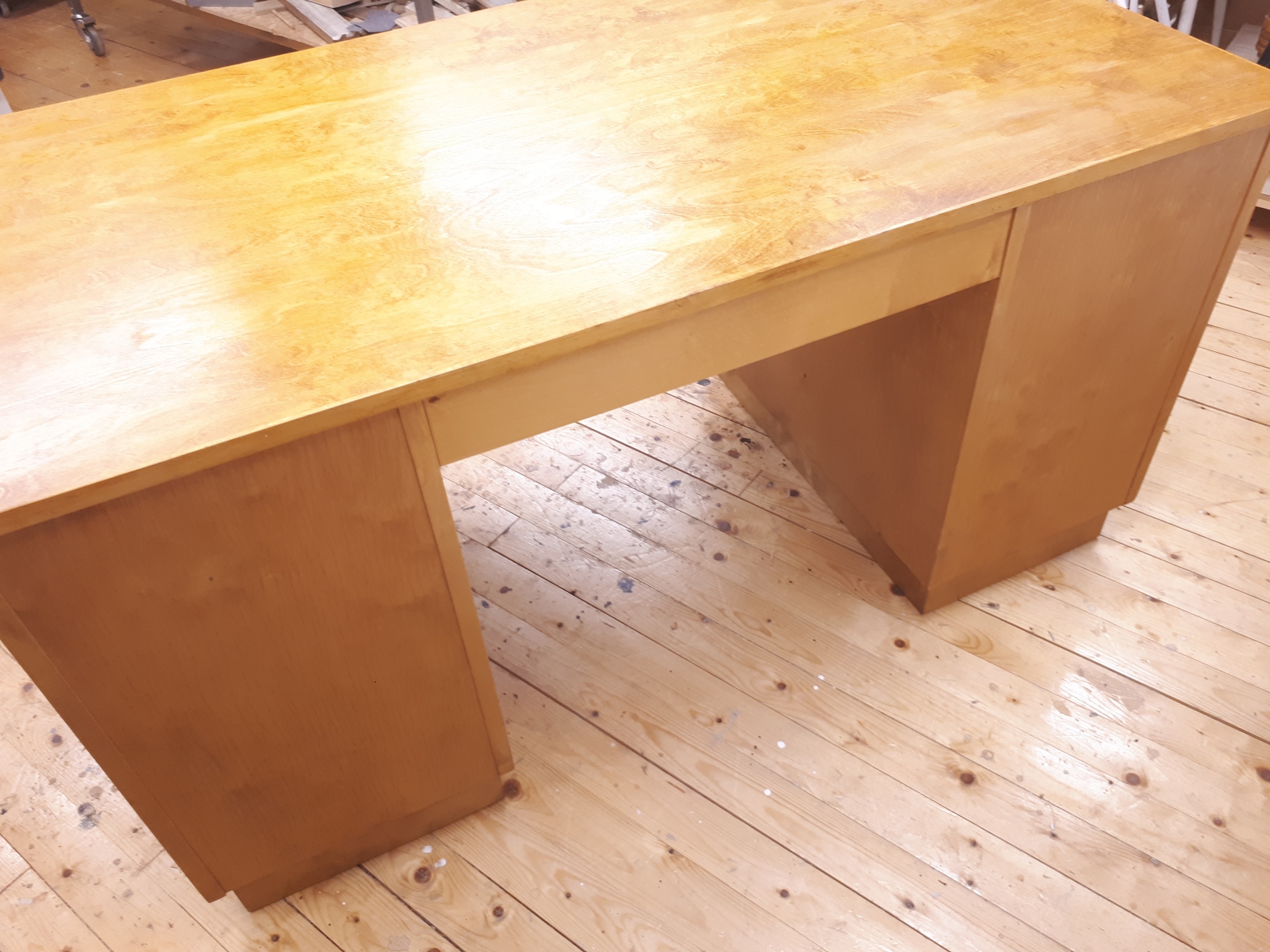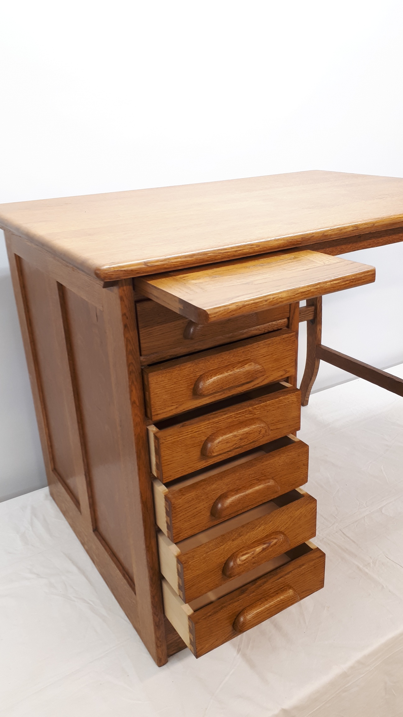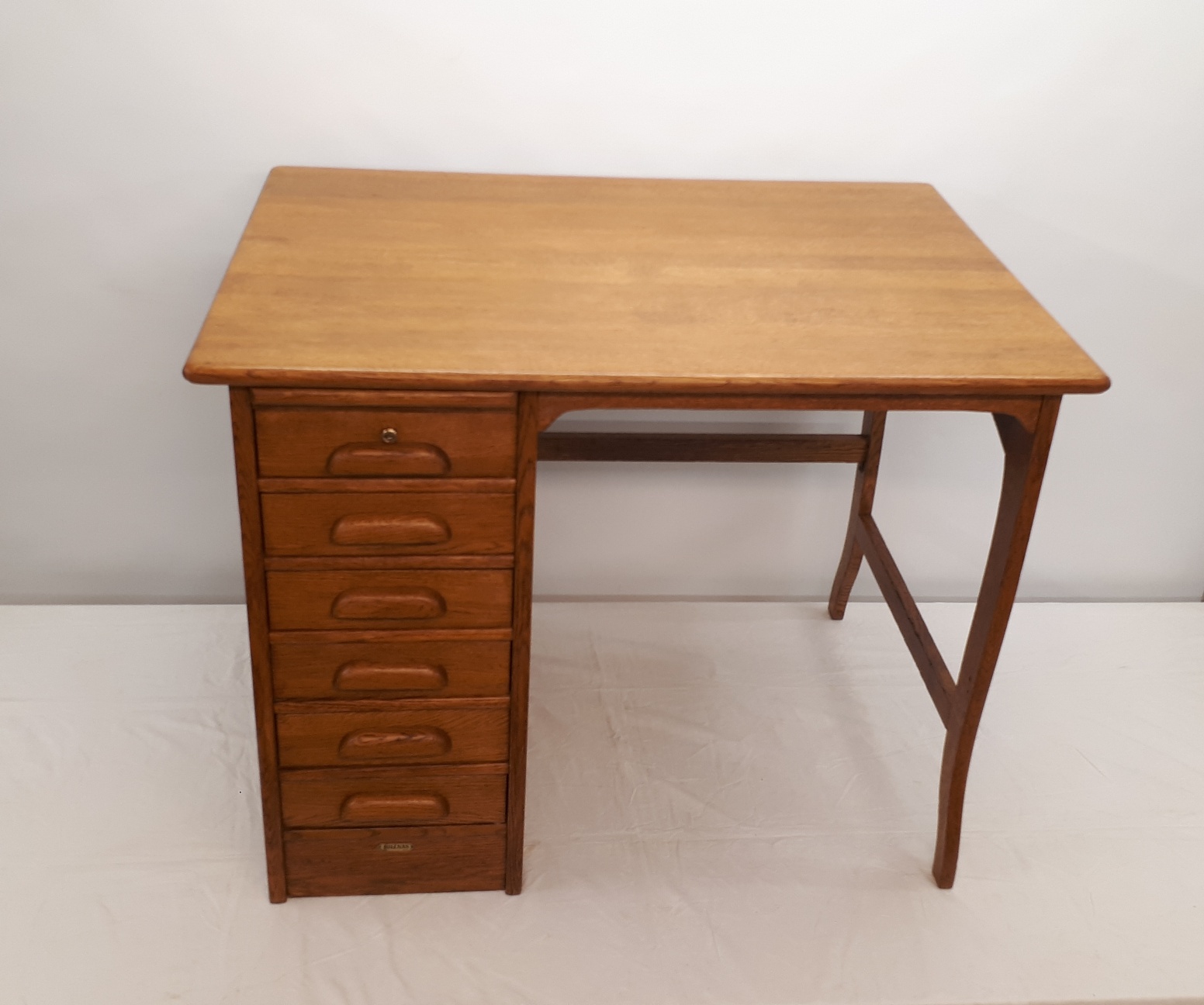 Kunnostettu, iso (190x98cm) Billnäsin kirjoituspöytä. Pöytä on tammipetsattu ja lakattu nitroselluloosalakalla. Pöydässä on kaksi laatikostoa, joissa ylimpinä ovat ulosvedettävät tasot. Lukkojen metallipinnat on kiillotettu. Lukkoihin ei ole avainta.