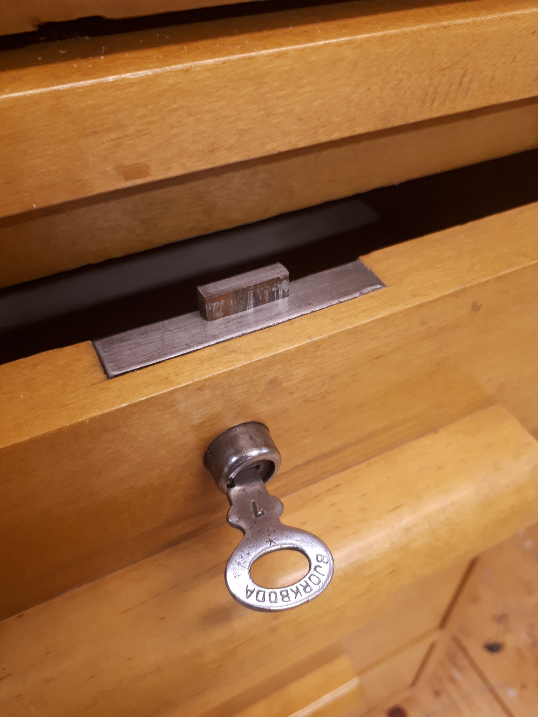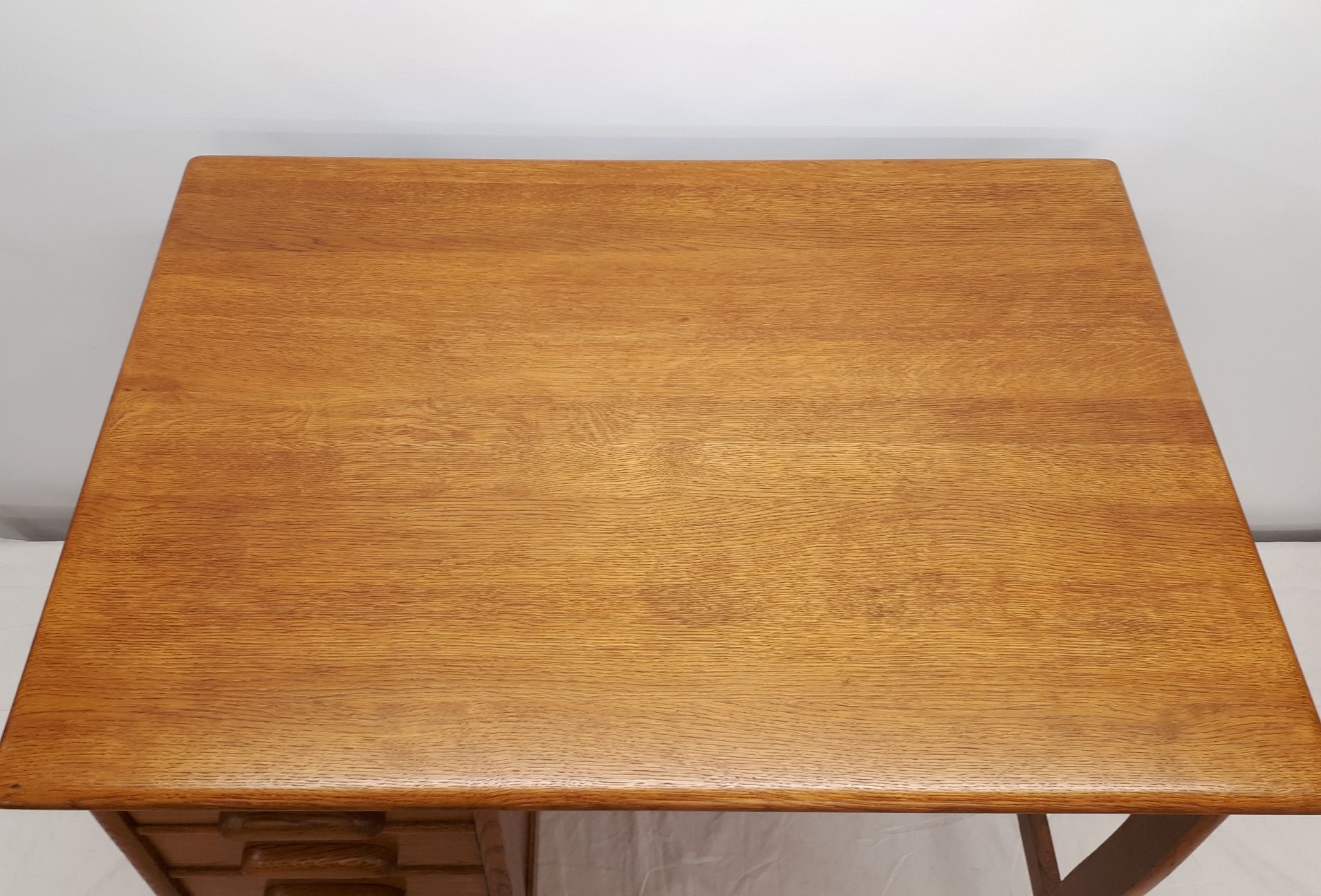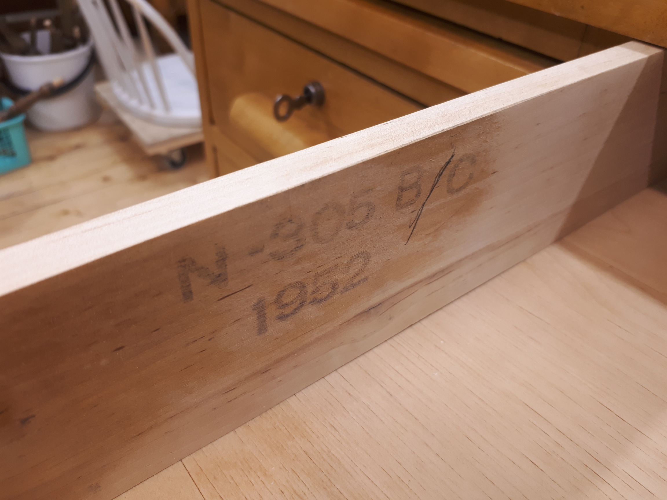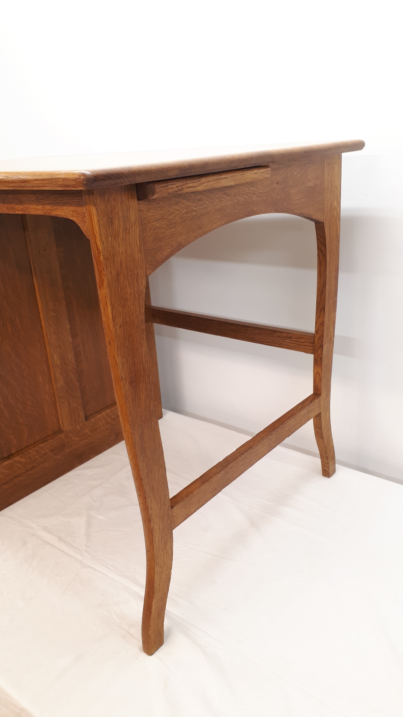 Kunnostettu, iso (190x98cm) Billnäsin kirjoituspöytä. Pöytä on tammipetsattu ja lakattu nitroselluloosalakalla. Pöydässä on kaksi laatikostoa, joissa ylimpinä ovat ulosvedettävät tasot. Lukkojen metallipinnat on kiillotettu. Lukkoihin ei ole avainta.