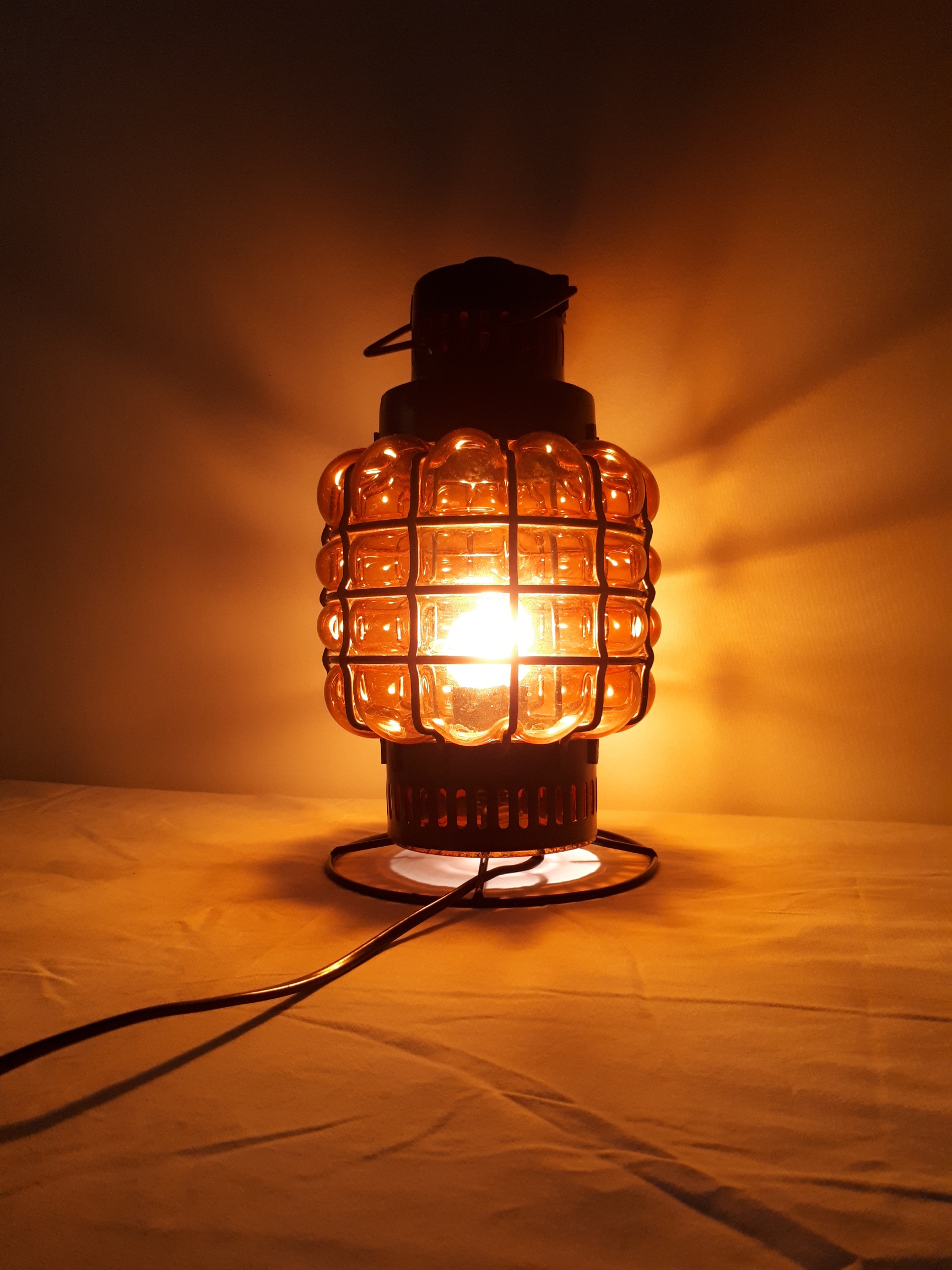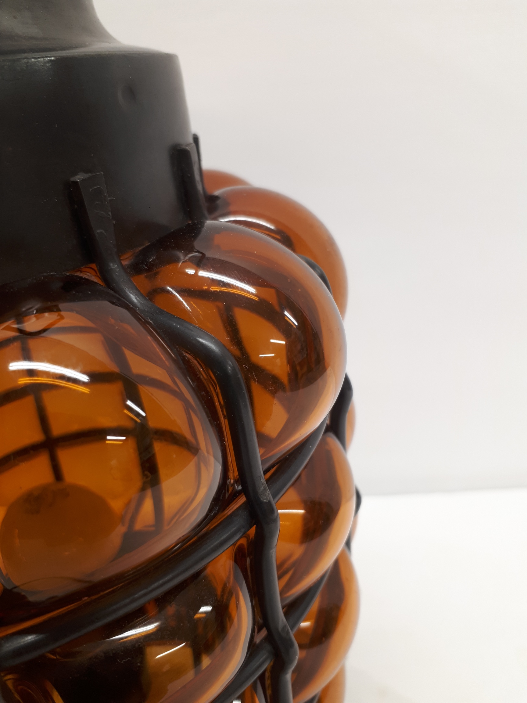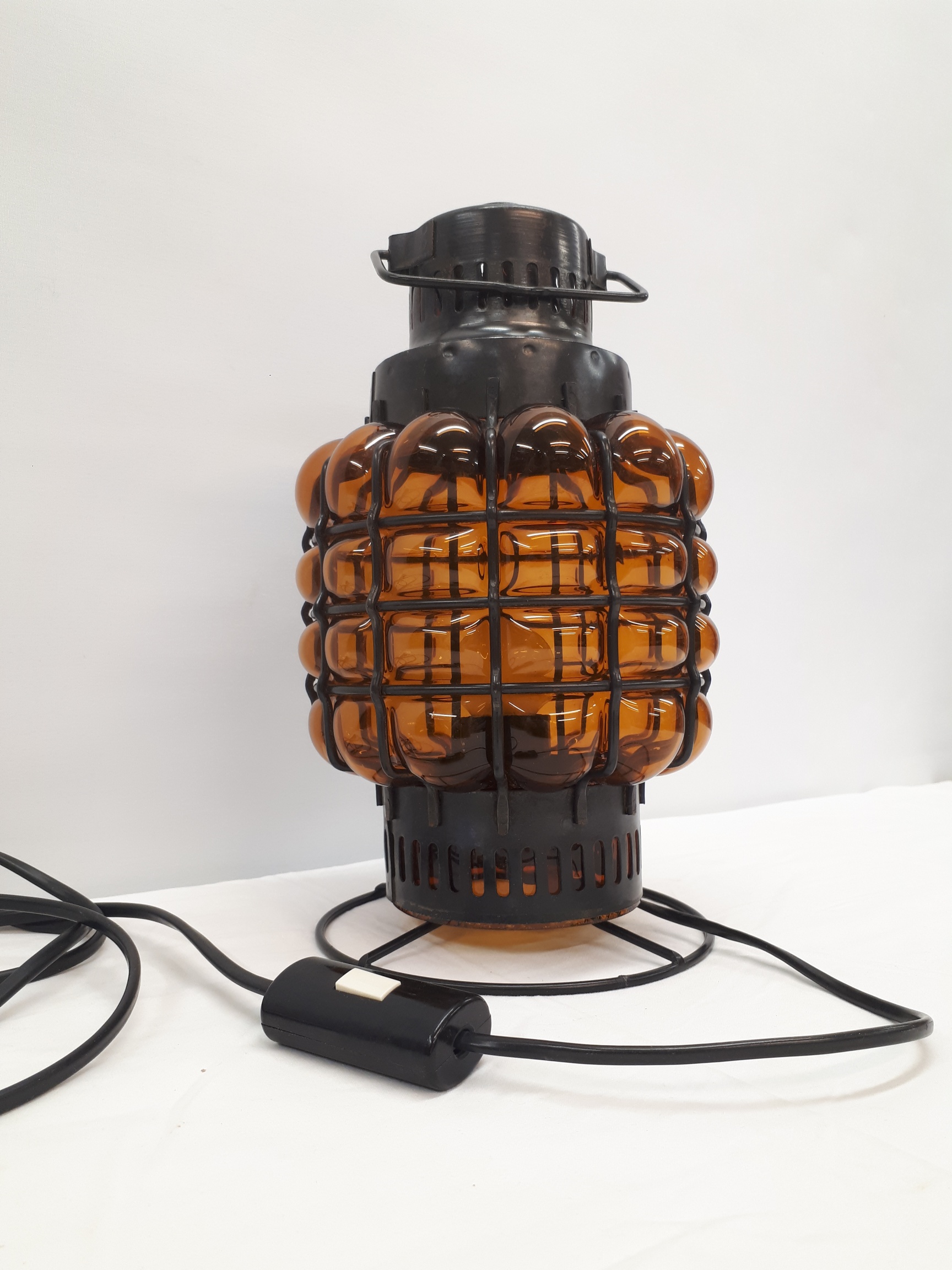 Uniikki 1960-luvun vintage-valaisin, jonka oranssi lasisisus on puhallettu kuumana mustan metallirungon sisälle (https://www.youtube.com/watch?v=6tuecm9-uLc&t=13s).