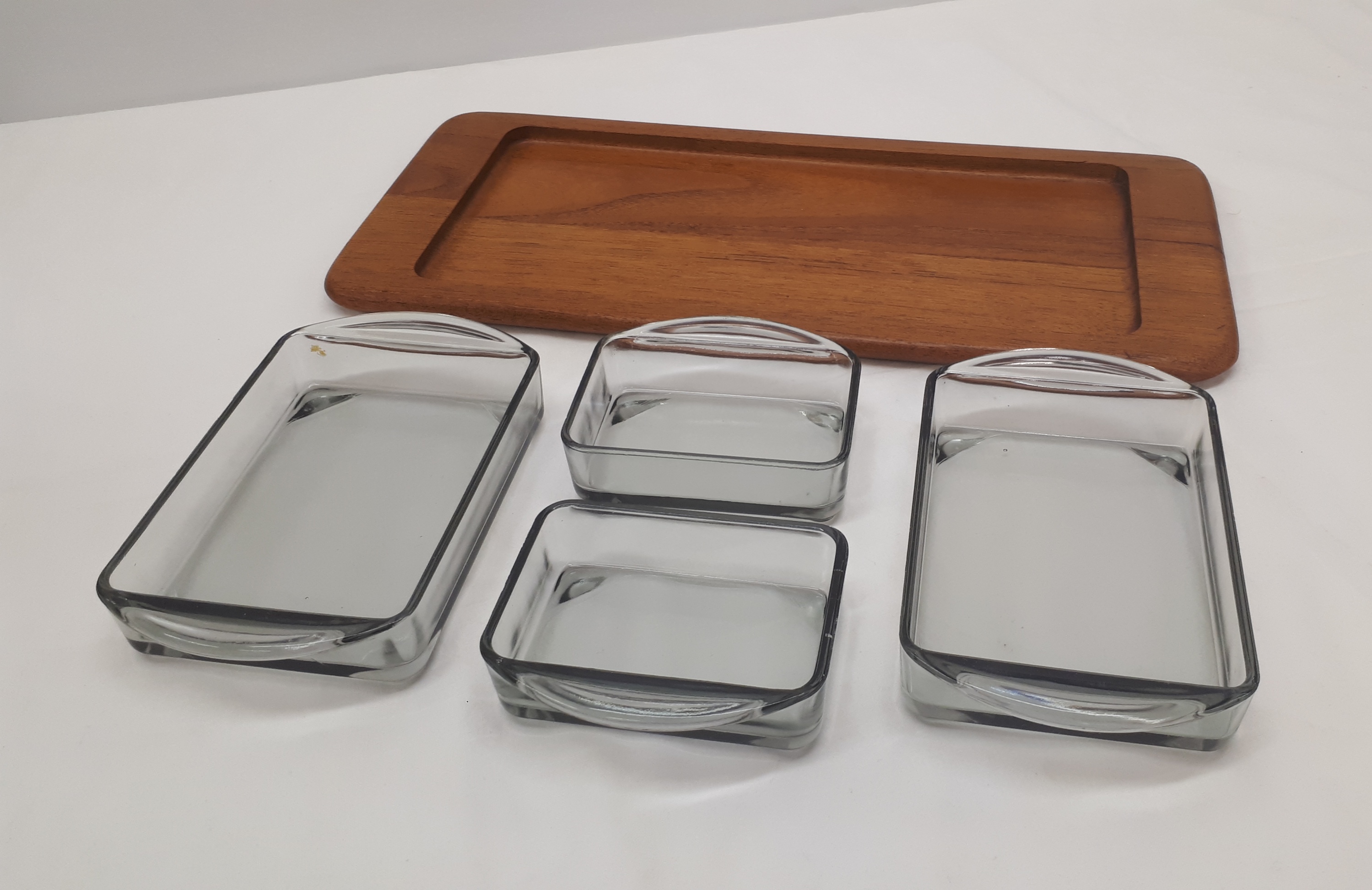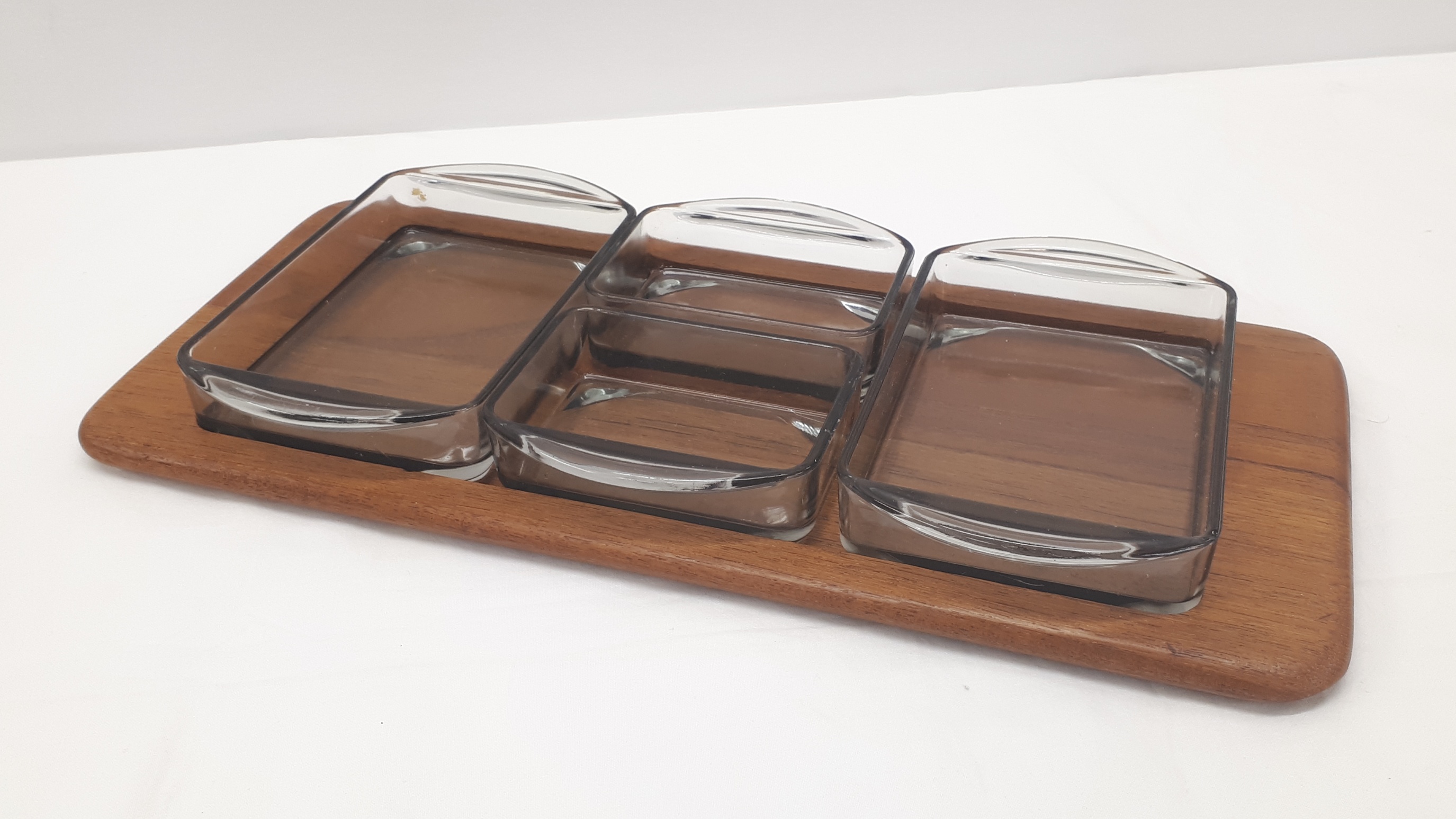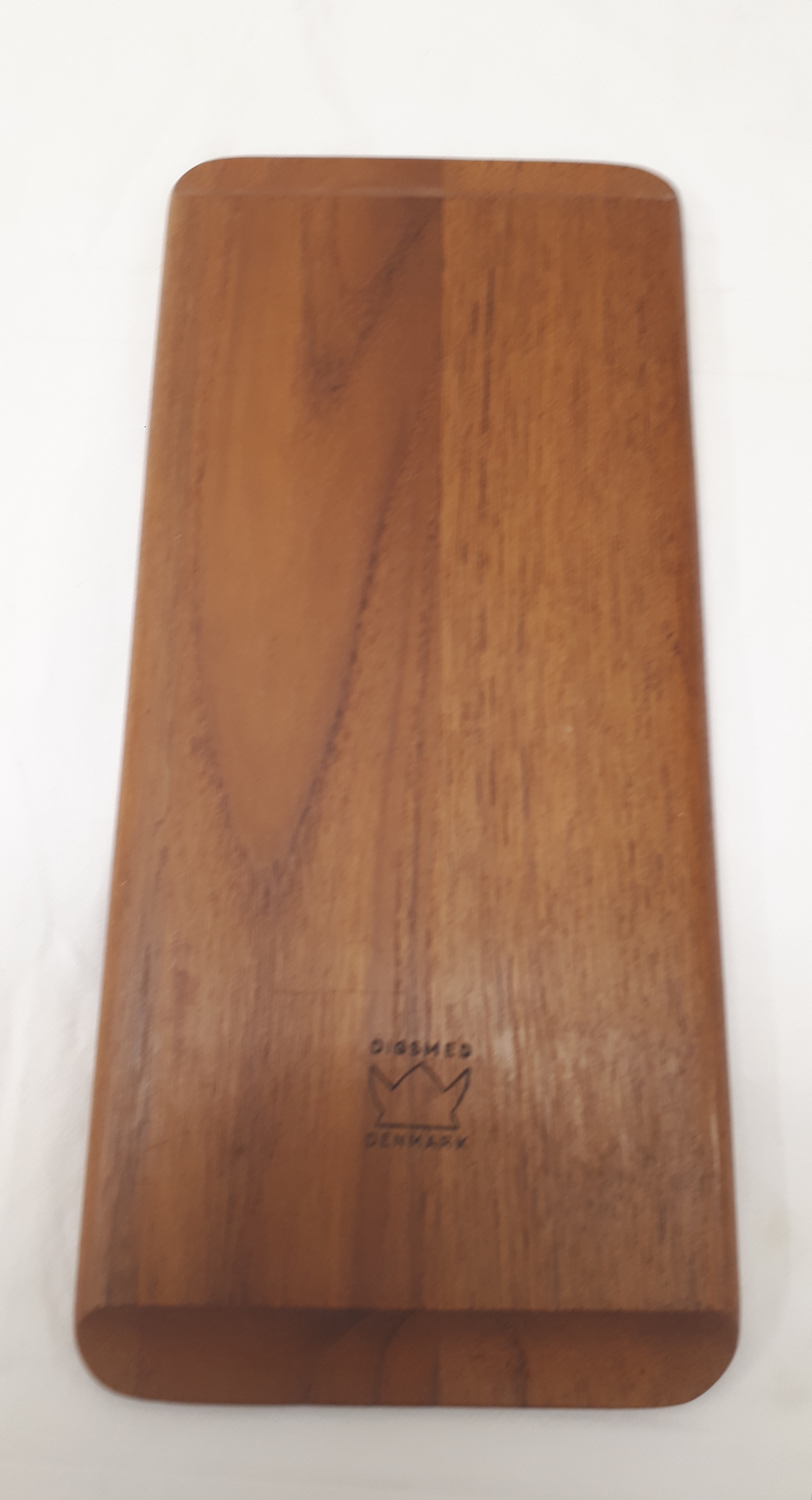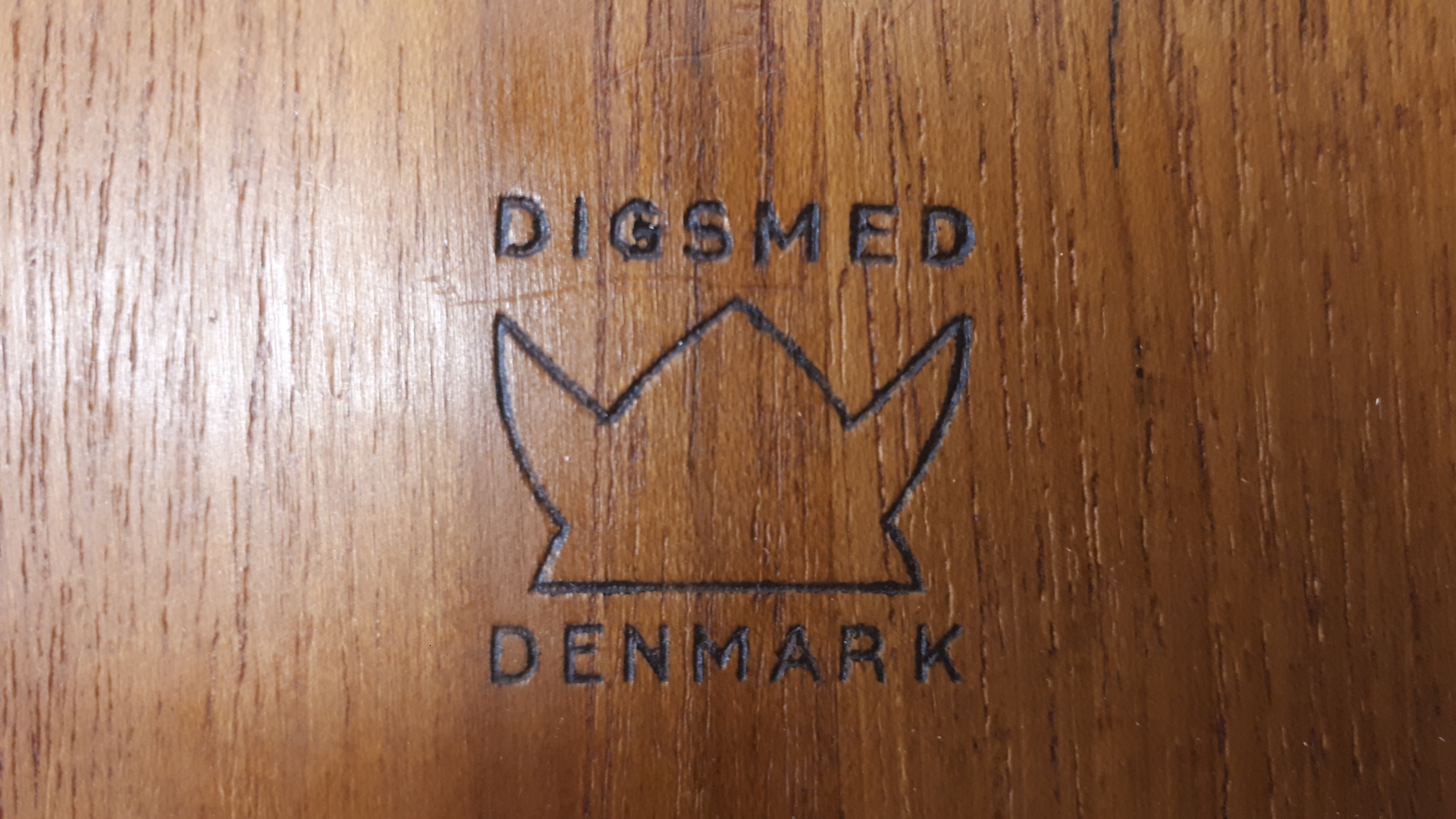Kunnostettu Digsmedin pyörivä (ns. Lazy Susan) tiikkitarjoitin Holmegaardin lasikipoilla. Tarjottimen pohjassa on Digsmedin leima vuodelta 1964.
