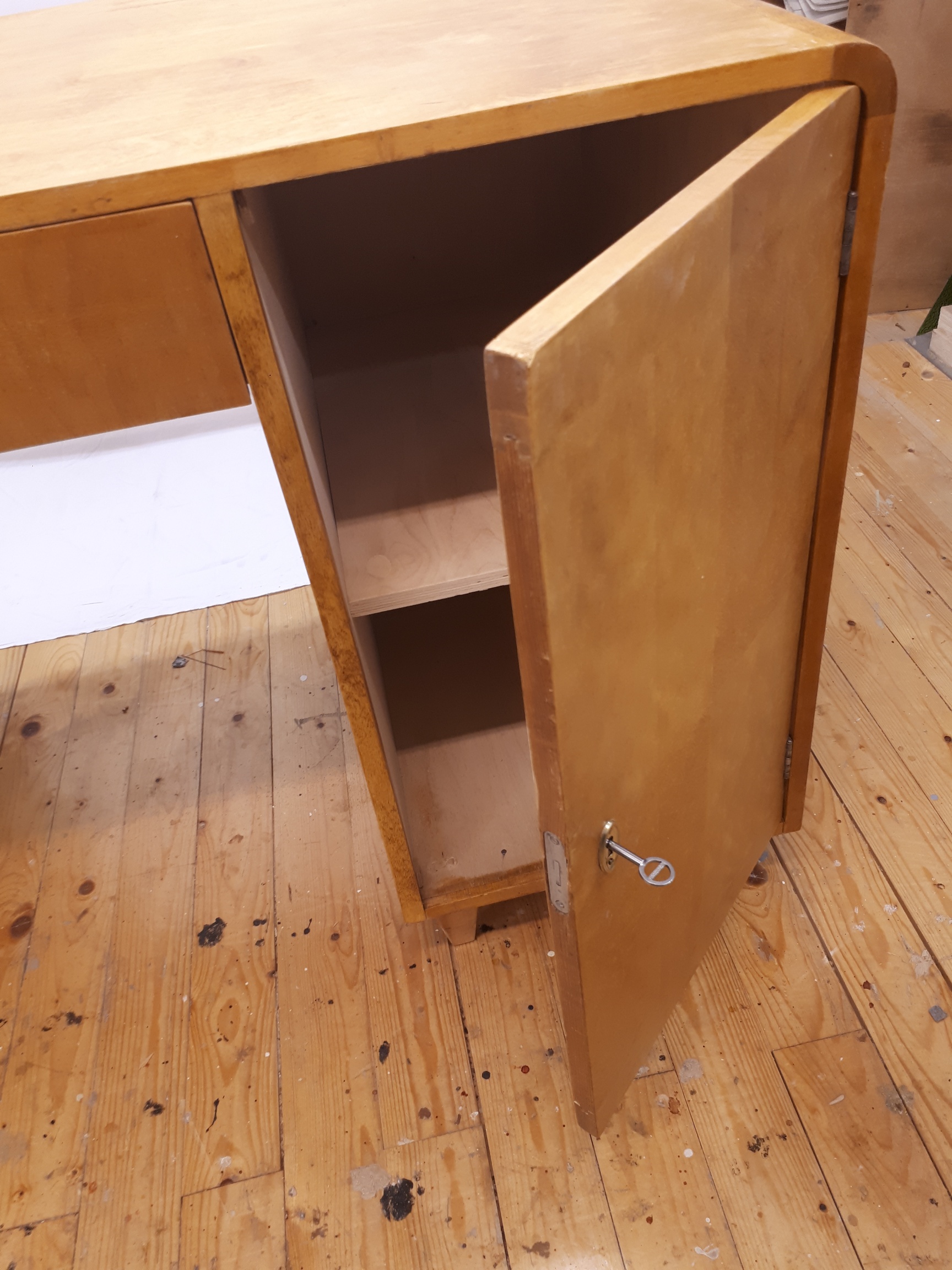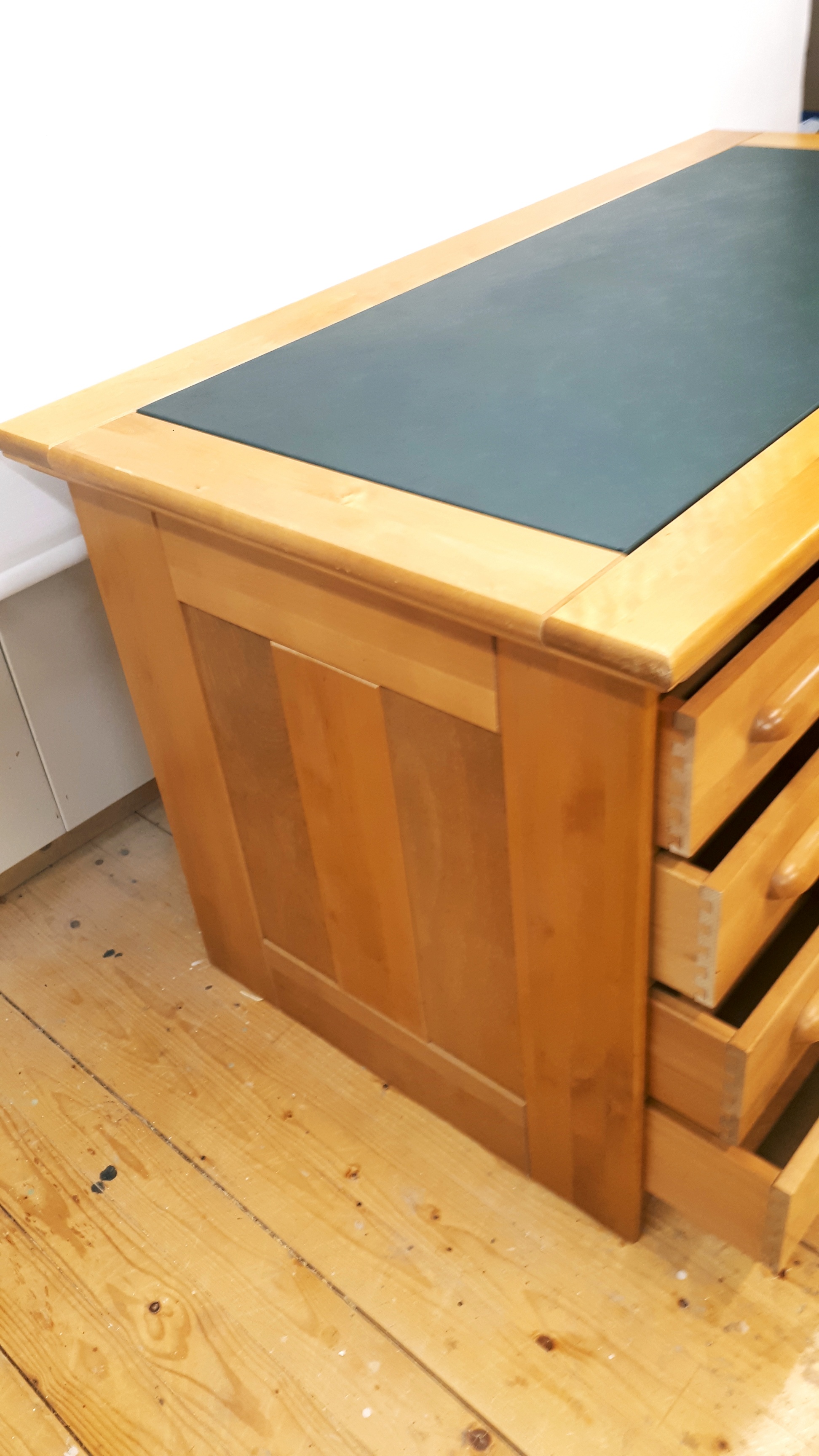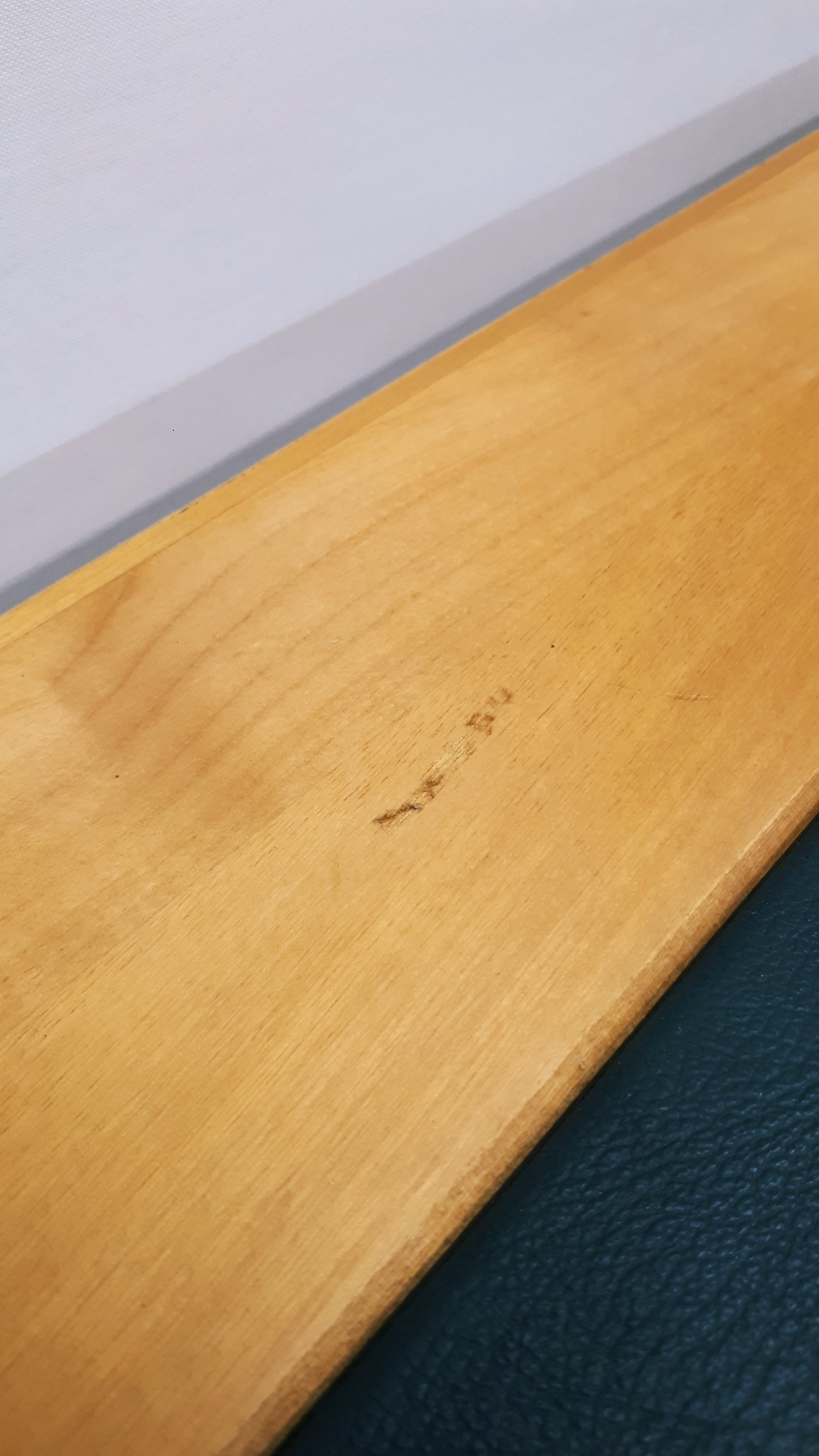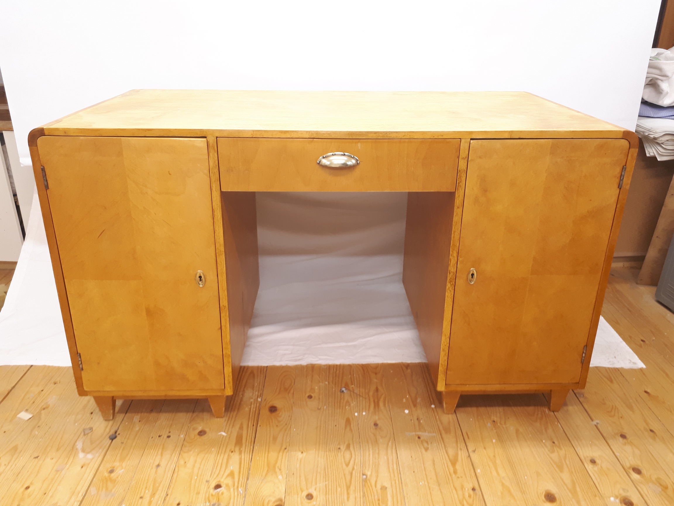 Laatikoston oikeassa sivussa on kapea, huomaamaton naarmu, Muutoin pöytä on erinomaisessa kunnossa. Kaikki pinnat on uusittu, laatikot puhdistettu sisältä ja liitokset tarkistettu.