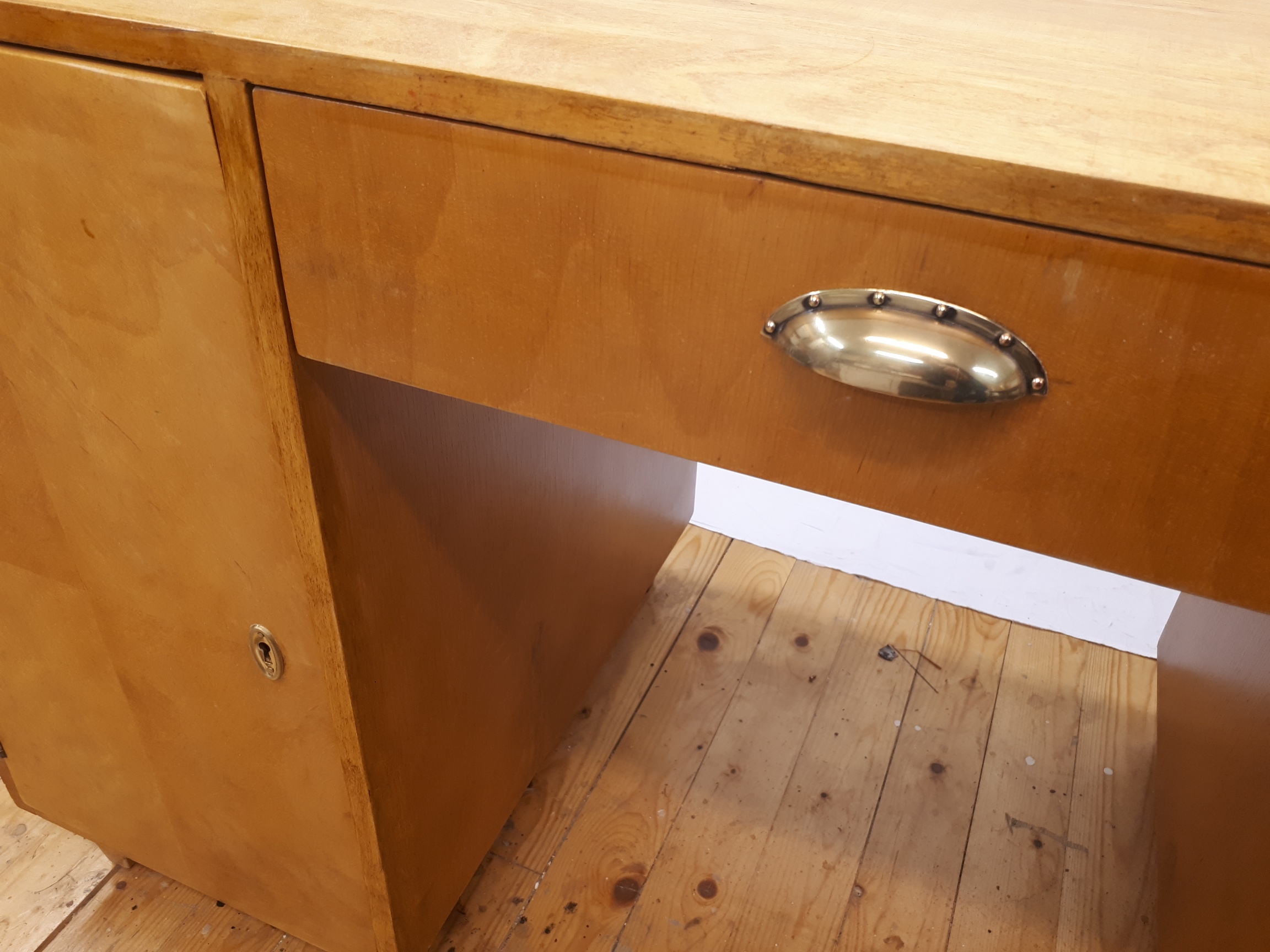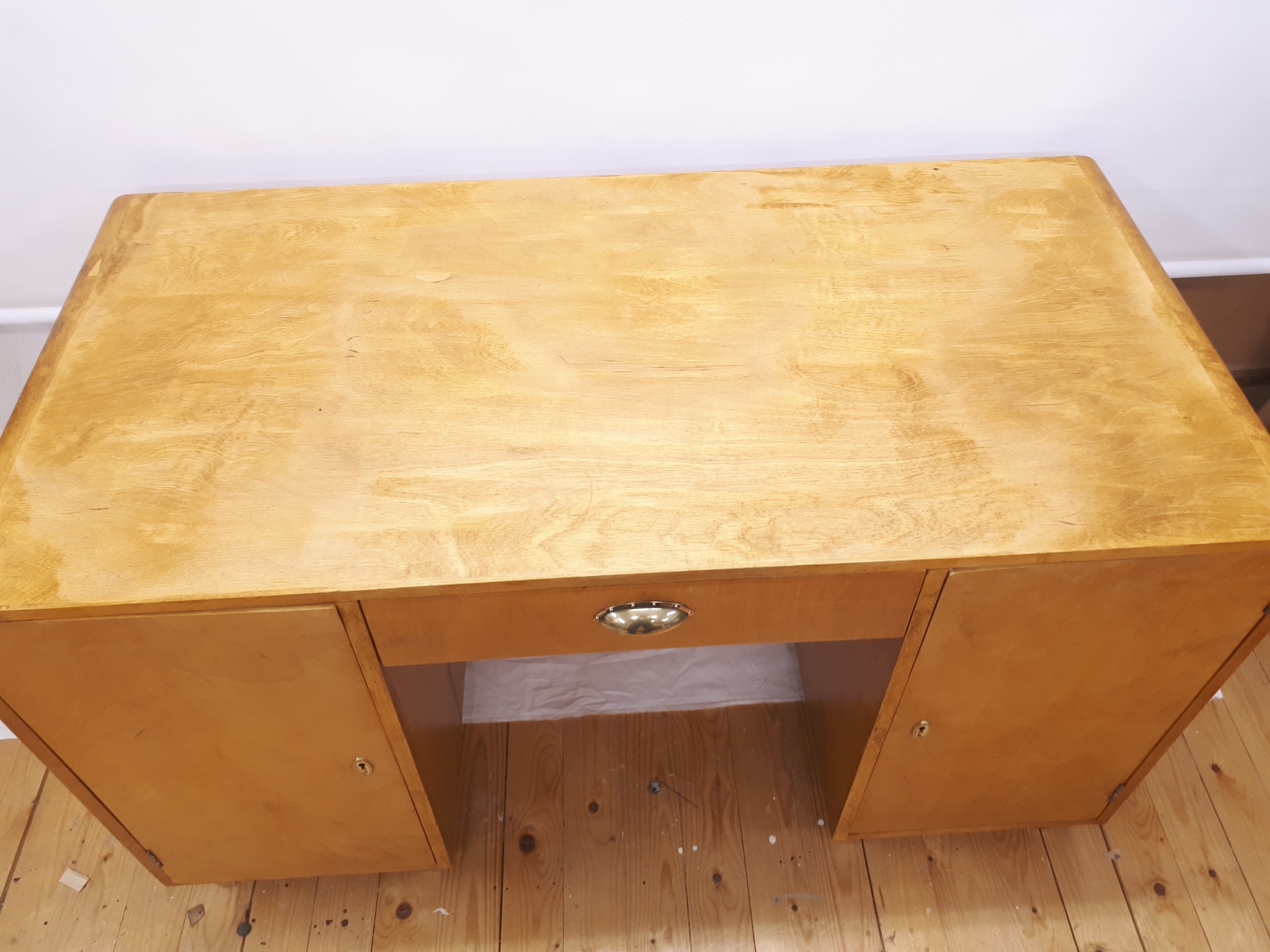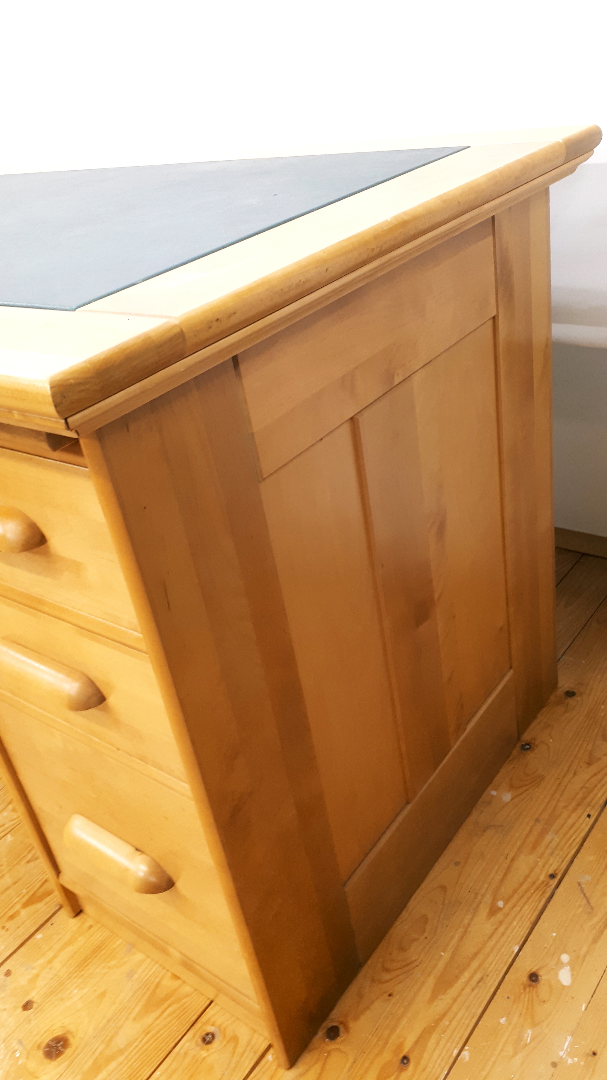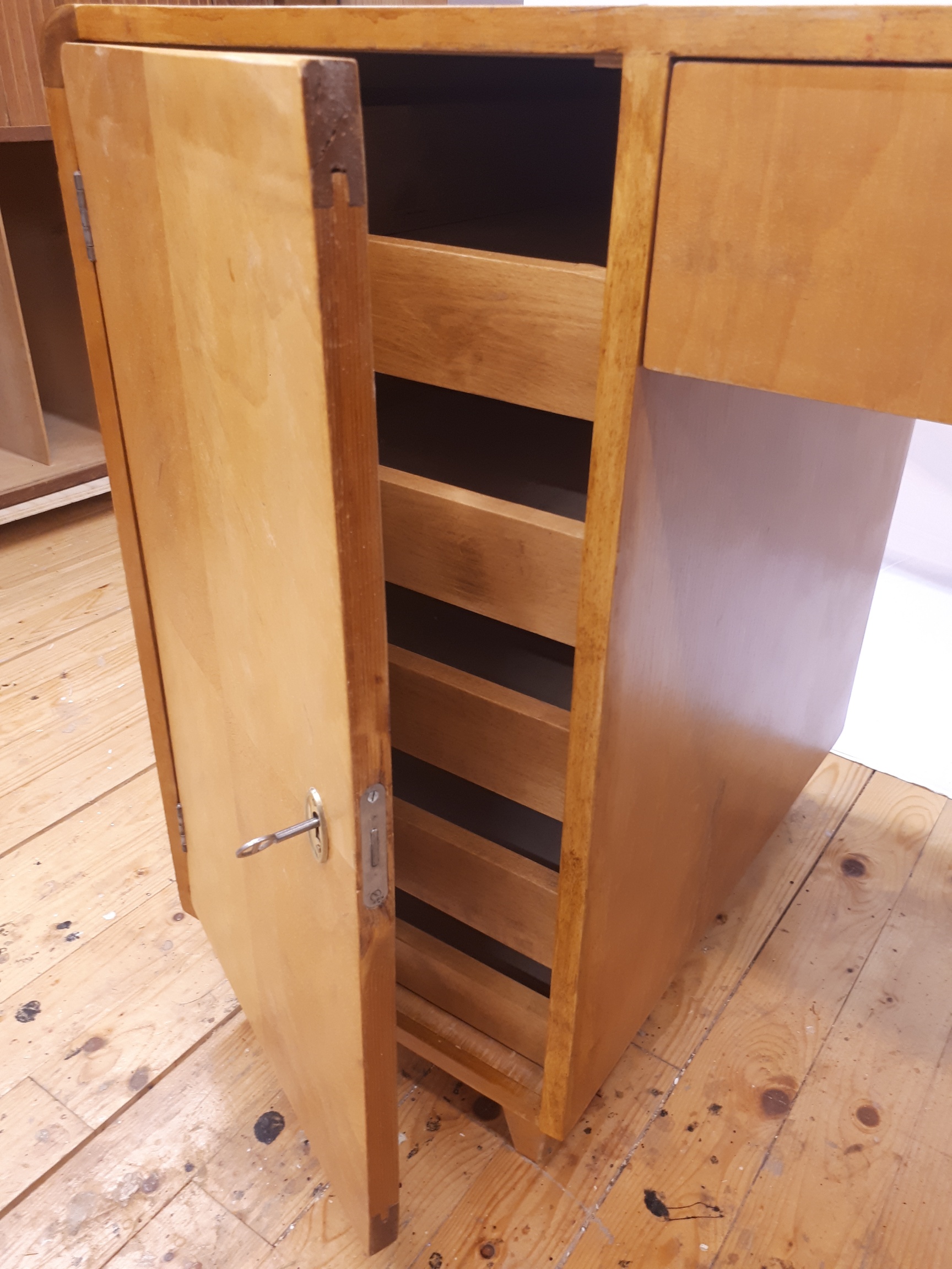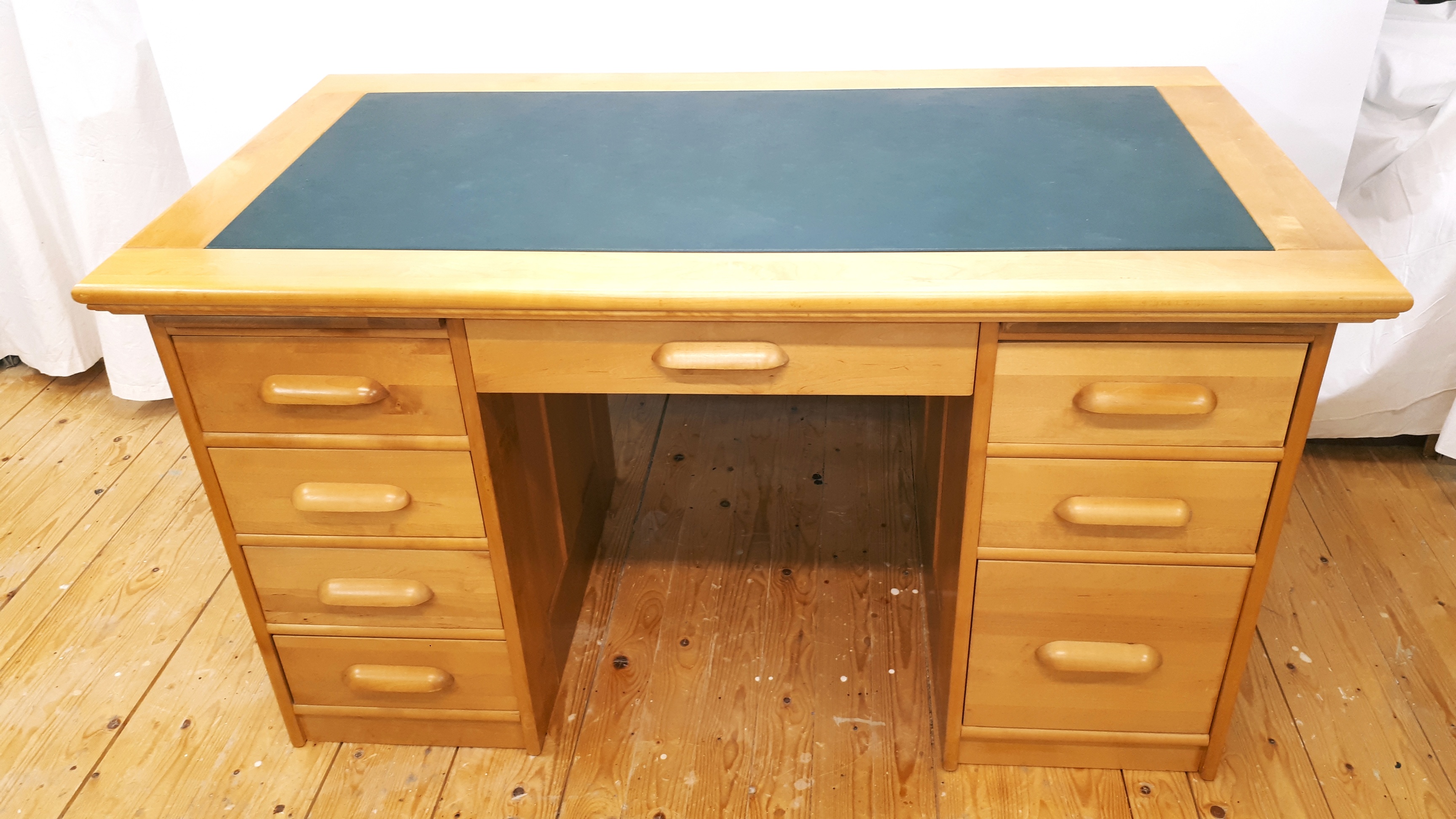 Laatikoston oikeassa sivussa on kapea, huomaamaton naarmu, Muutoin pöytä on erinomaisessa kunnossa. Kaikki pinnat on uusittu, laatikot puhdistettu sisältä ja liitokset tarkistettu.