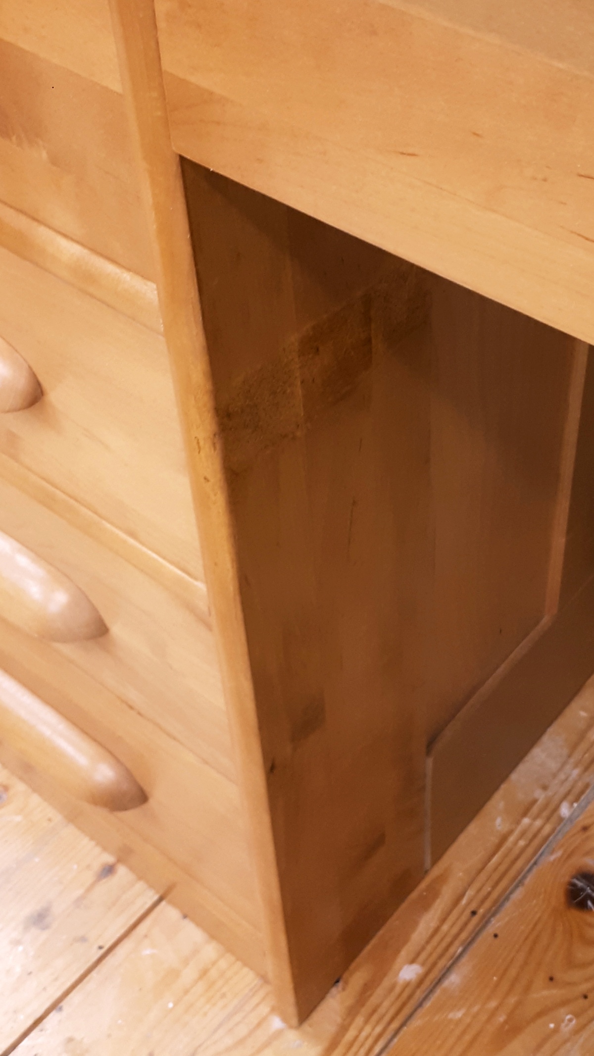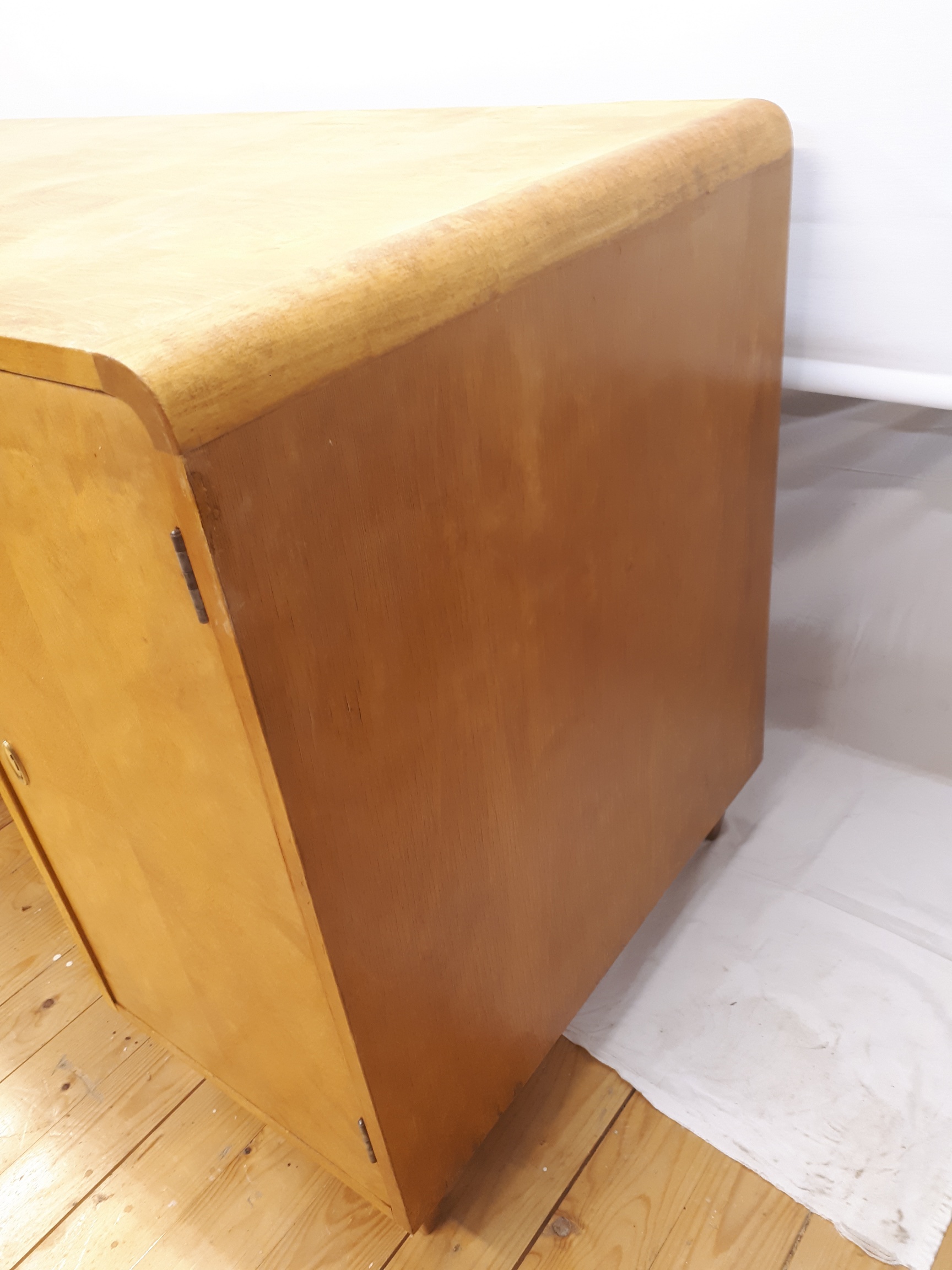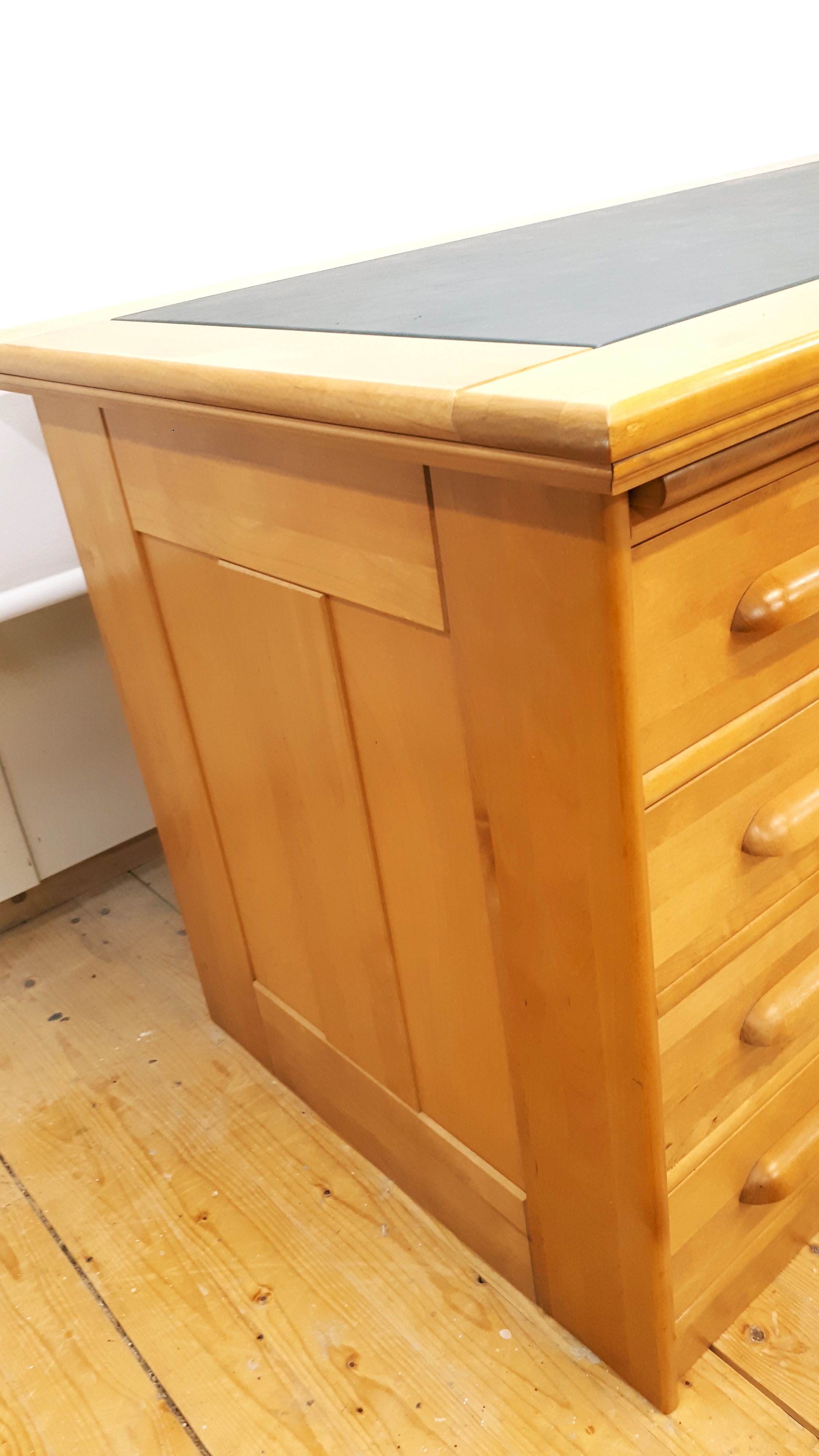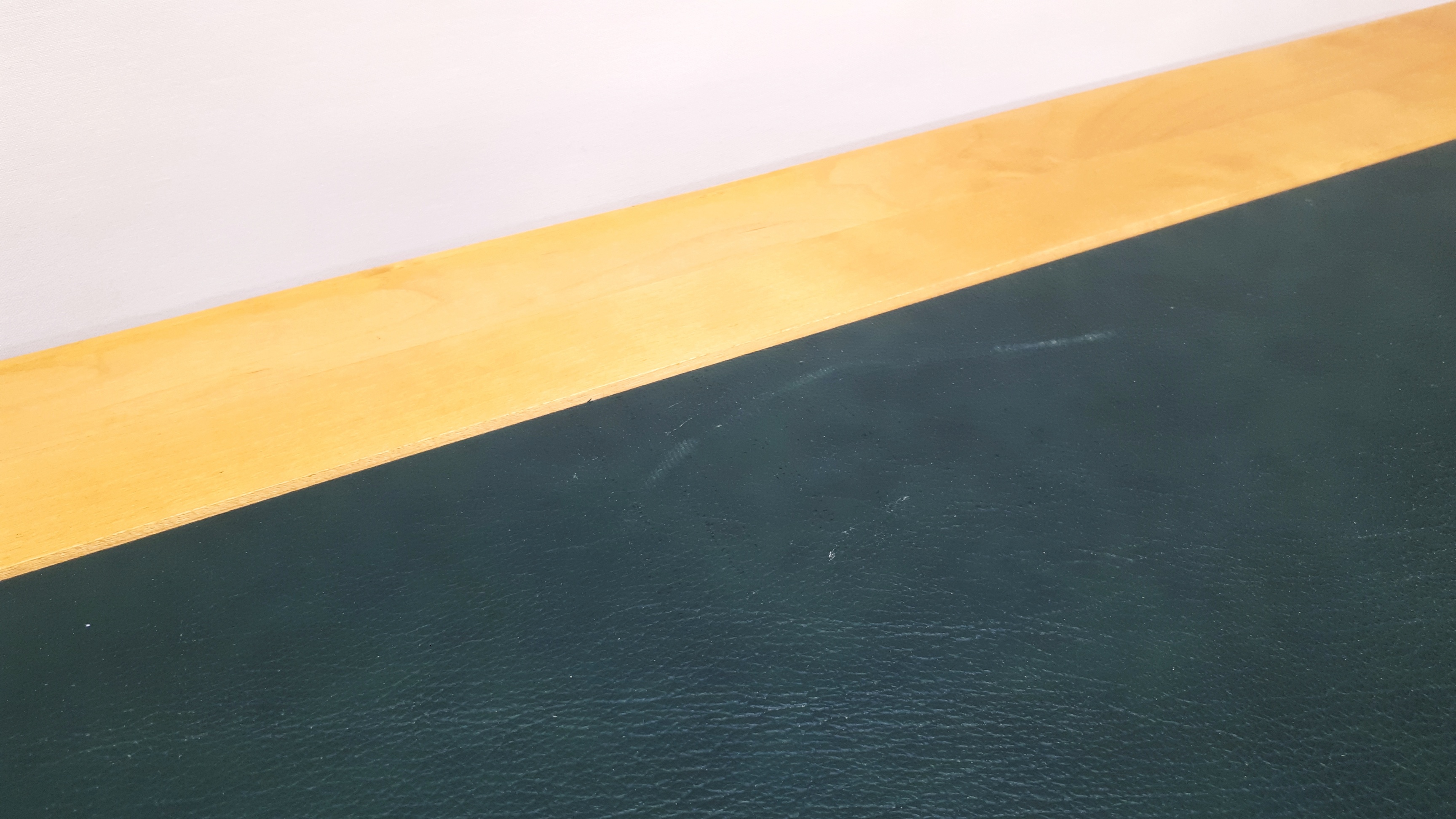 Laatikoston oikeassa sivussa on kapea, huomaamaton naarmu, Muutoin pöytä on erinomaisessa kunnossa. Kaikki pinnat on uusittu, laatikot puhdistettu sisältä ja liitokset tarkistettu.