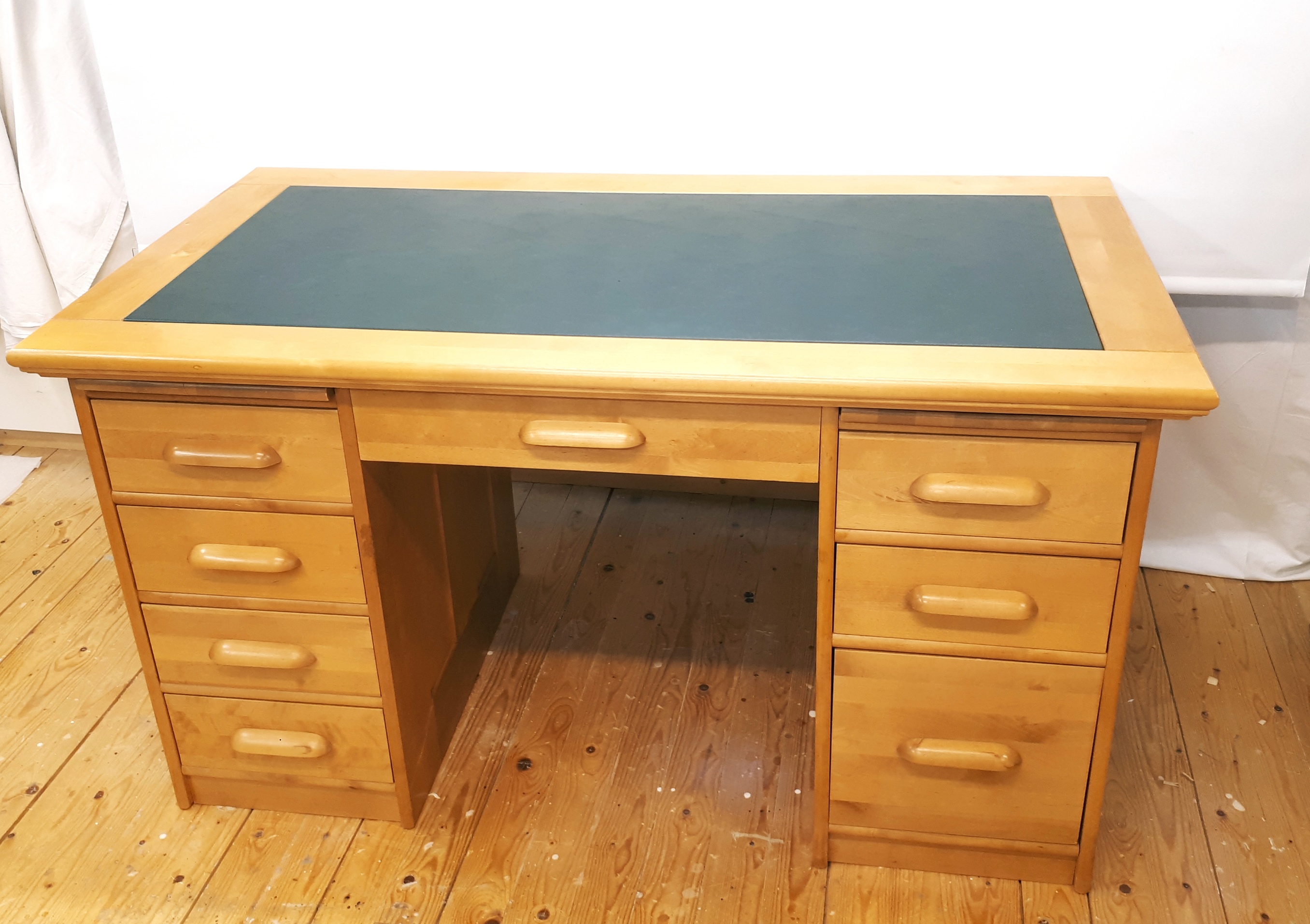 Täysin kunnostettu, pienikokoinen Billnäsin tammikirjoituspöytä 1950-60 -luvuilta. Pöydässä on kuusi vetolaatikkoa ja aukotettu lisätaso. Laatikoston etureunassa on Billnäsin tarra.