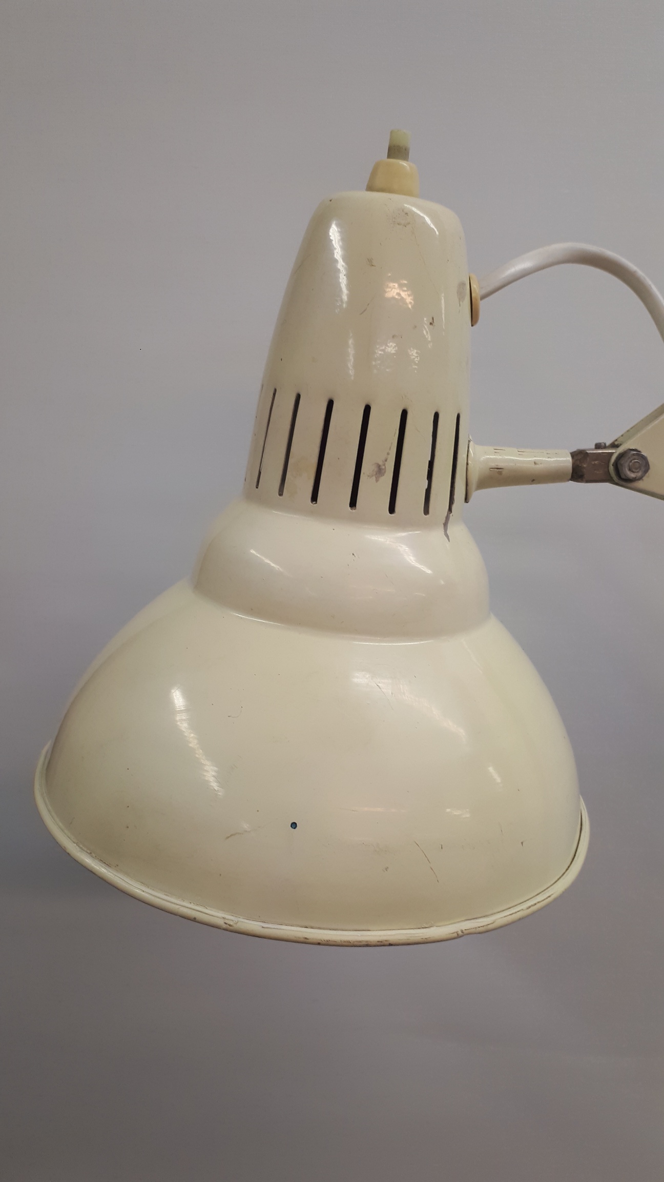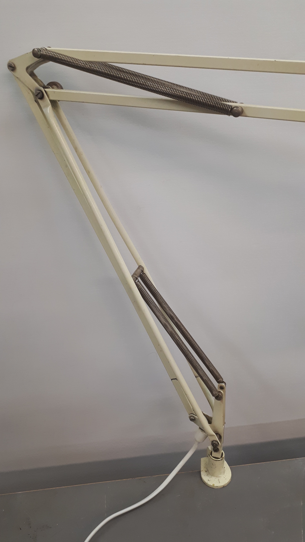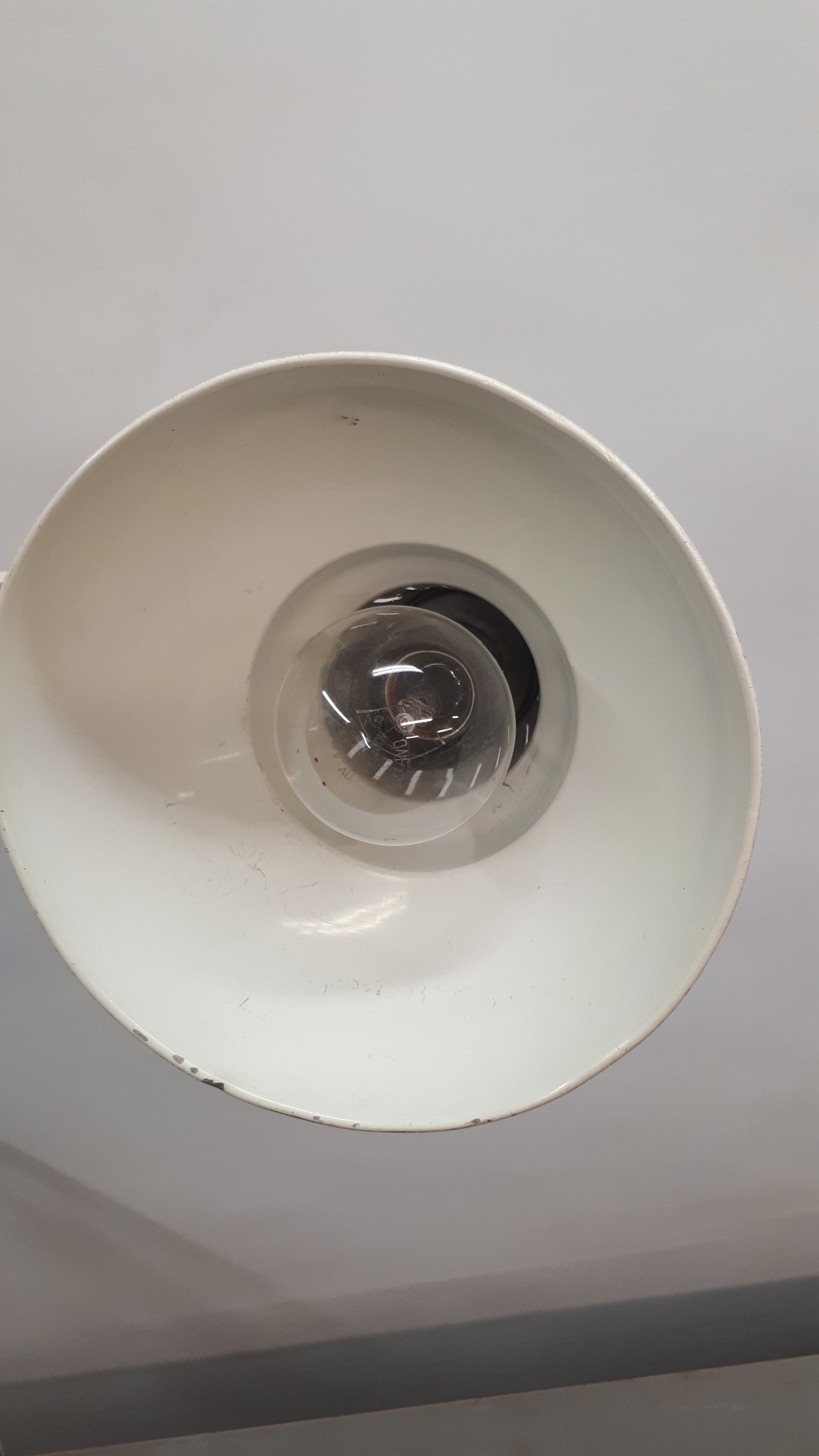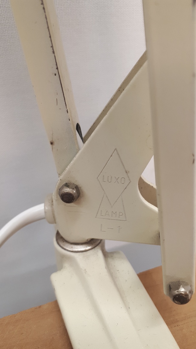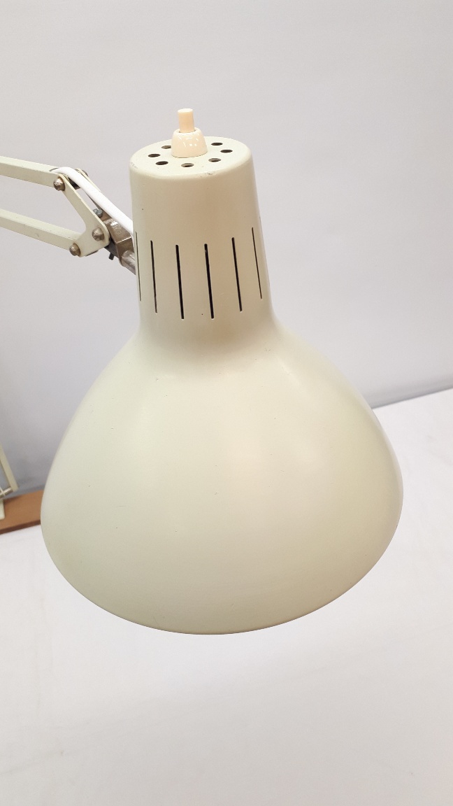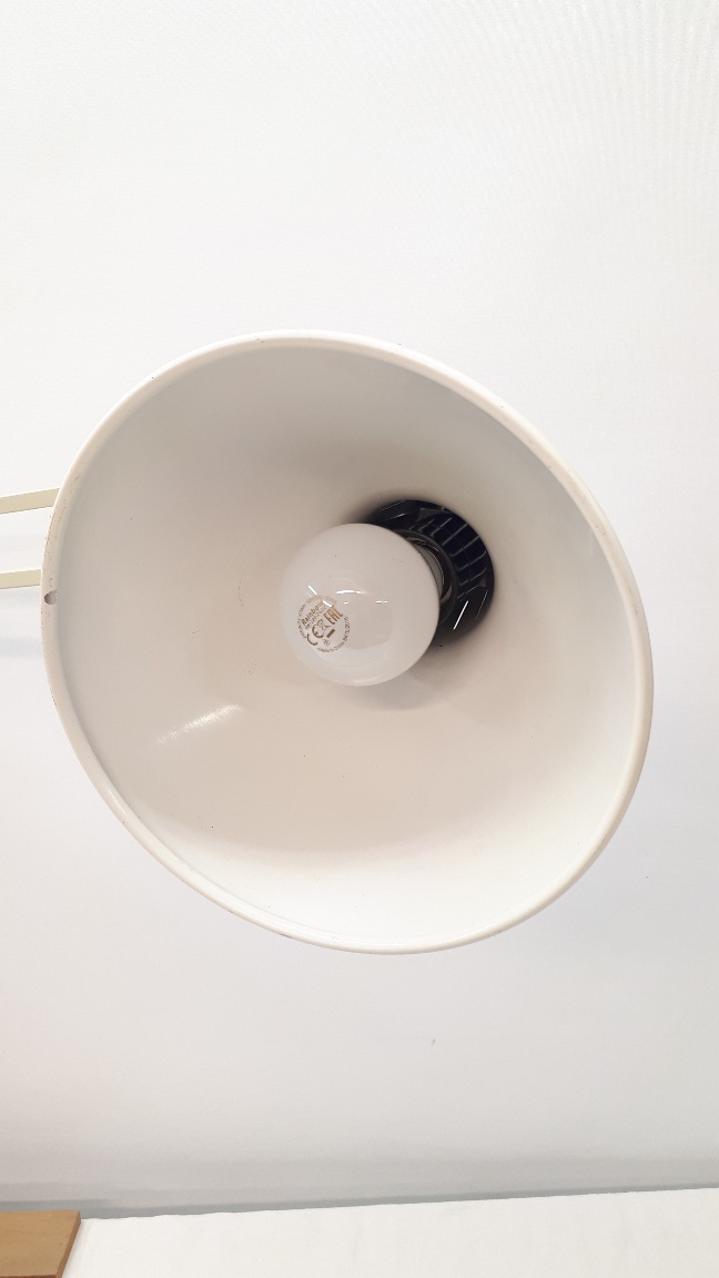 Valaisimen kolhuttoman kuvun värisävy on vaalea beige. Messinkijalustassa on joitakin matalia kolhuja. Valaisin syttyy ja sammuu katkaisijasta, kun se on kytkettynä sähköverkkoon. Alkuperäinen, maadottamaton pistotulppa.