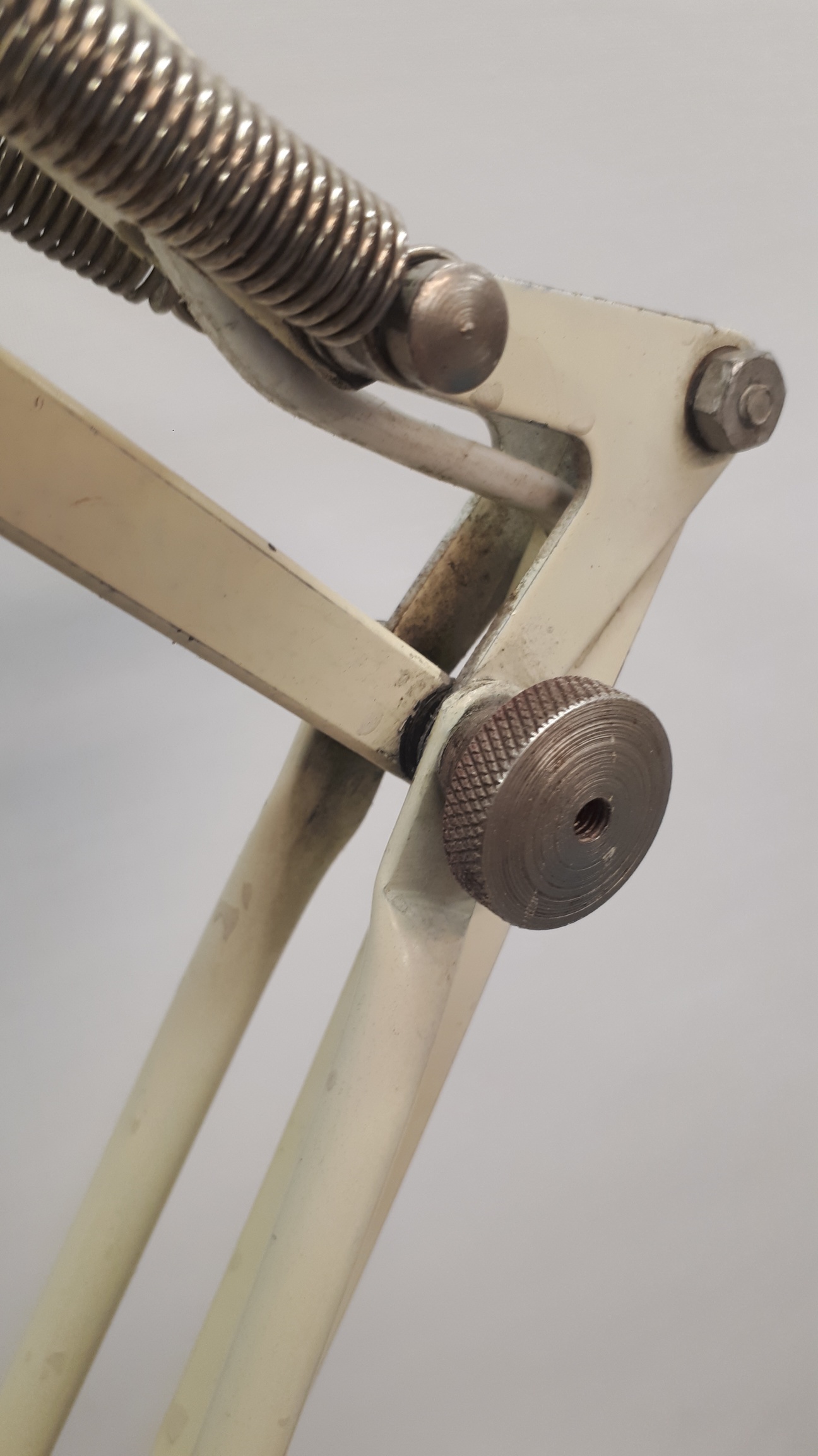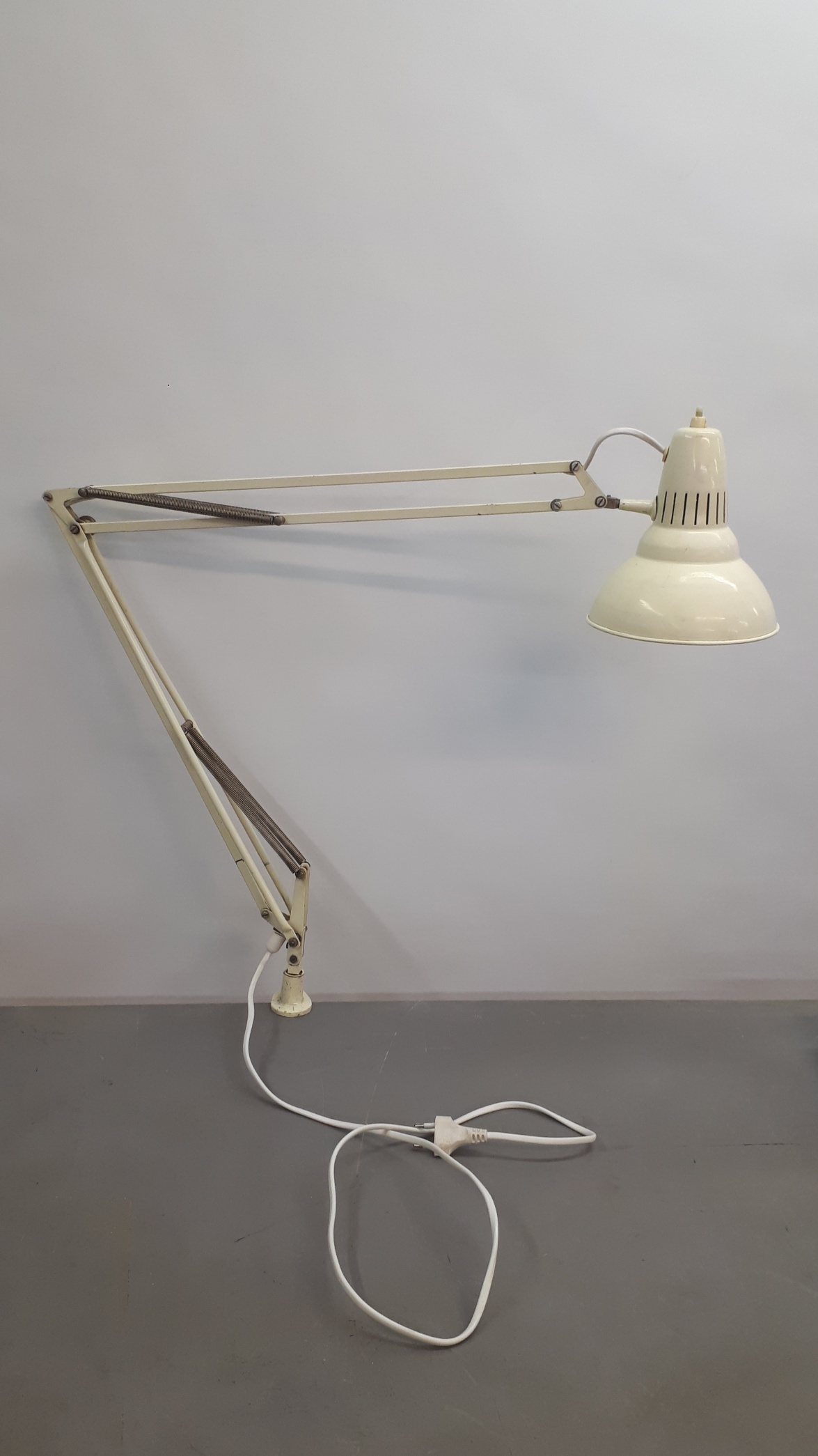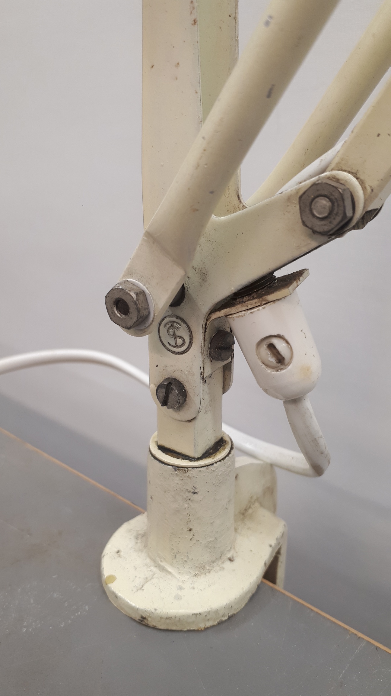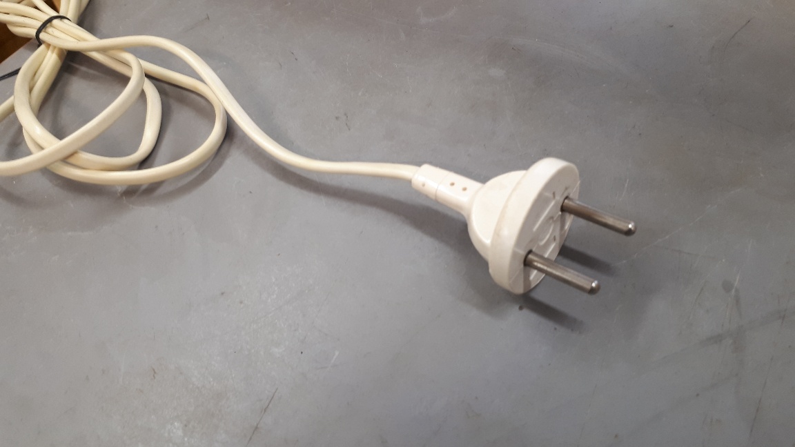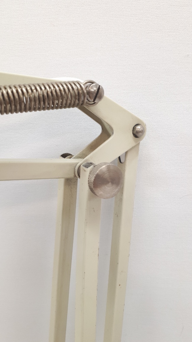 Valaisimen kolhuttoman kuvun värisävy on vaalea beige. Messinkijalustassa on joitakin matalia kolhuja. Valaisin syttyy ja sammuu katkaisijasta, kun se on kytkettynä sähköverkkoon. Alkuperäinen, maadottamaton pistotulppa.