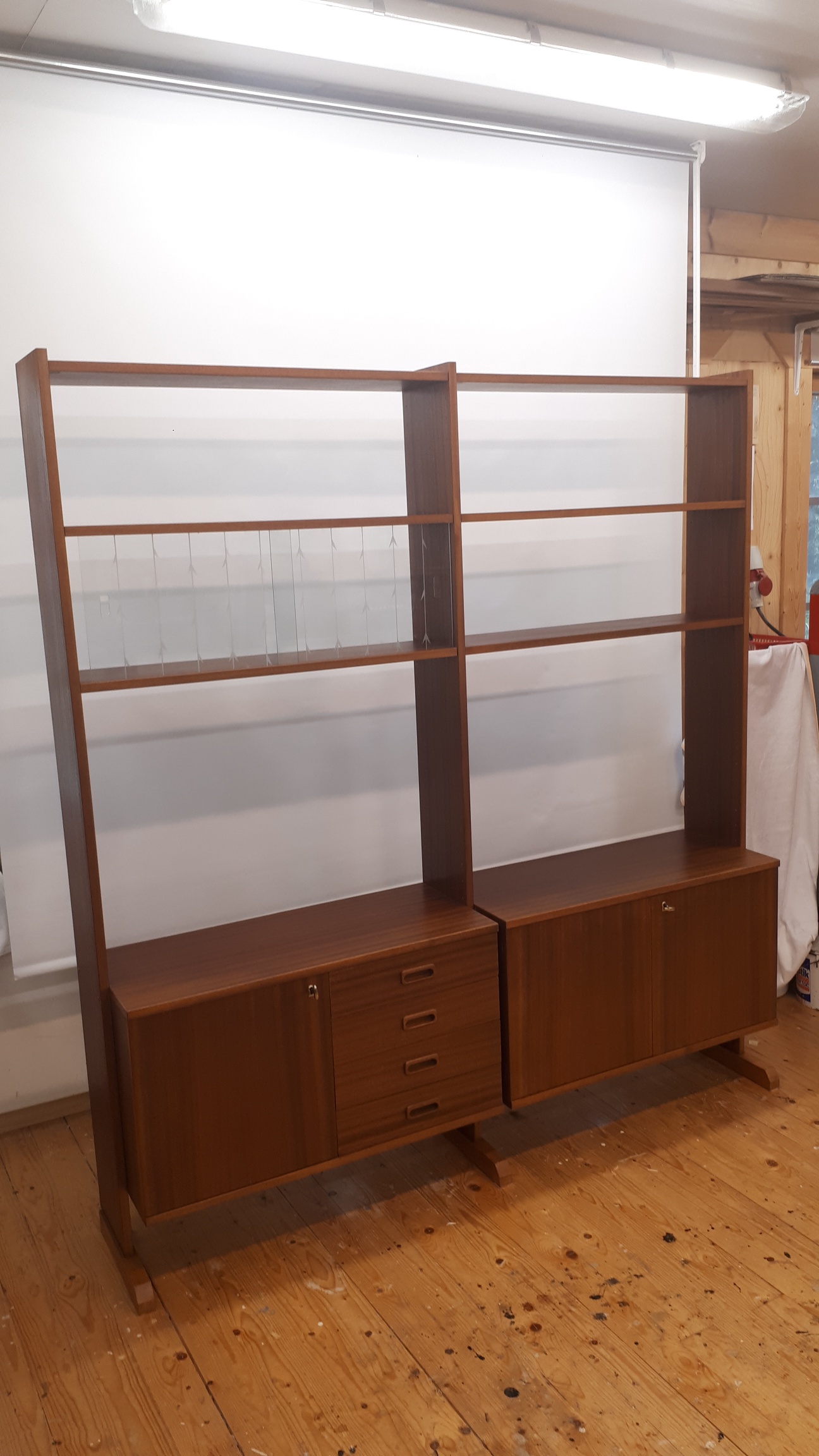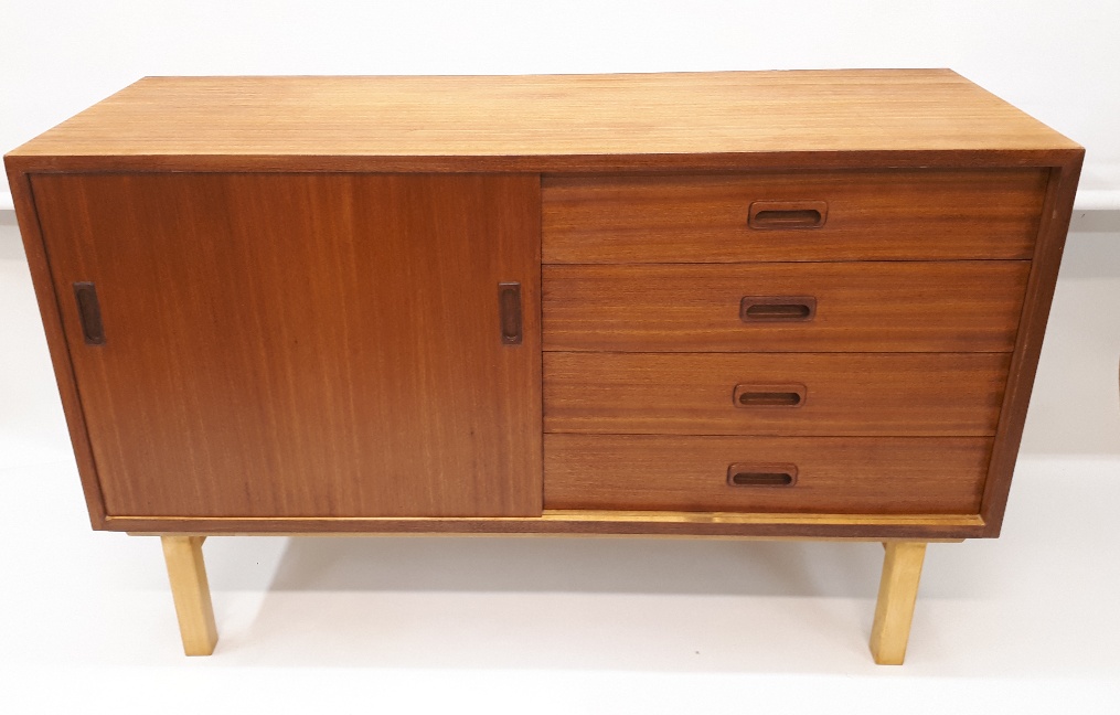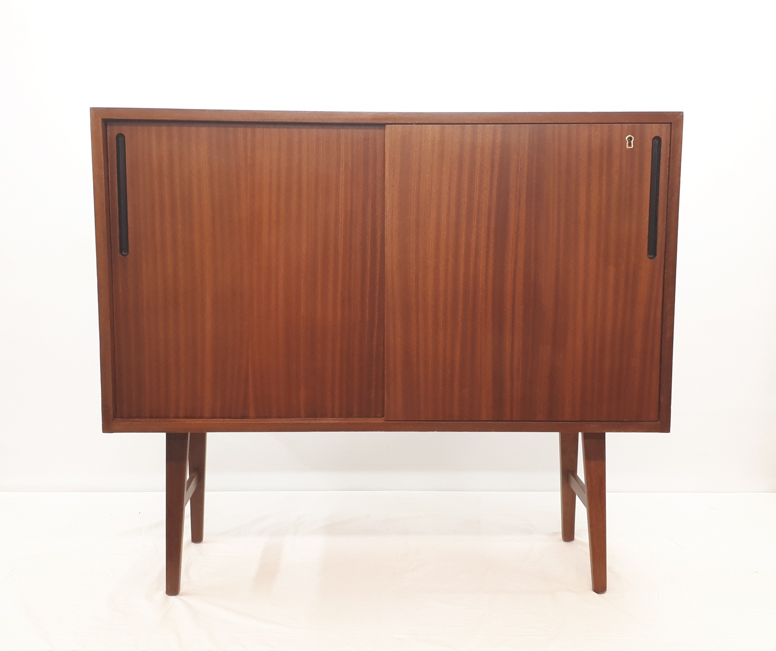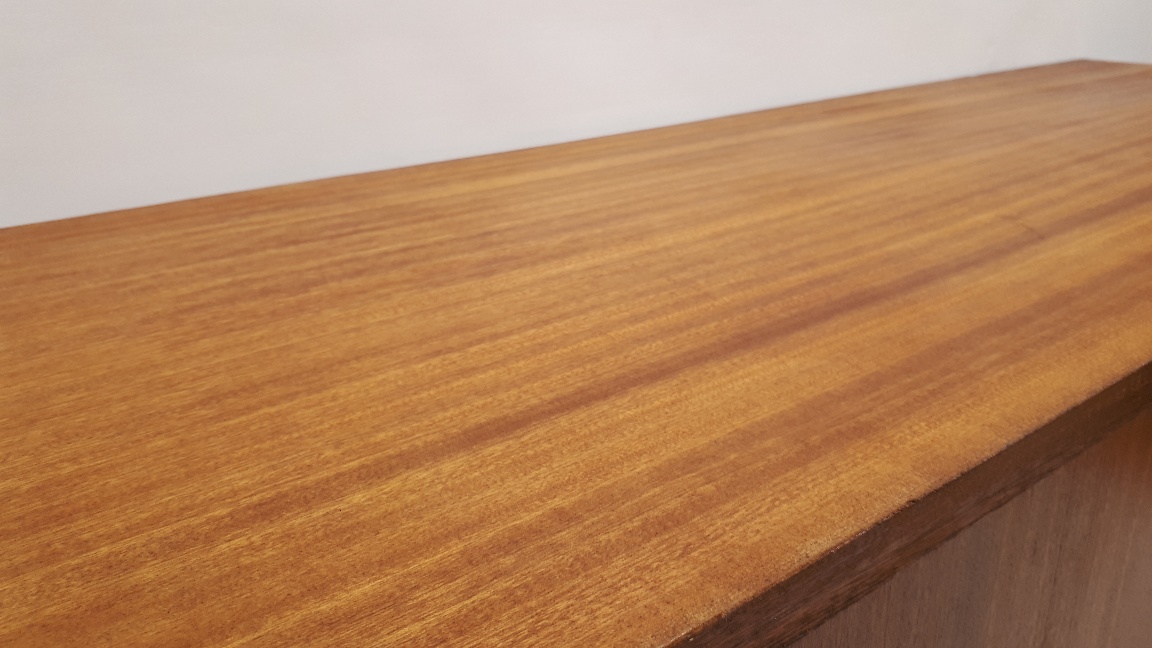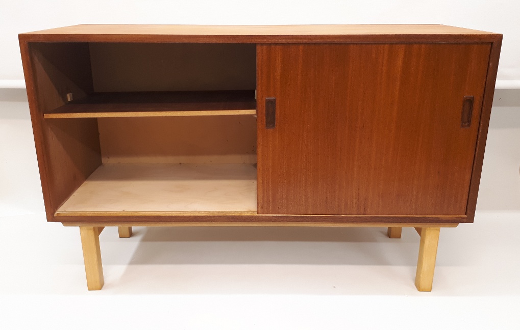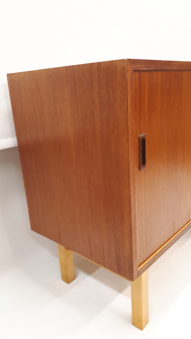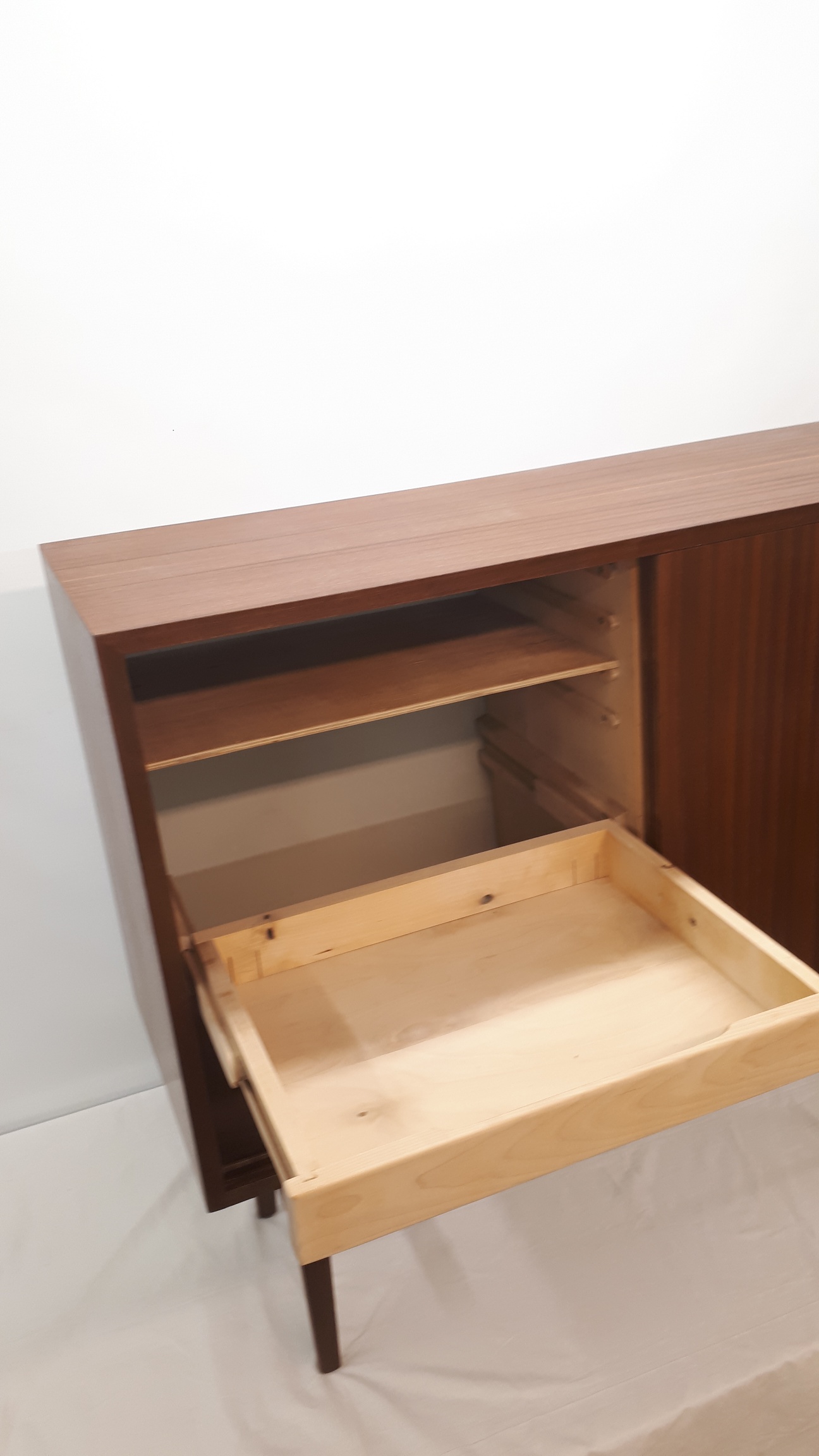 Kunnostettu liukuovellinen teak-senkki 60-luvun lopulta. Vasemmassa kaapissa on yhdeksän vetolaatikkoa ja oikeassa yksi hylly. Kaikki ulkopinnat on kunnostettu. Sisäpuolen näkyvät viilupinnat on öljytty. Kansi ja sivut ovat siistit ja ehjät. Vasemman liukuoven yläreunassa kahvan vieressä on korjattu kuluma (1x2cm) ja oikeassa ovessa on keskellä lähes huomaamaton tummentuma. Molemmista ovenkahvoista puuttuu alakulmista pieni pala (1x1mm). Mustat, kunnostetut metallijalat. Lukko toimii ja lukkoon on avain.