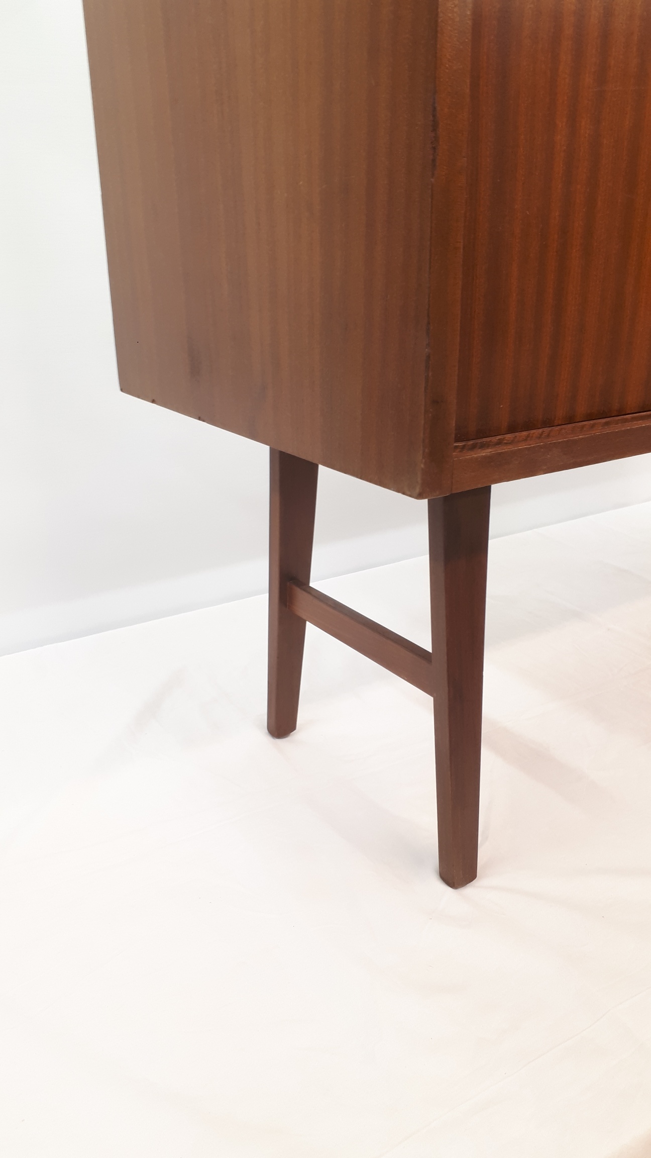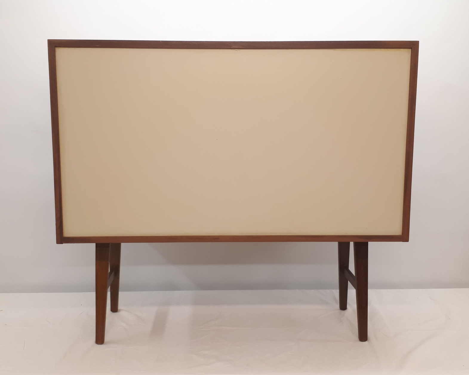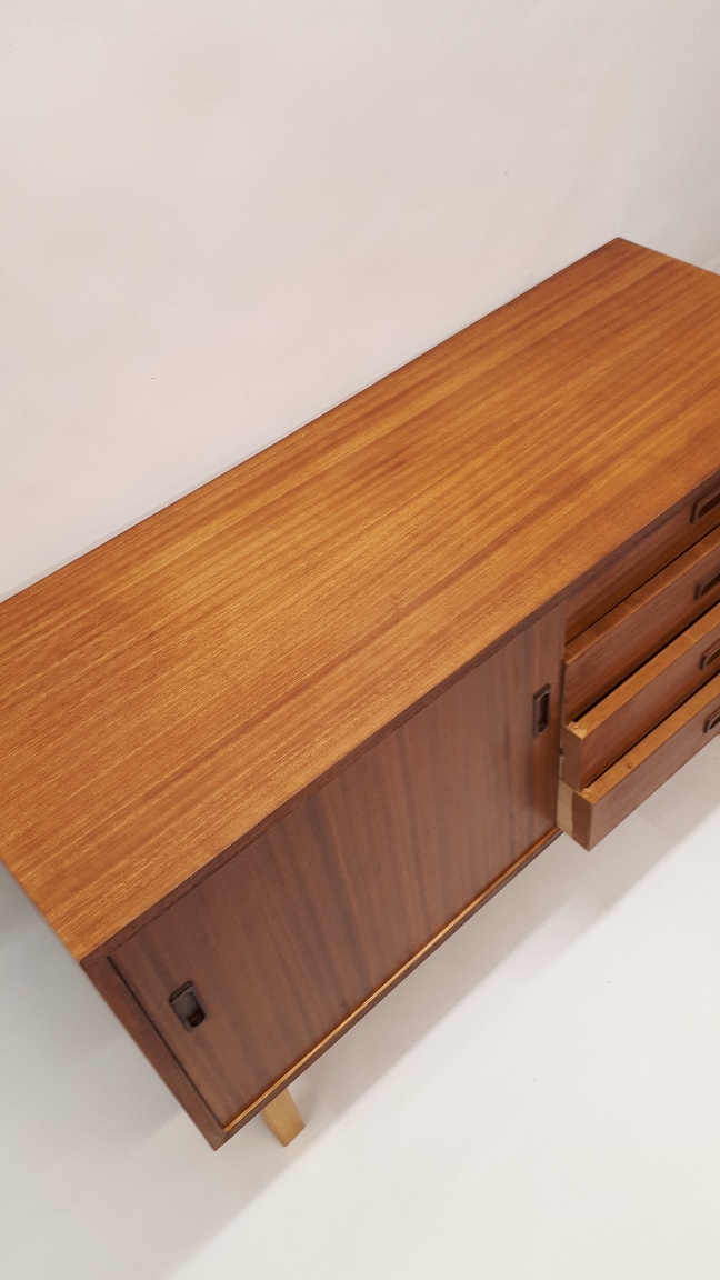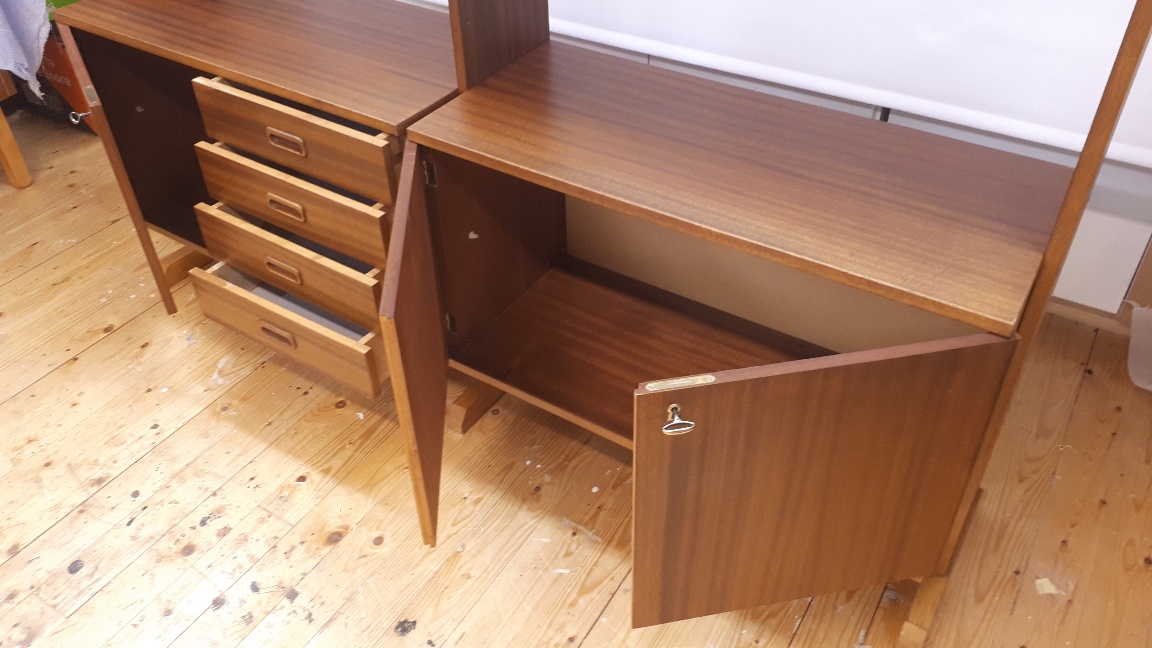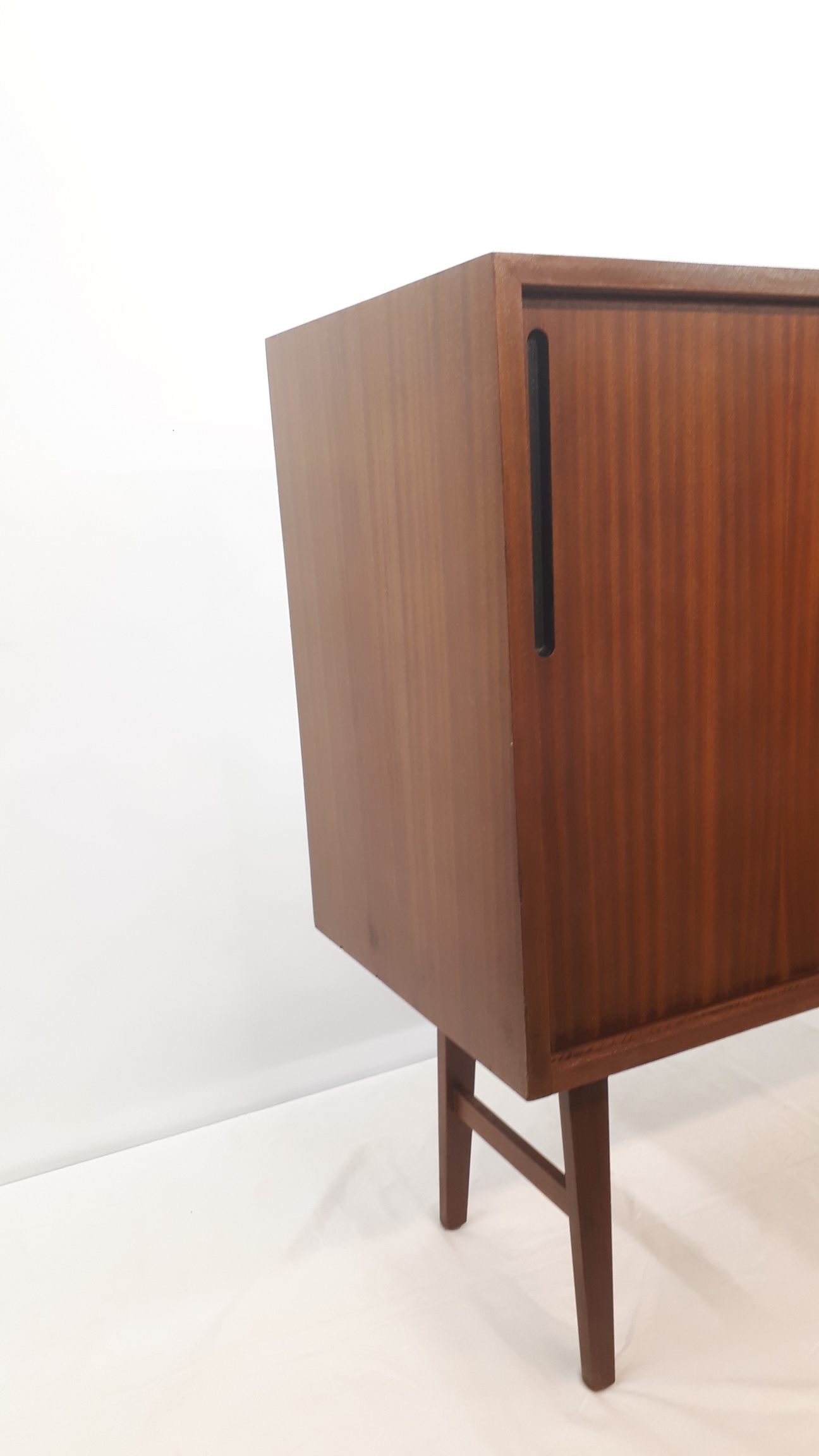 Kunnostettu liukuovellinen teak-senkki 60-luvun lopulta. Vasemmassa kaapissa on yhdeksän vetolaatikkoa ja oikeassa yksi hylly. Kaikki ulkopinnat on kunnostettu. Sisäpuolen näkyvät viilupinnat on öljytty. Kansi ja sivut ovat siistit ja ehjät. Vasemman liukuoven yläreunassa kahvan vieressä on korjattu kuluma (1x2cm) ja oikeassa ovessa on keskellä lähes huomaamaton tummentuma. Molemmista ovenkahvoista puuttuu alakulmista pieni pala (1x1mm). Mustat, kunnostetut metallijalat. Lukko toimii ja lukkoon on avain.