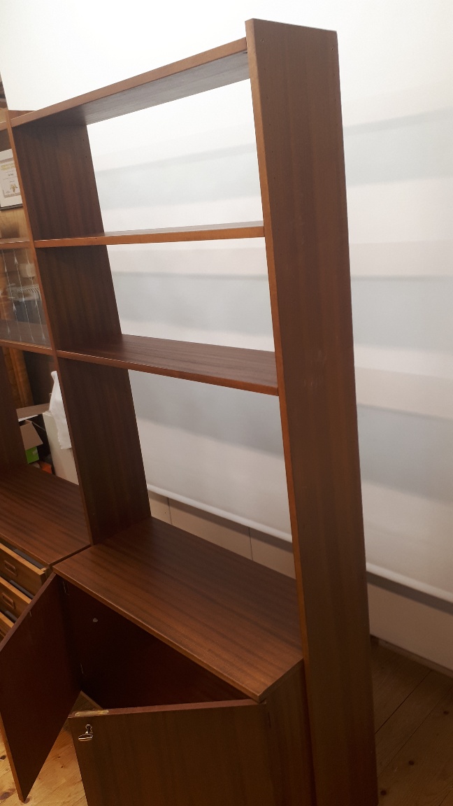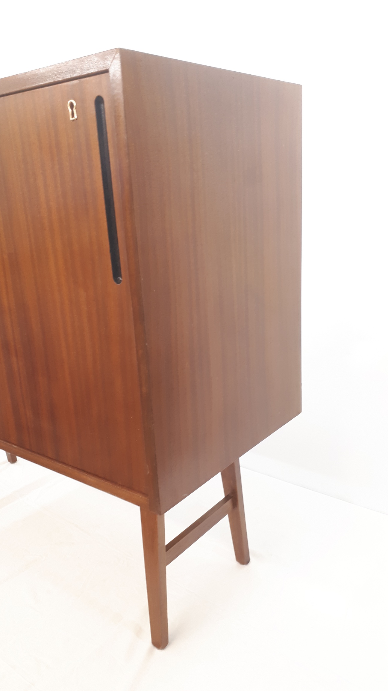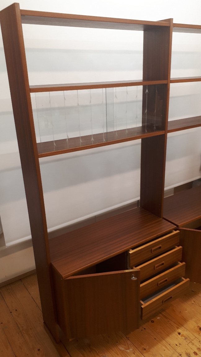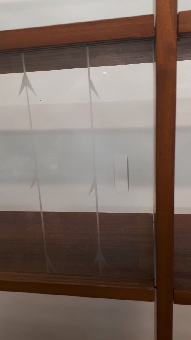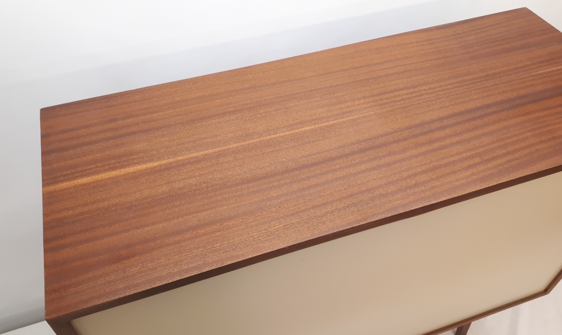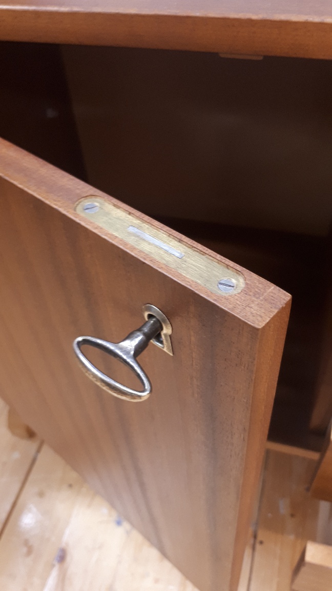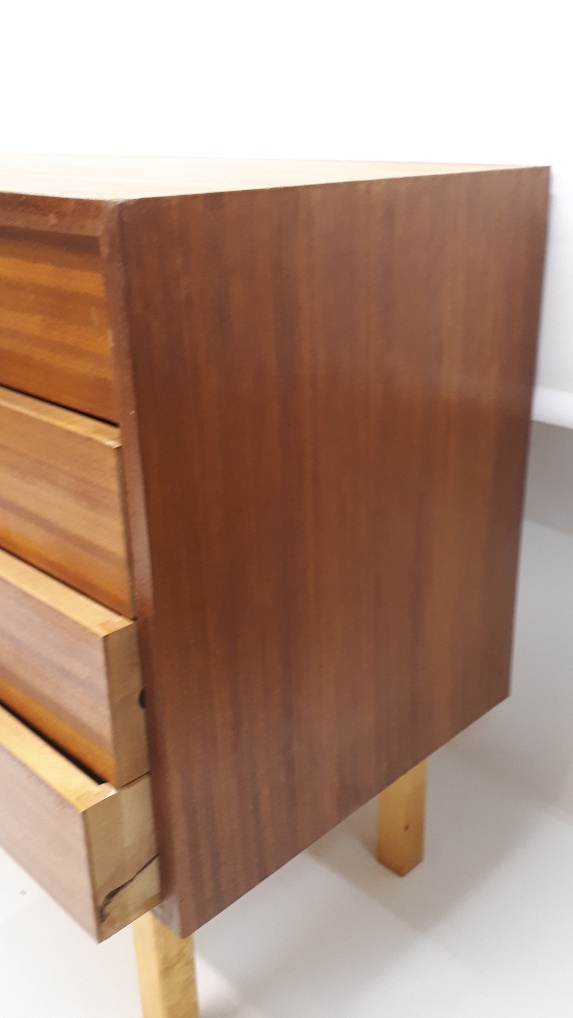 Kunnostettu liukuovellinen teak-senkki 60-luvun lopulta. Vasemmassa kaapissa on yhdeksän vetolaatikkoa ja oikeassa yksi hylly. Kaikki ulkopinnat on kunnostettu. Sisäpuolen näkyvät viilupinnat on öljytty. Kansi ja sivut ovat siistit ja ehjät. Vasemman liukuoven yläreunassa kahvan vieressä on korjattu kuluma (1x2cm) ja oikeassa ovessa on keskellä lähes huomaamaton tummentuma. Molemmista ovenkahvoista puuttuu alakulmista pieni pala (1x1mm). Mustat, kunnostetut metallijalat. Lukko toimii ja lukkoon on avain.