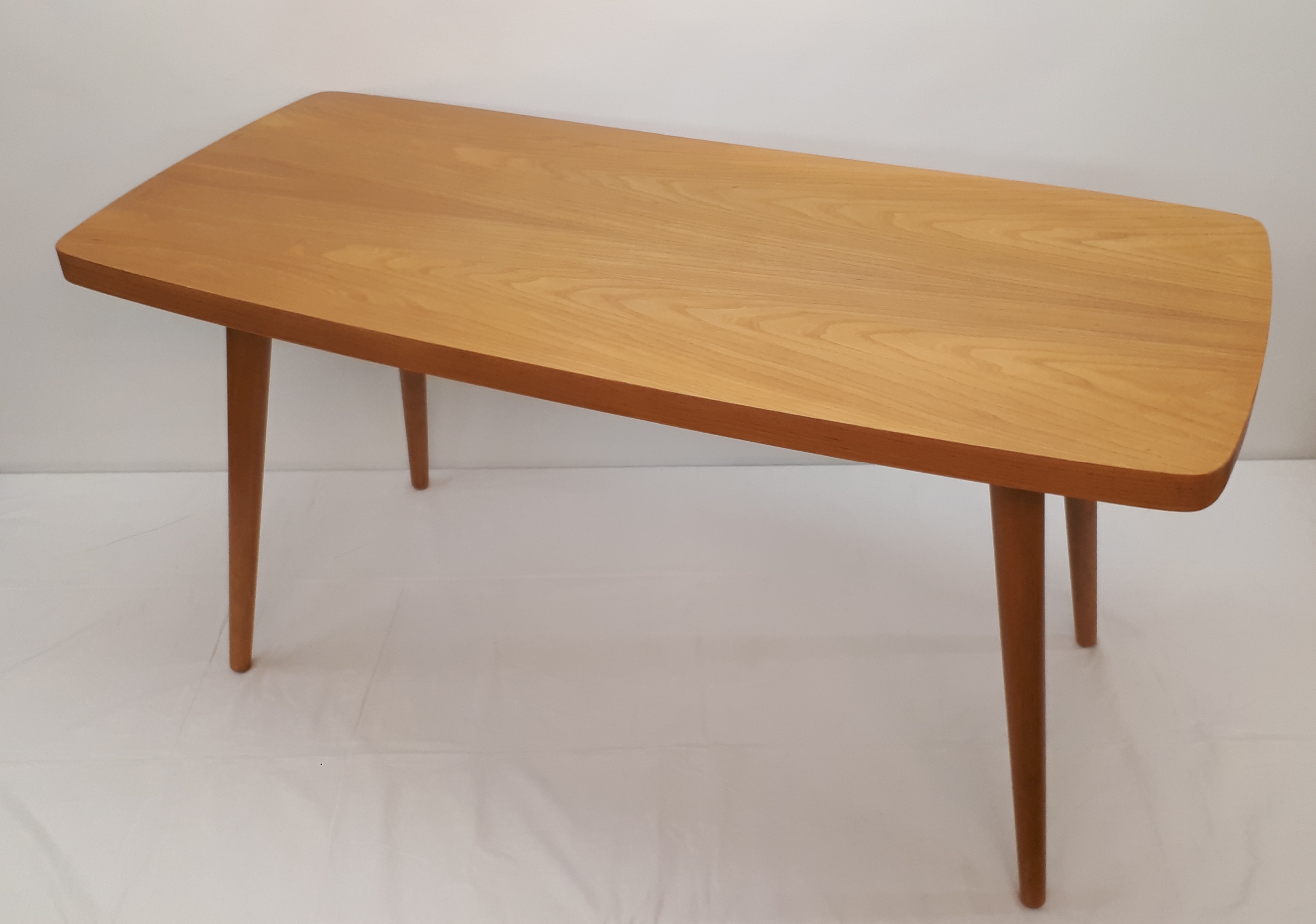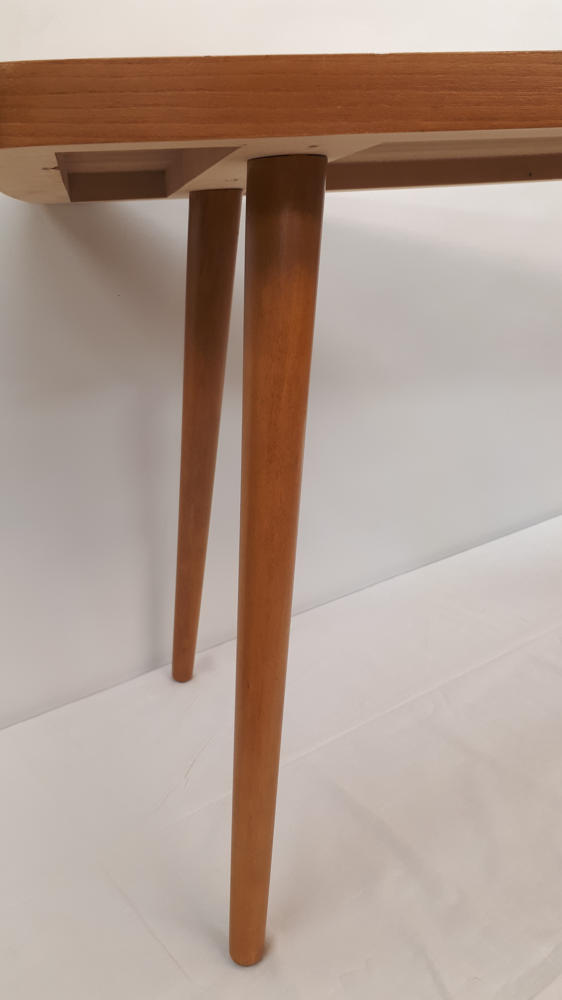 Laatikoston oikeassa sivussa on kapea, huomaamaton naarmu, Muutoin pöytä on erinomaisessa kunnossa. Kaikki pinnat on uusittu, laatikot puhdistettu sisältä ja liitokset tarkistettu.