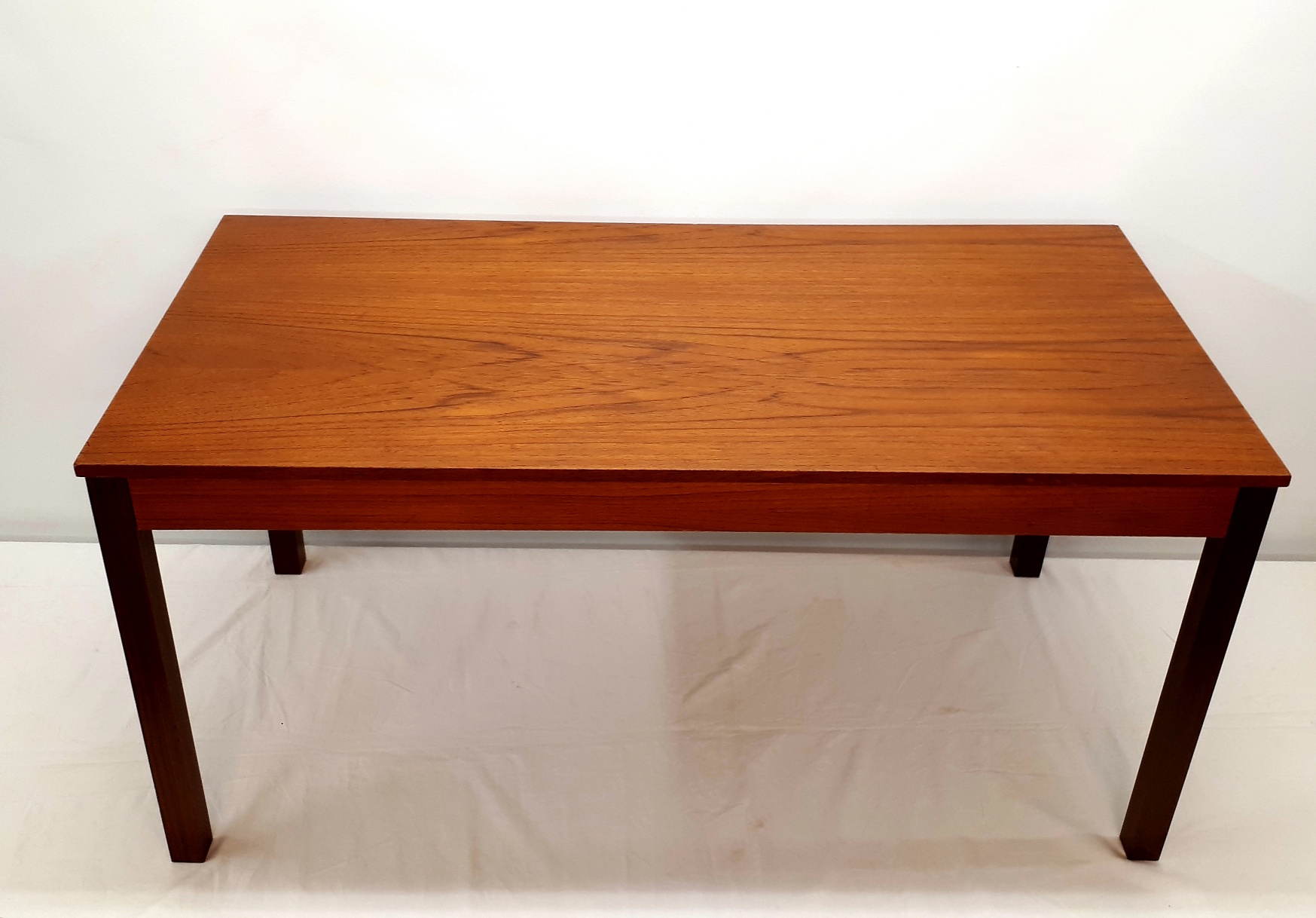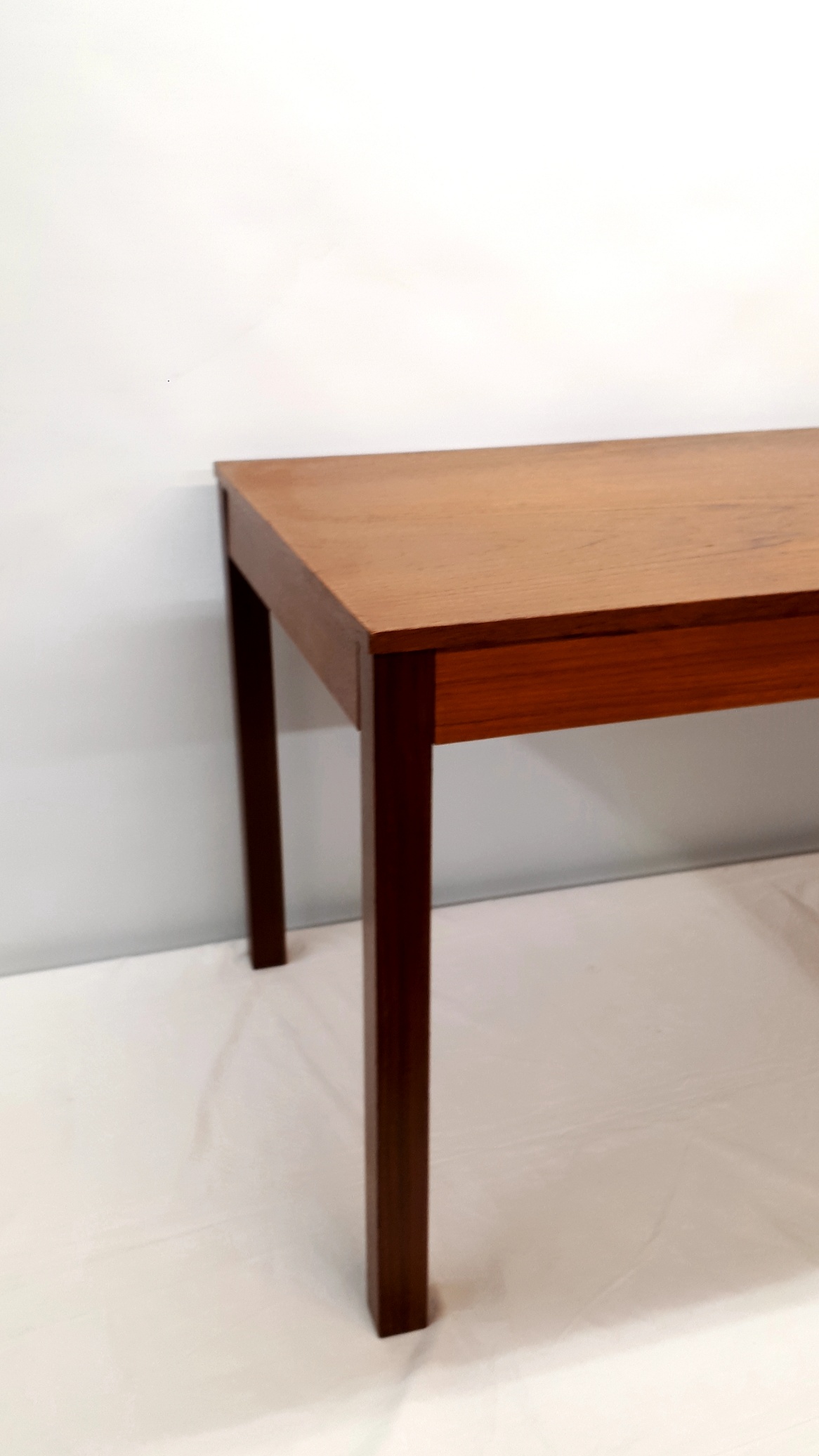 Erittäin hyväkuntoinen jatkettava Haimi Oy:n tiikkipöytä 1960-luvulta. Pöydän tiikkipinnassa ei ole patinaa, naarmuja, kulumia tai kolhuja. Pinnassa on yksi pieni tummentuma, muutoin pöytä lähes uutta vastaavassa kunnossa. 45cm leveä jatkopala on virheetön ja sen messinkisaranoitu mekanismi toimii moitteettomasti. Näyttävissä tiikkijaloissa on pähkinäpuiset ”tassut”.